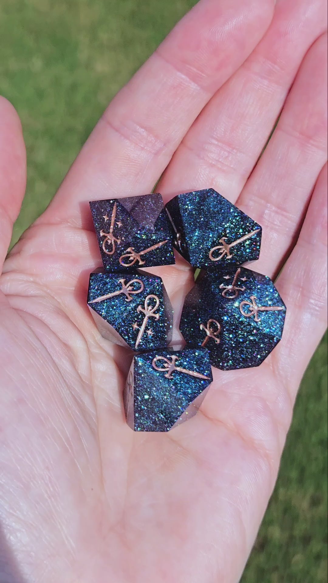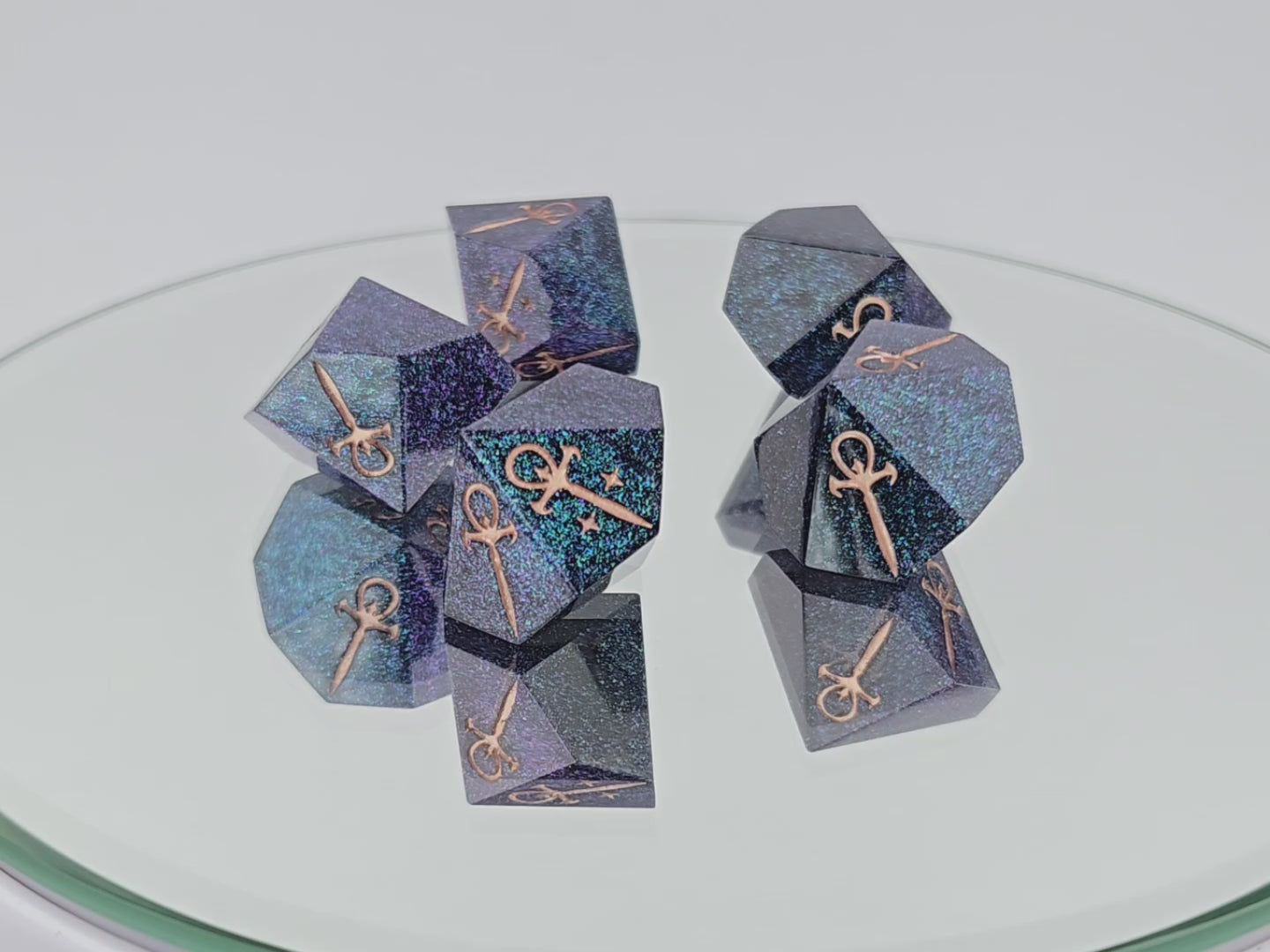 A set of 5 d10s with the ankh and star symbols for use in Vampire the Masquerade loaded with teal/purple colorshift sparkles and rose gold numbers.