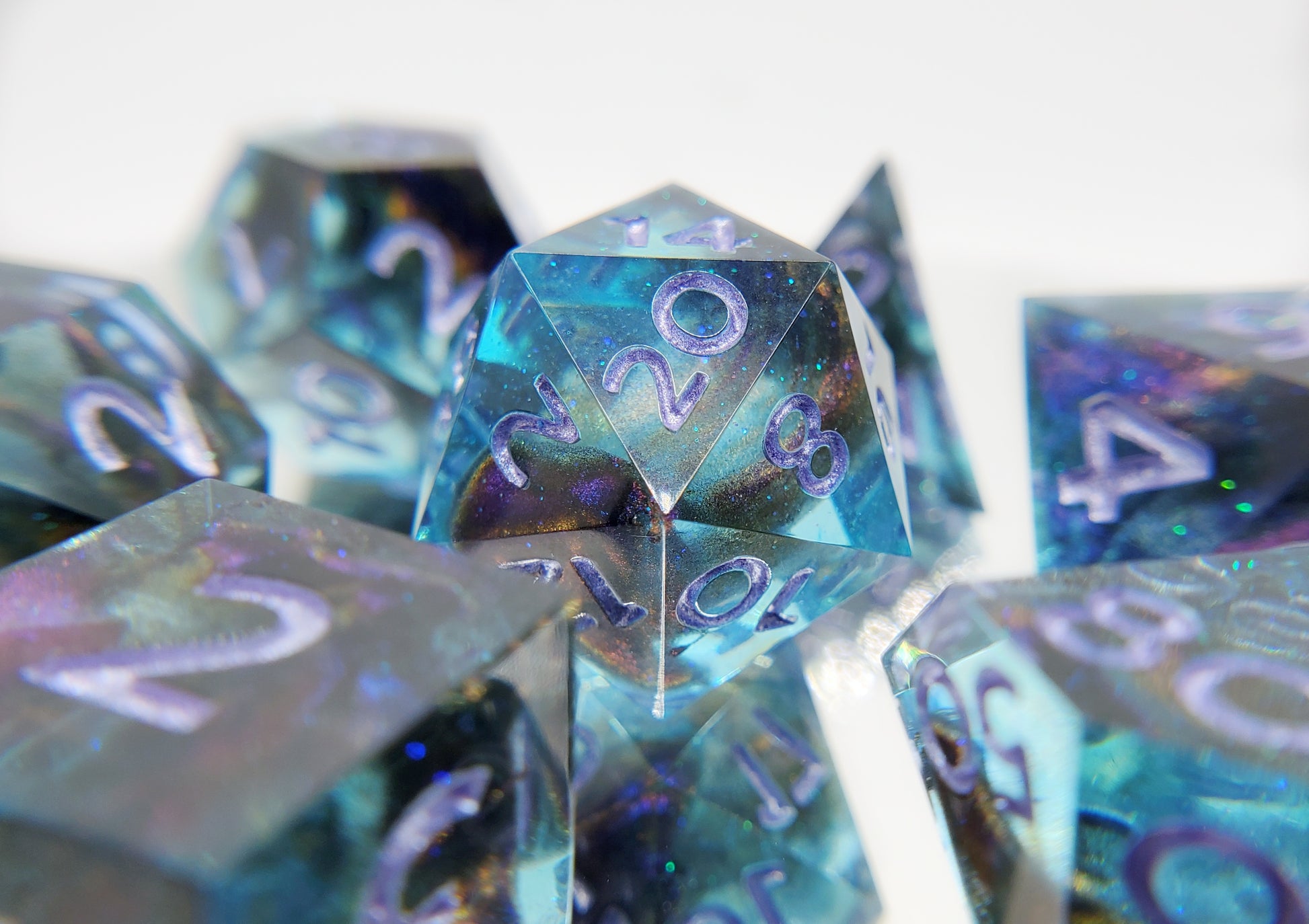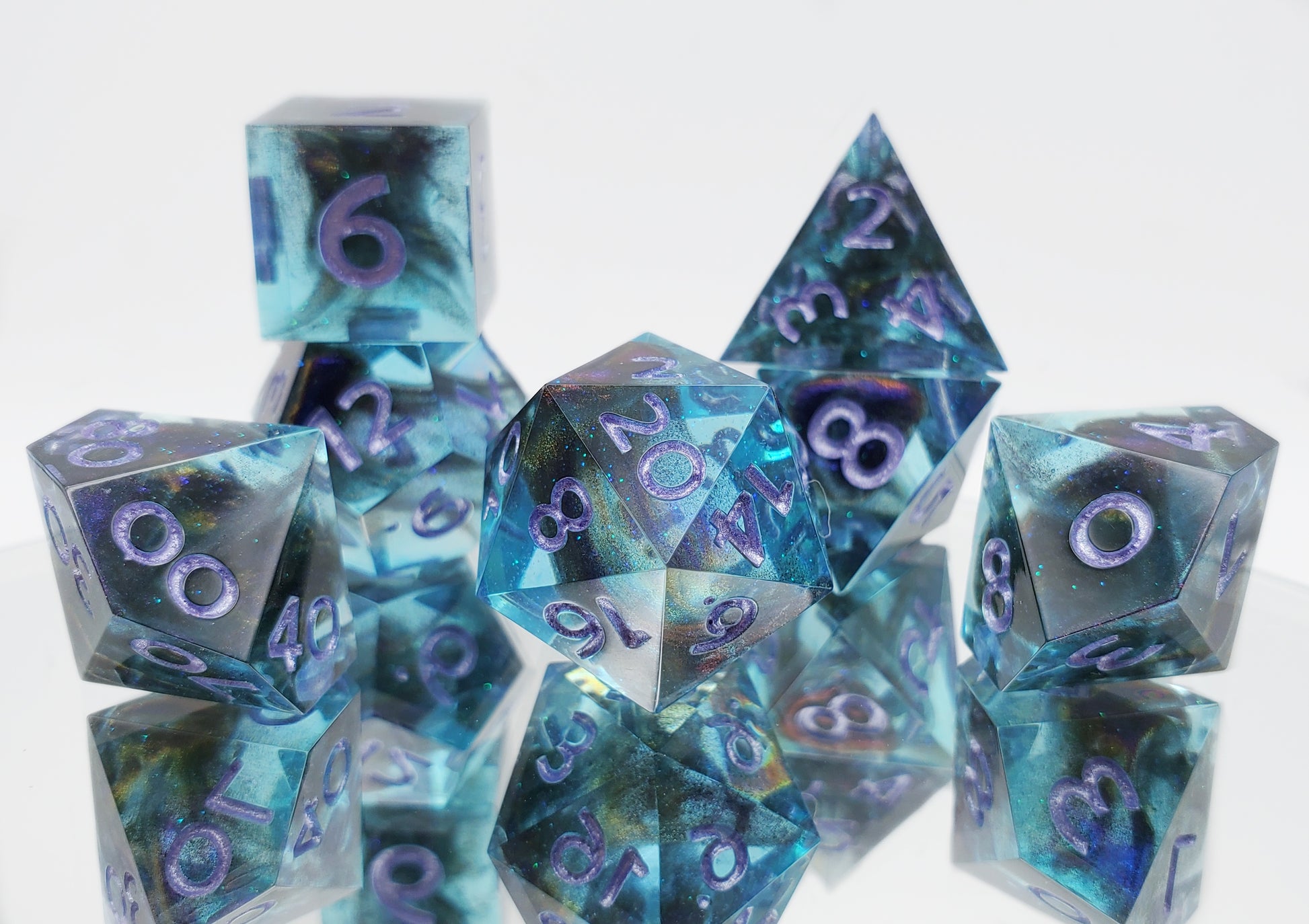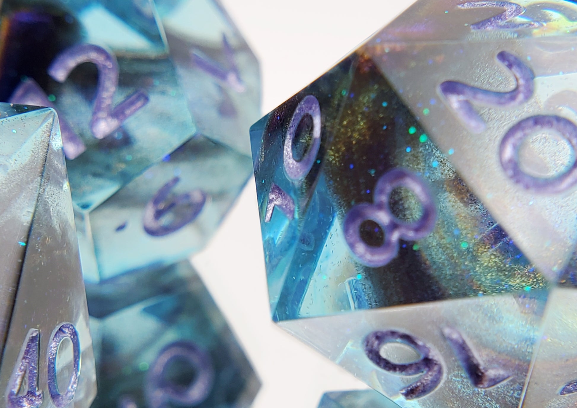 A full standard 7 piece polyhedral set (d20, d12, d%, d10, d8, d6, and d4) of transparent blue dice with subtle glitter throughout and wisps of colorshifting oil-slick smoke and light purple metallic numbering.