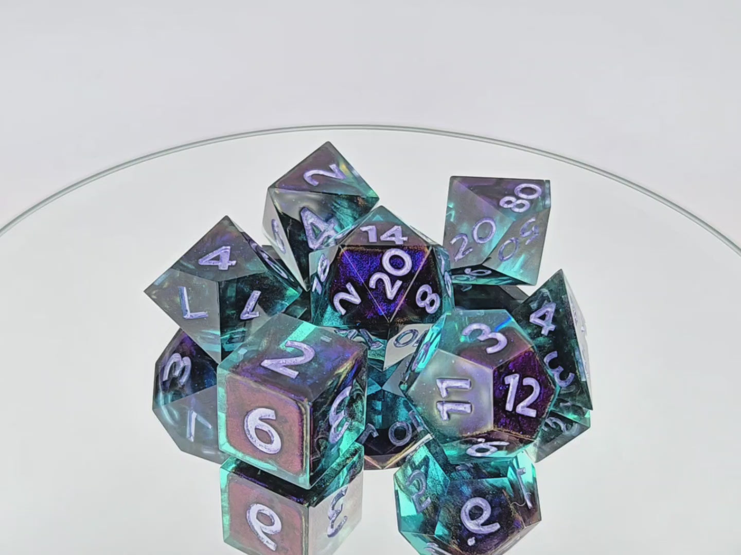 A full standard 7 piece polyhedral set (d20, d12, d%, d10, d8, d6, and d4) of transparent blue dice with subtle glitter throughout and wisps of colorshifting oil-slick smoke and light purple metallic numbering. This set is discounted due to a heavier presence of the colorshift pigment than the set usually has but is otherwise fine. Photos are of the exact set.