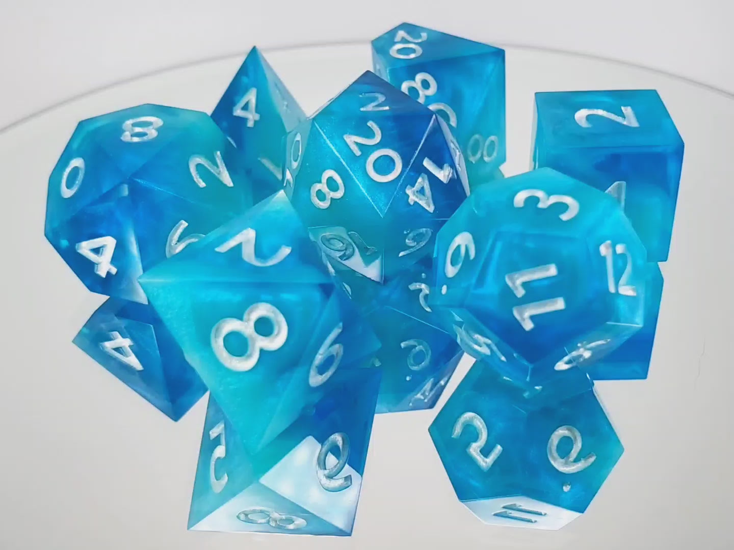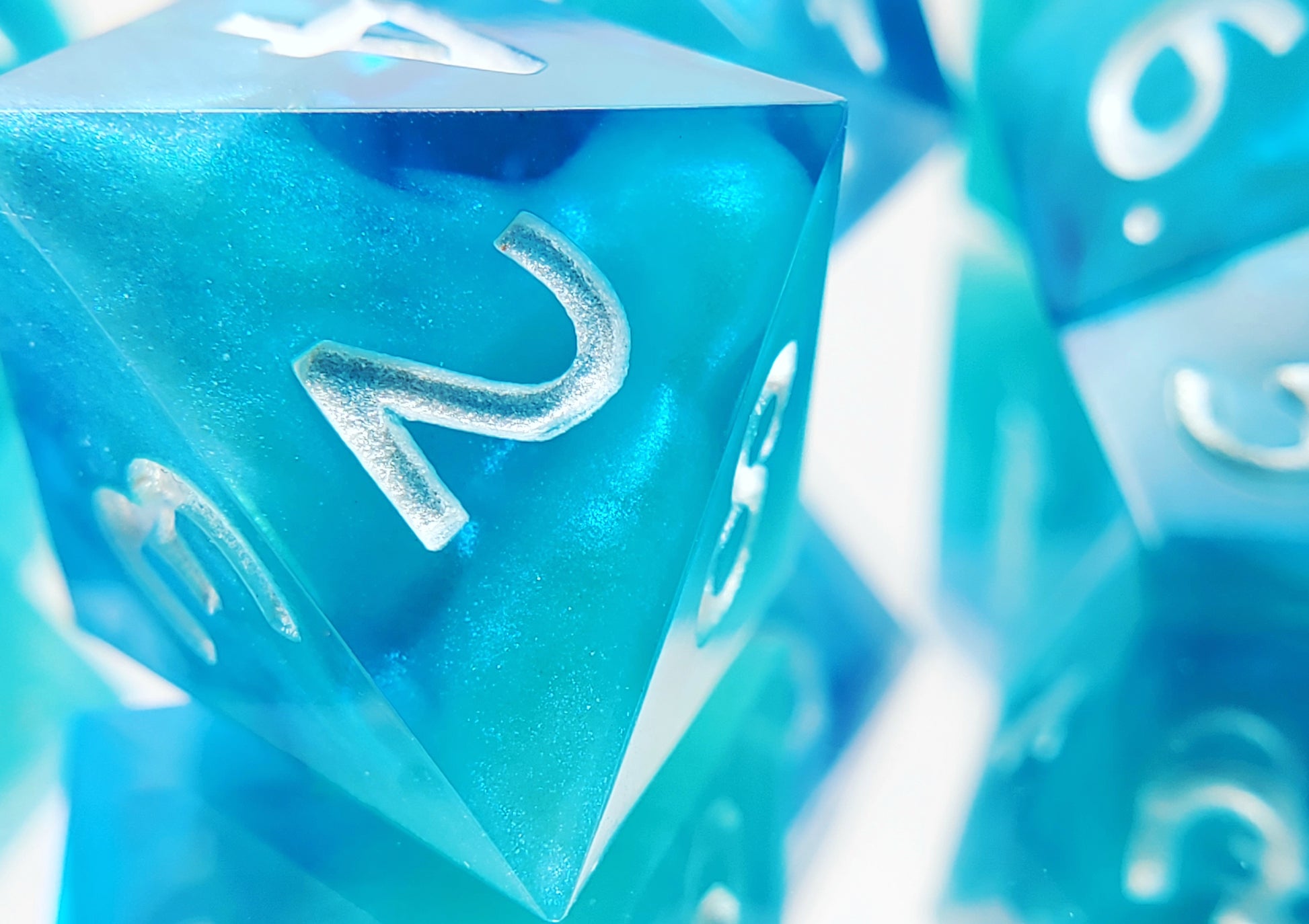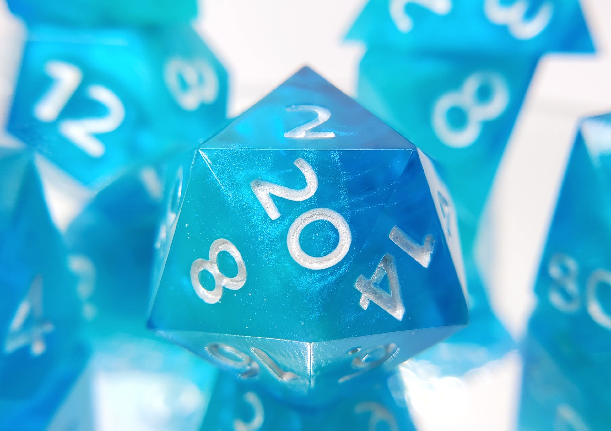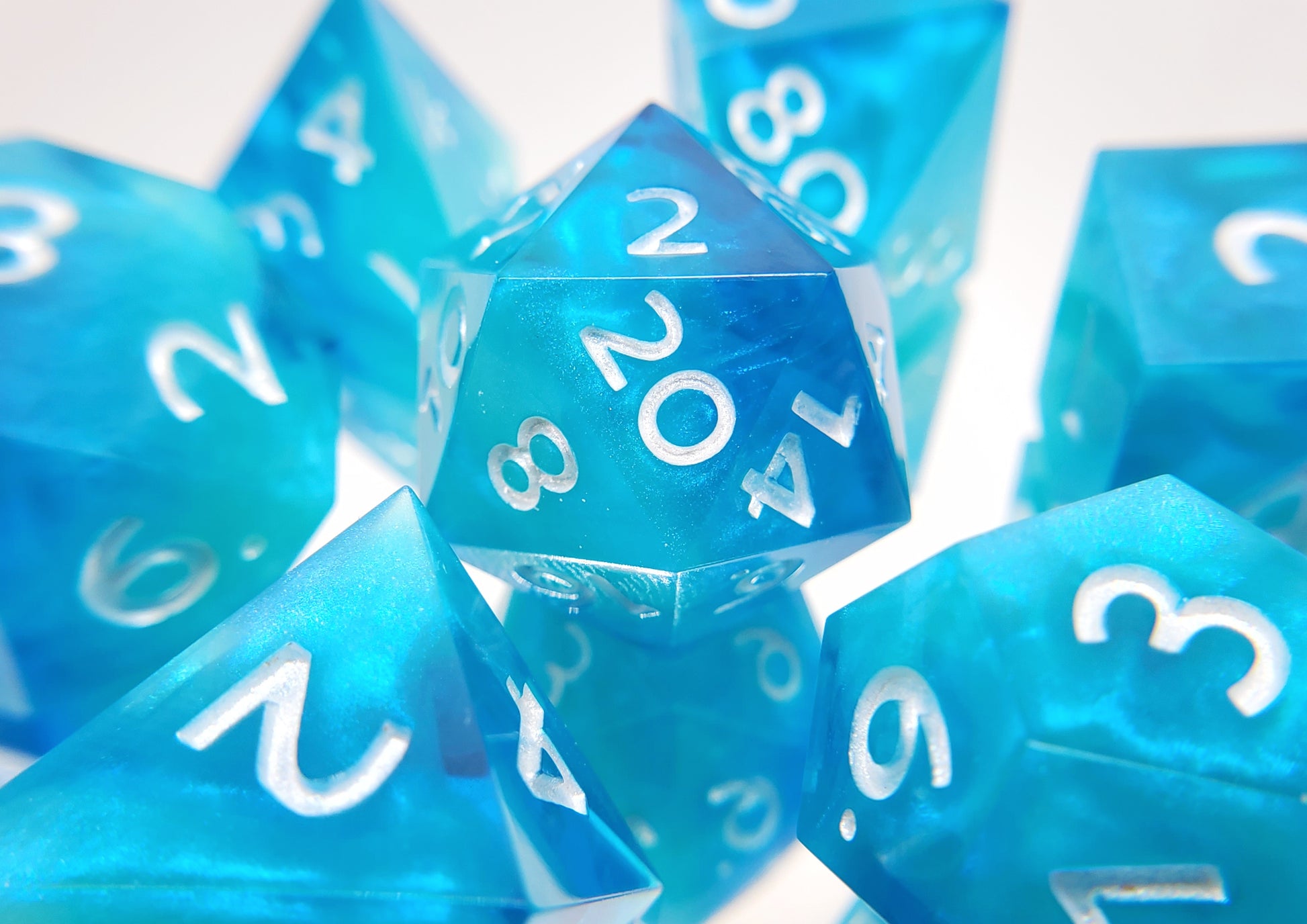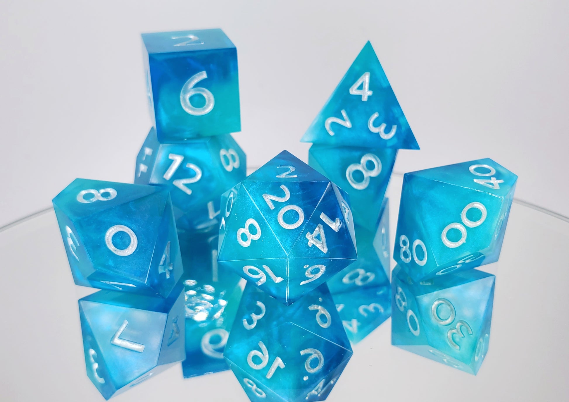 A full standard 7 piece polyhedral set (d20, d12, d%, d10, d8, d6, and d4) of swirls transparent blue and shimmery light blue with pearl white numbering. This set is inspired by a PC in my home campaign, Artemesia Finch.
