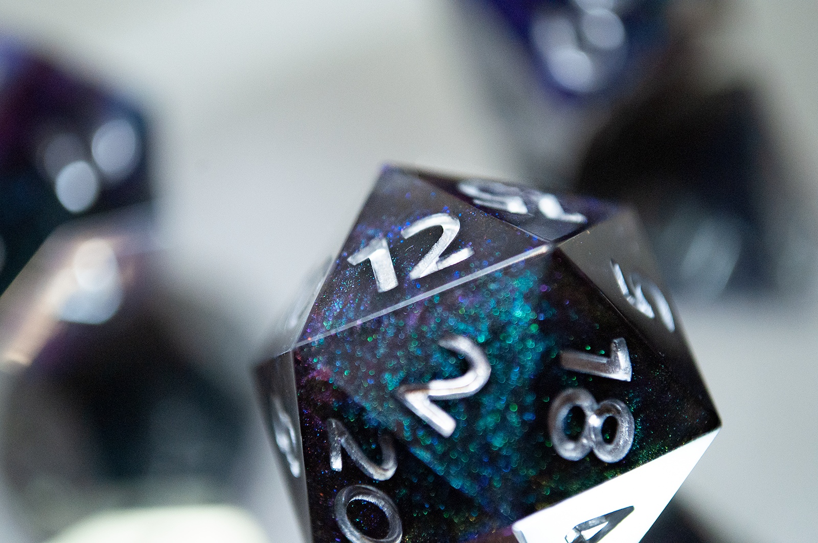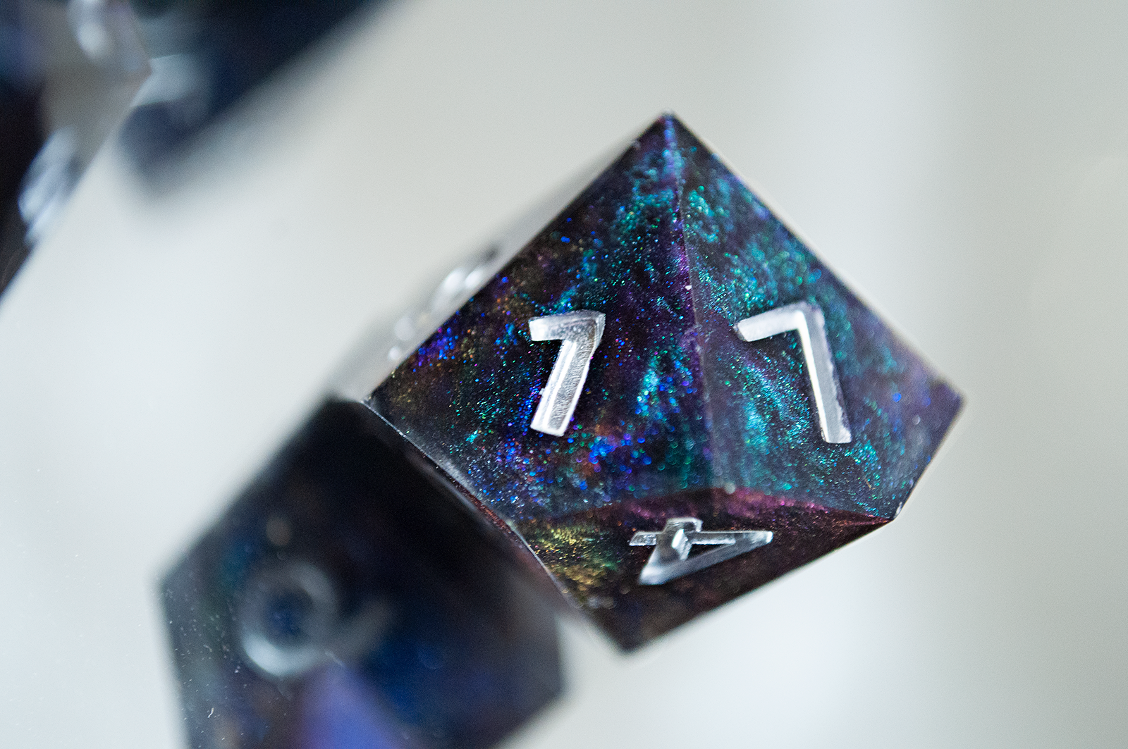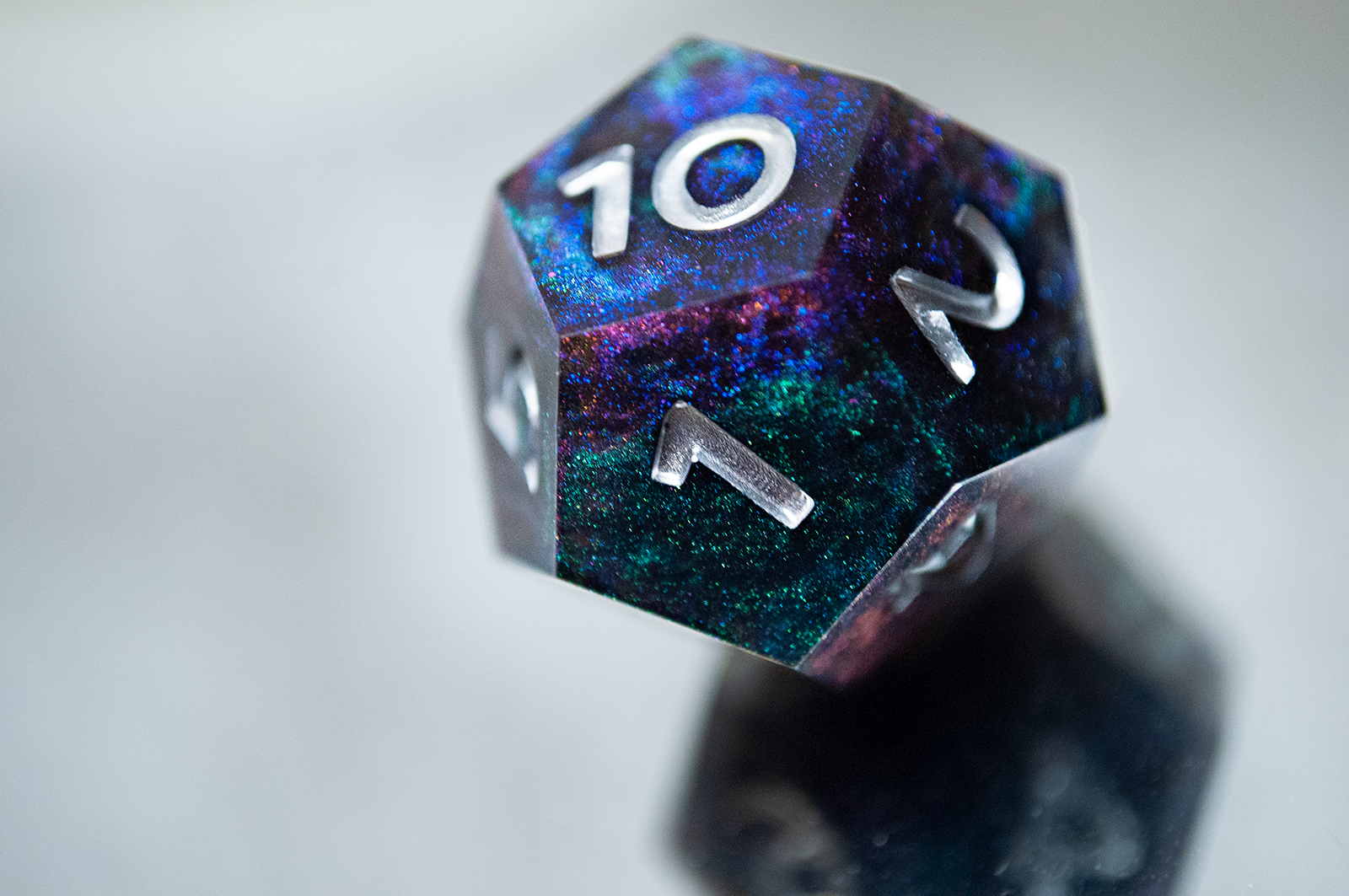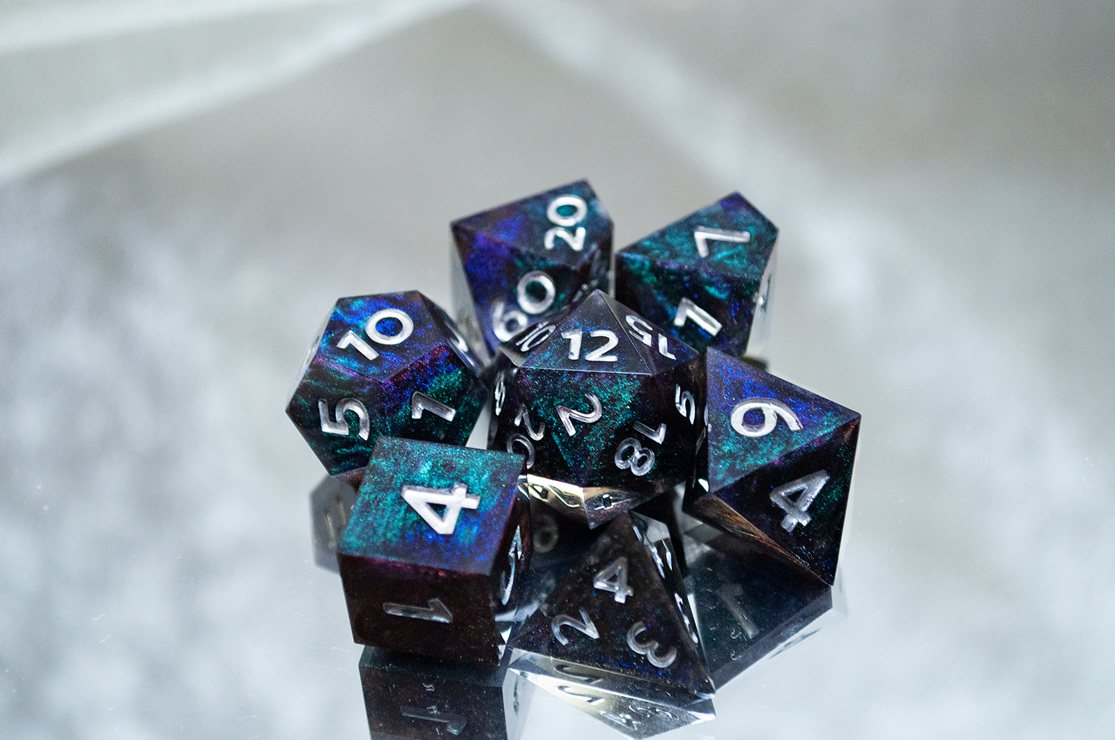 A full standard 7 piece polyhedral set (d20, d12, d%, d10, d8, d6, and d4) of dual colorshifting pigments and changes appearance based on the lighting! Inked with silver numbers.