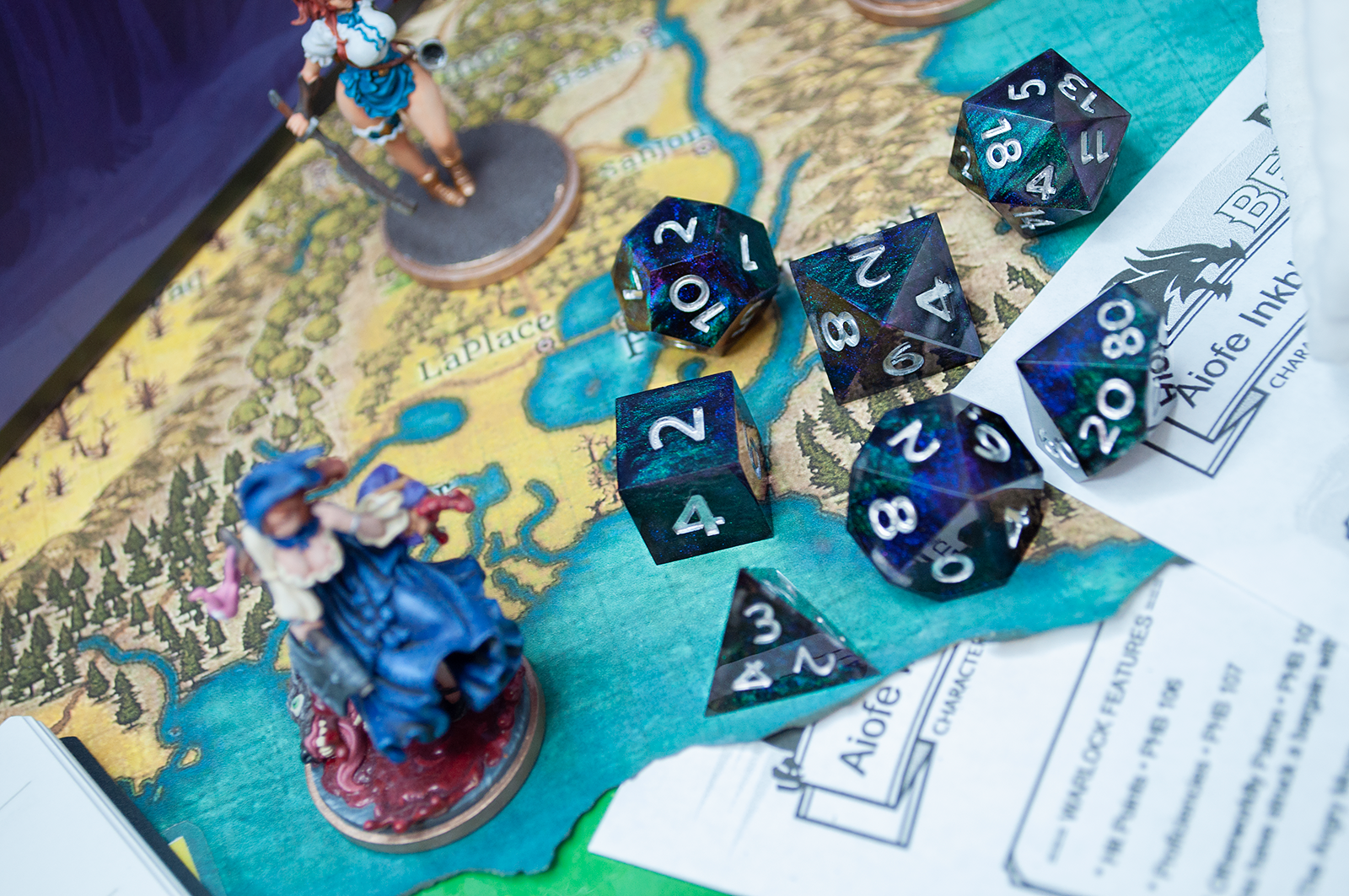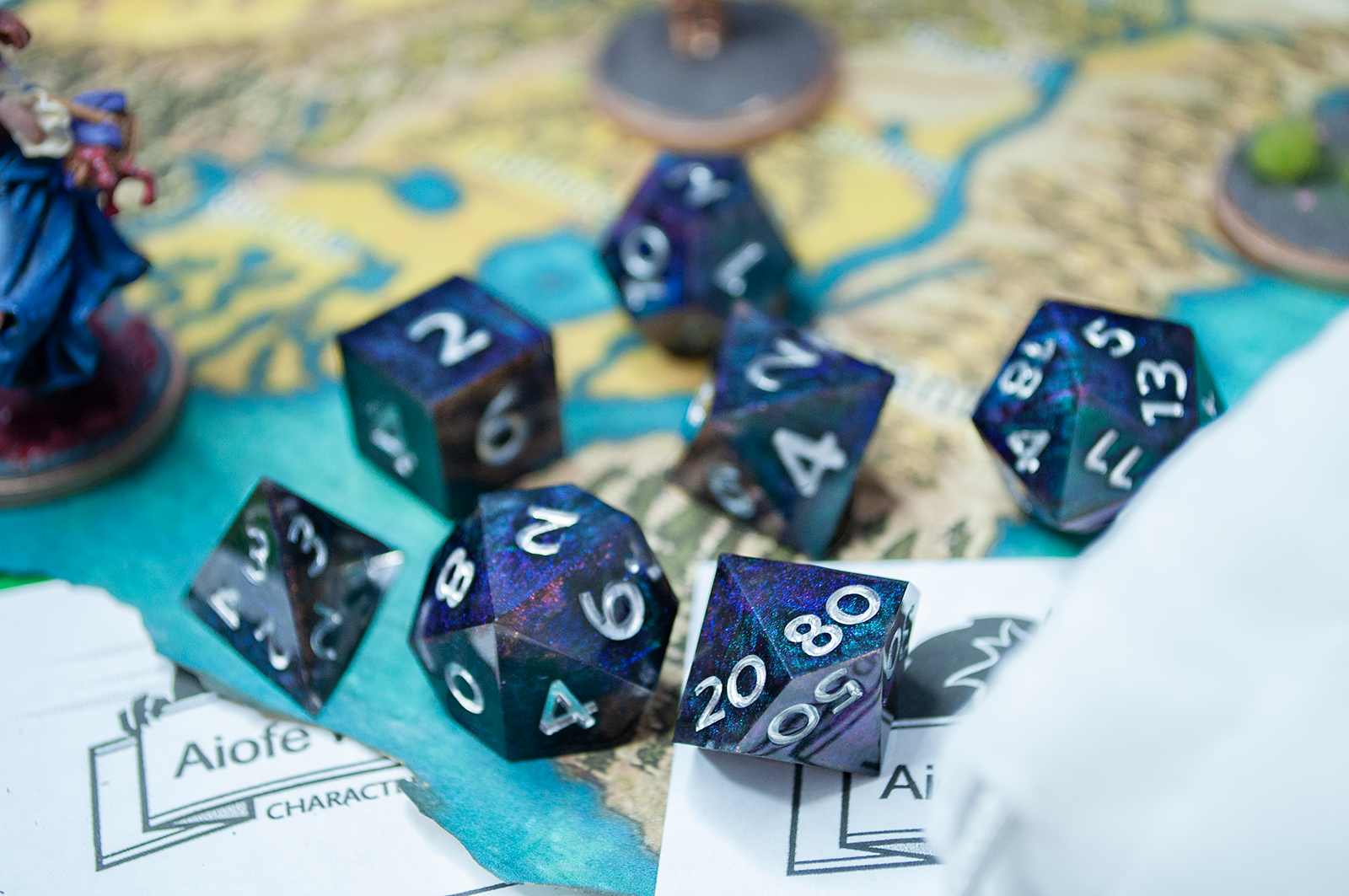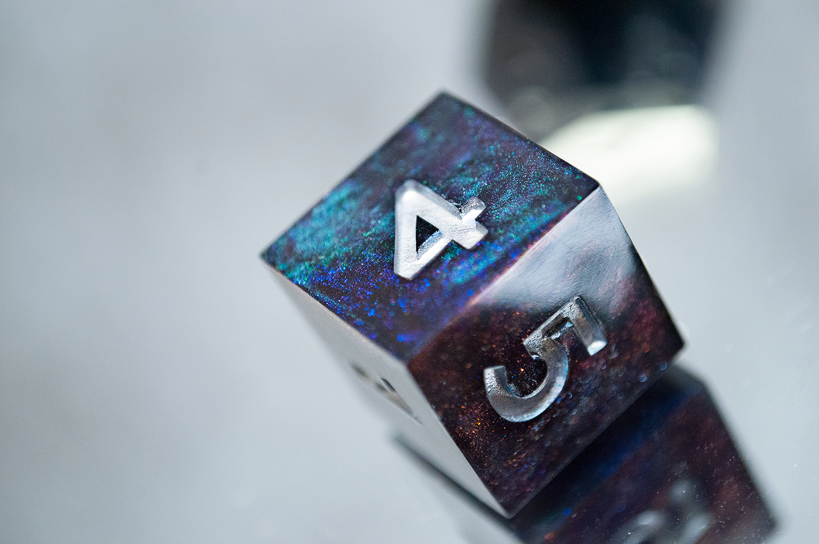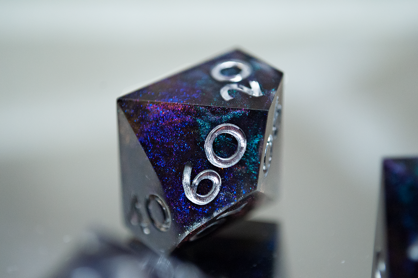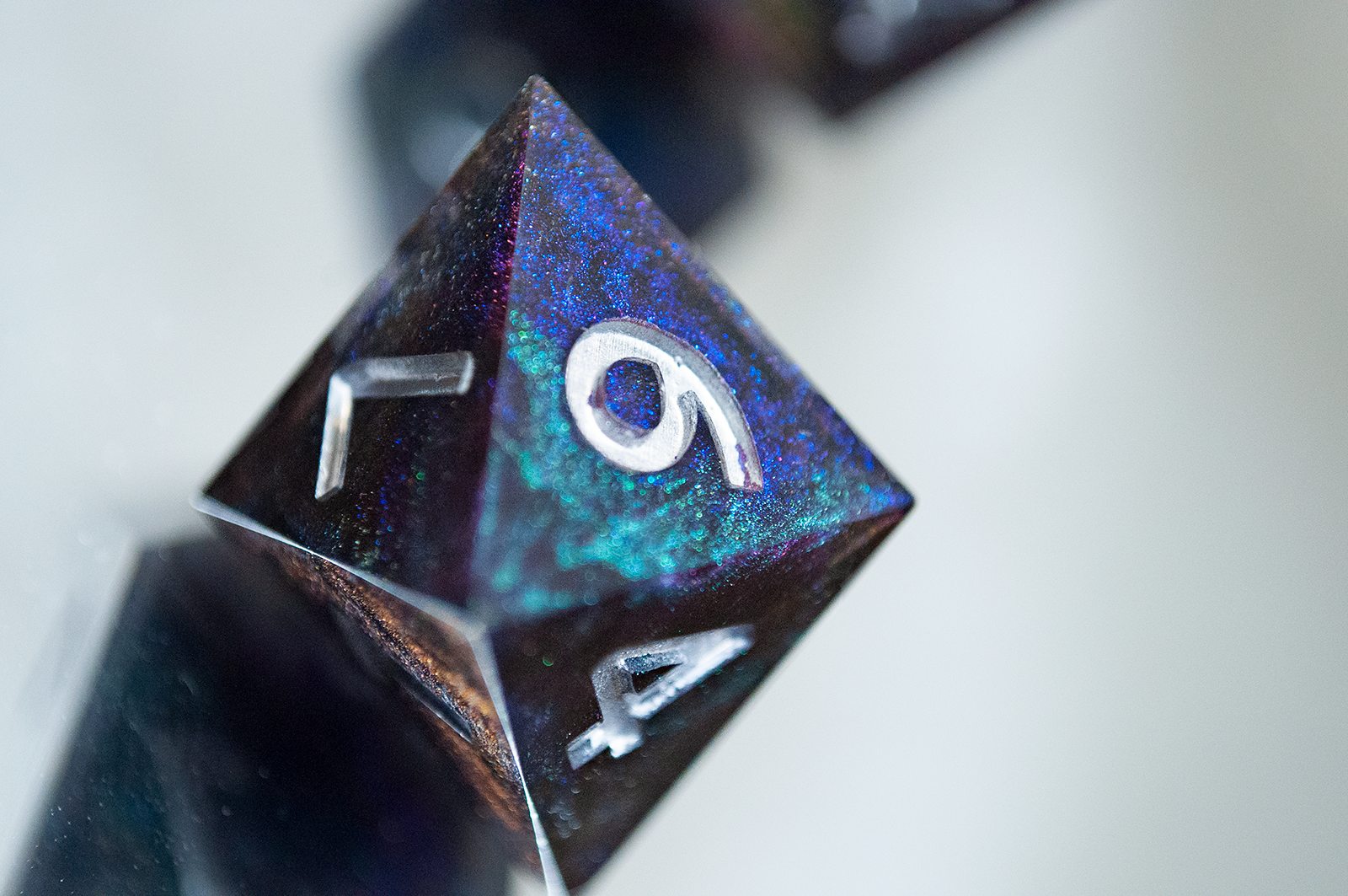 A full standard 7 piece polyhedral set (d20, d12, d%, d10, d8, d6, and d4) of dual colorshifting pigments and changes appearance based on the lighting! Inked with silver numbers.