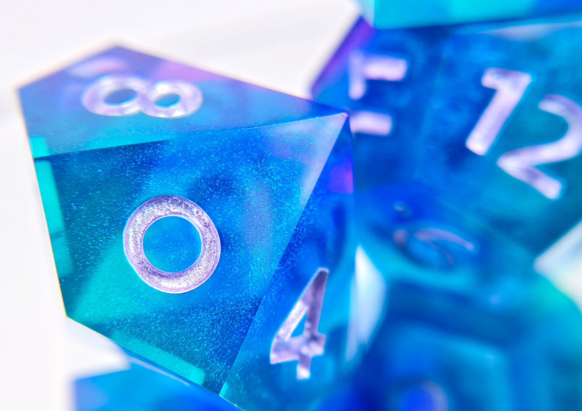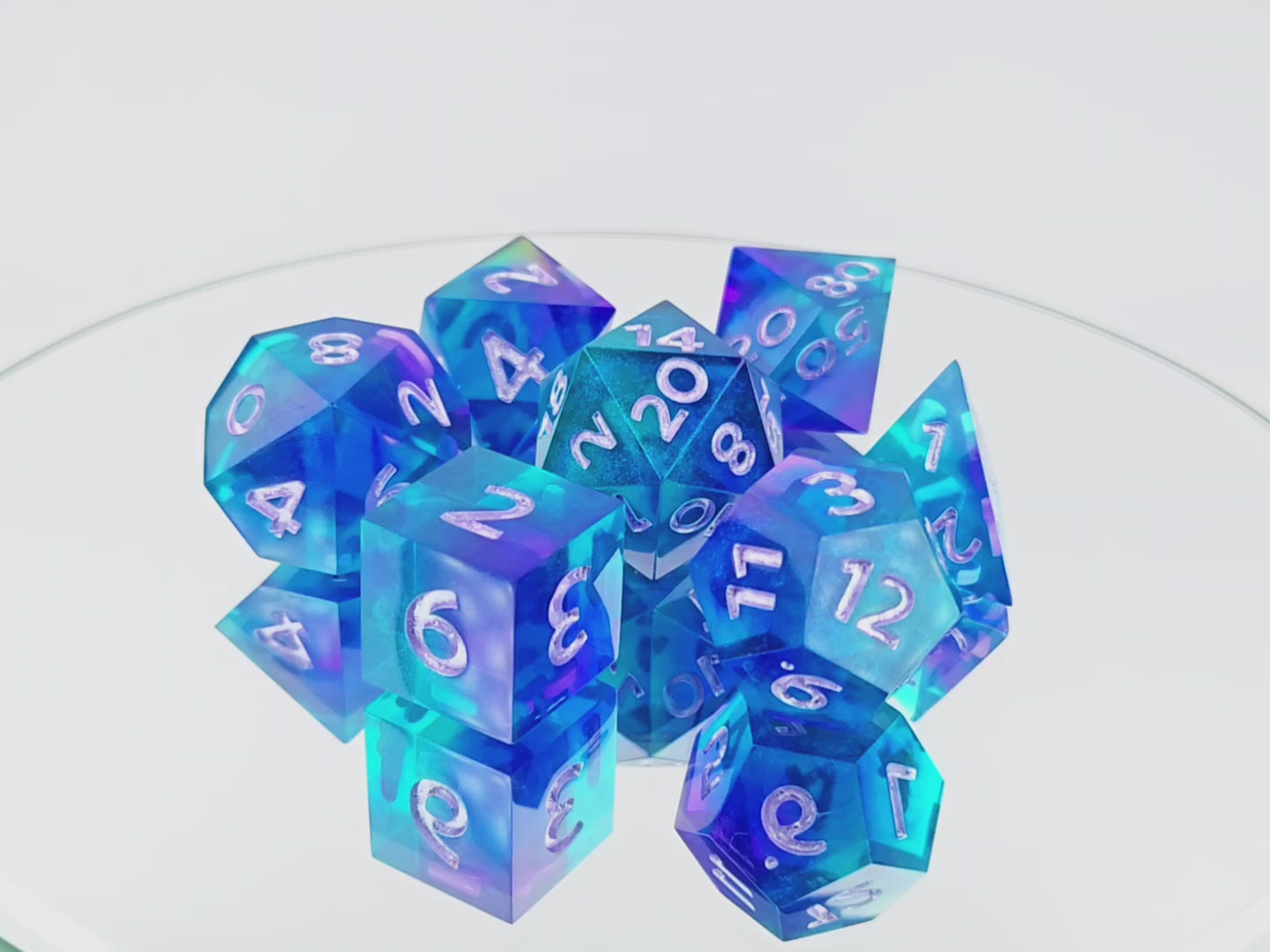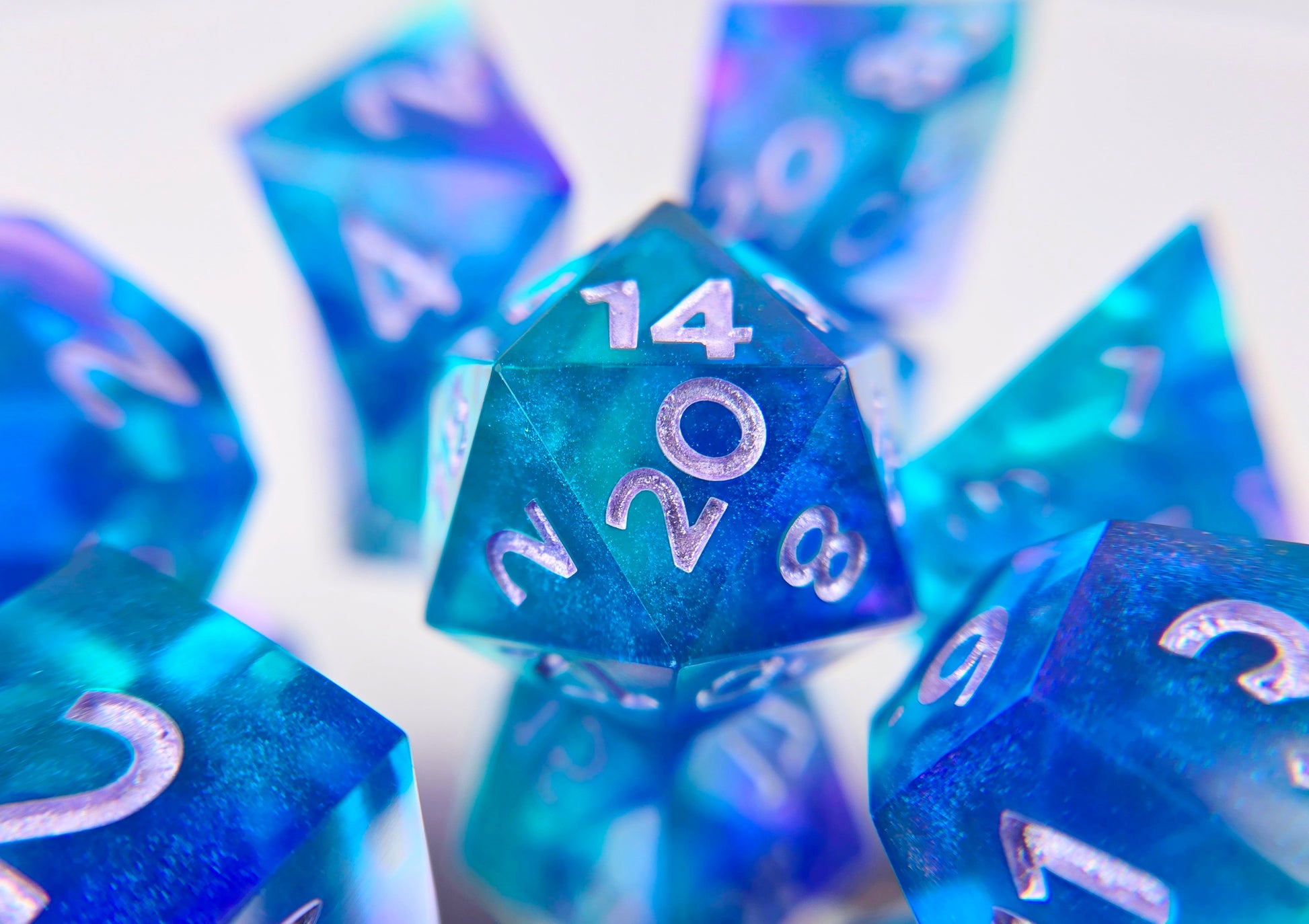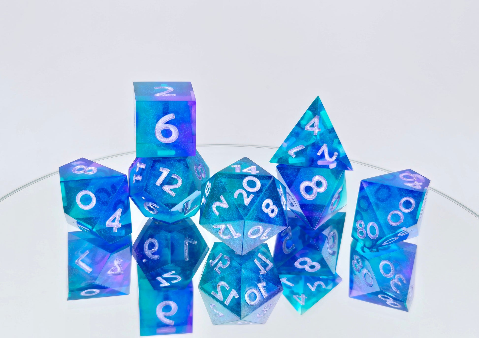 A full standard 7 piece polyhedral set (d20, d12, d%, d10, d8, d6, and d4) of rich teal and purple swirls with purple/teal colorshift shimmer and metallic light purple numbering.
