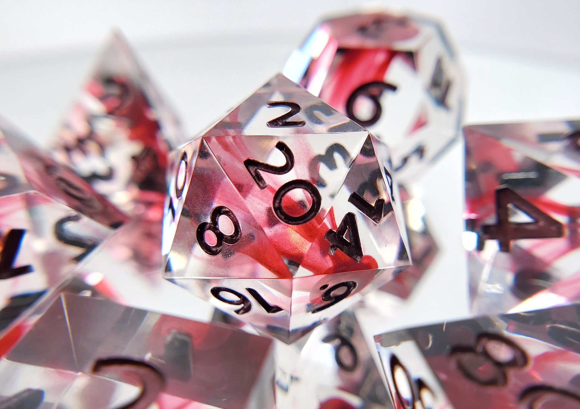 A full standard 7 piece polyhedral set (d20, d12, d%, d10, d8, d6, and d4) of clear dice with metallic red wisps throughout and metallic maroon numbering.
