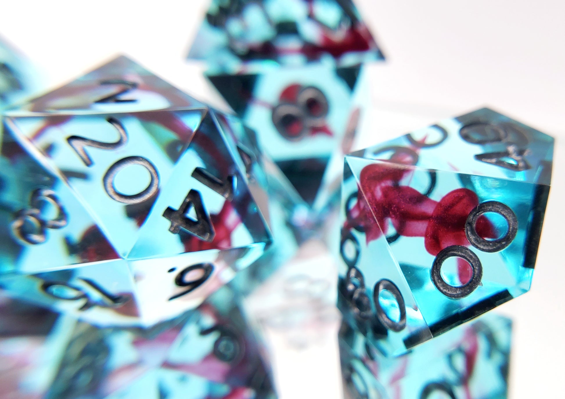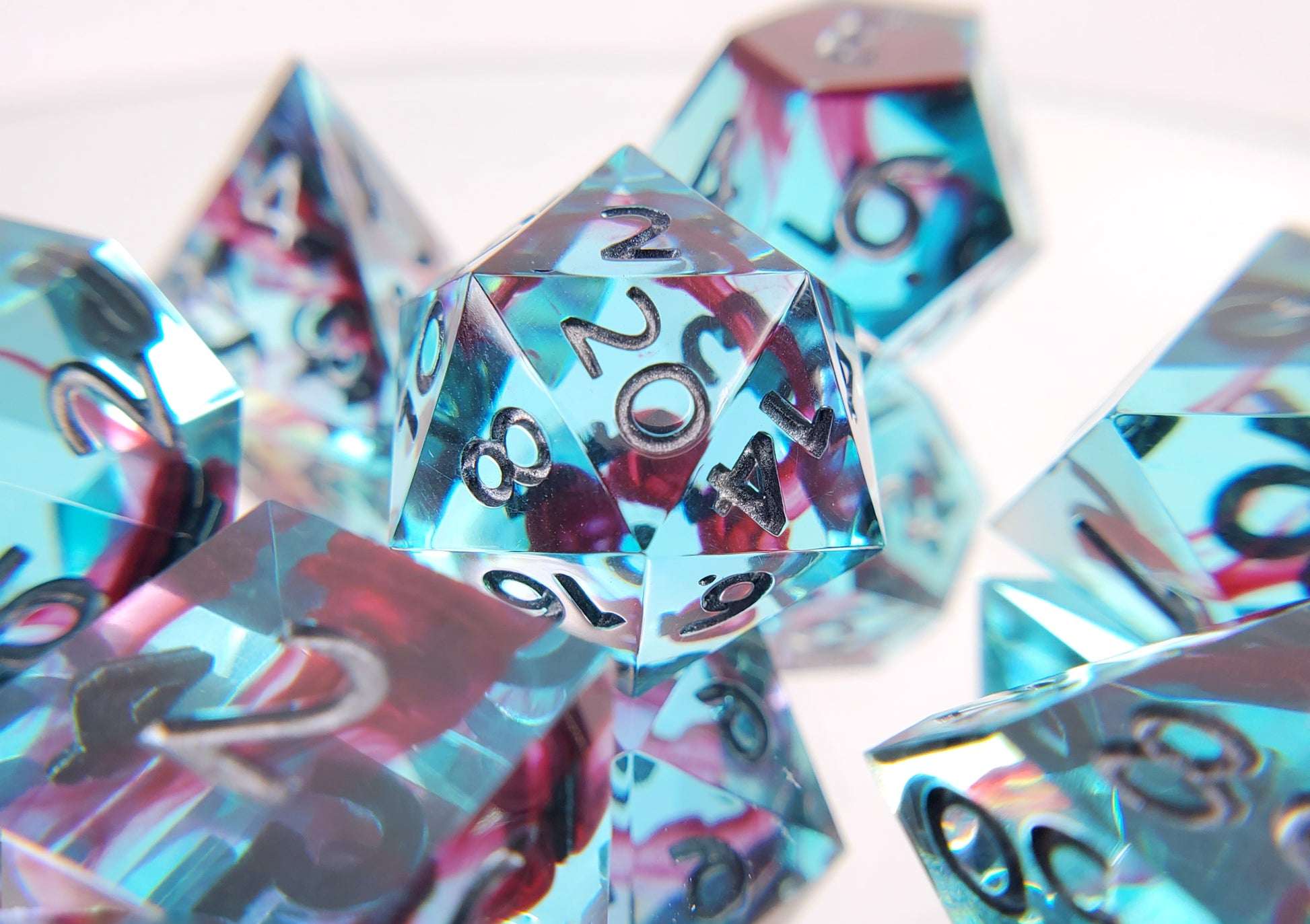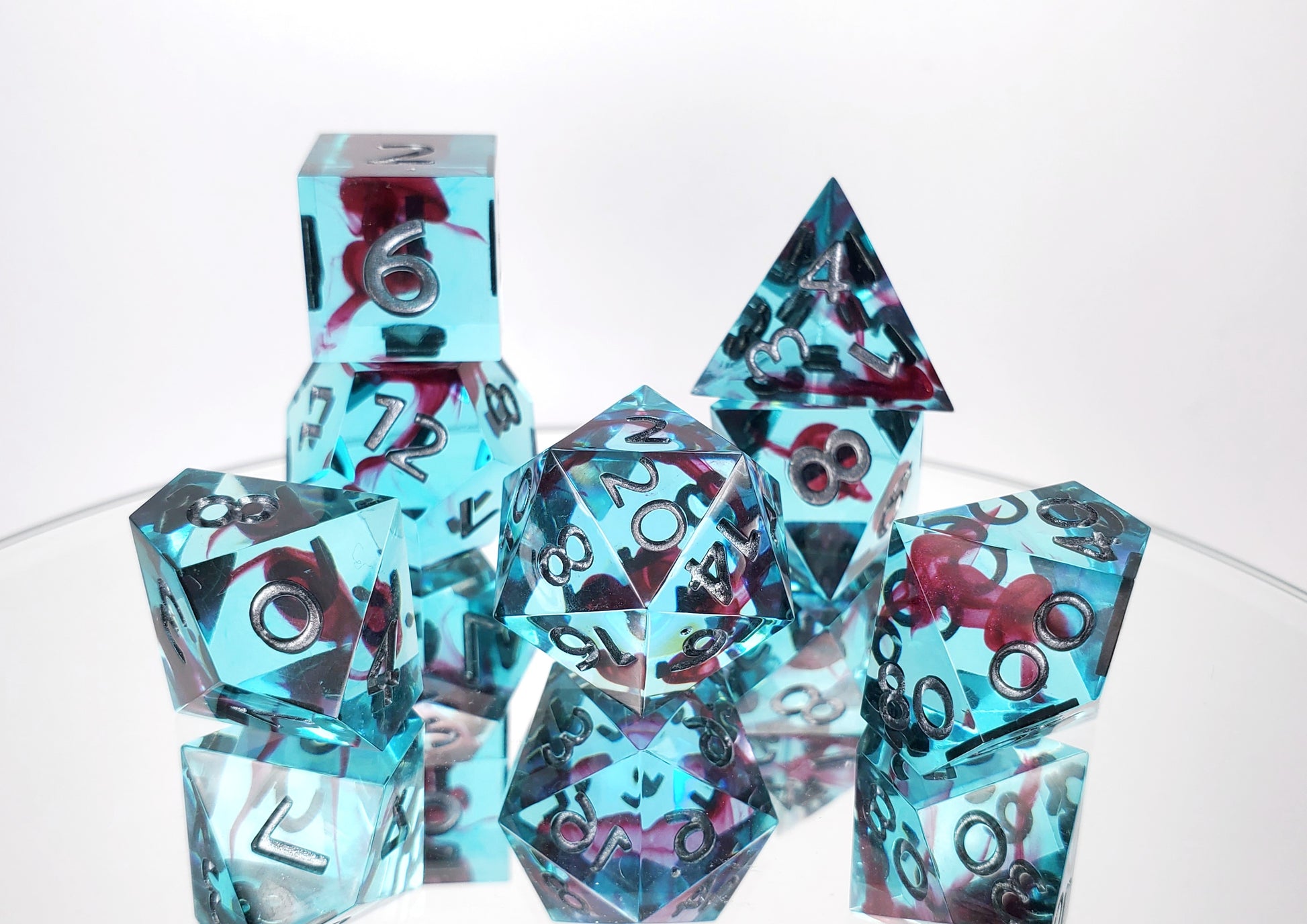 *Dice are entirely handmade from start to finish and therefore may have minor imperfections or color variations. Pictures are representative of the color and style but your exact set may vary. Please note color calibration of your screen may also vary. While they are just as balanced as commercially produced dice, it is recommended handmade dice be used for casual play only.