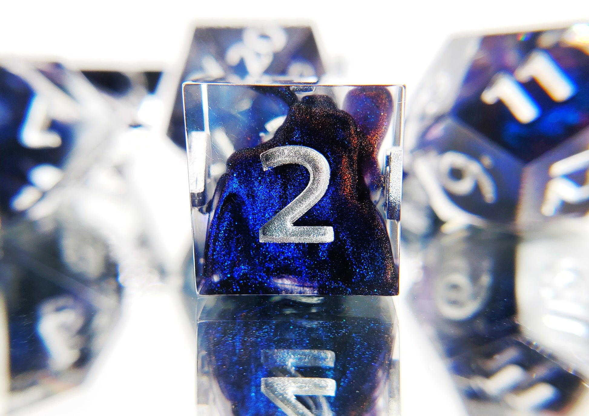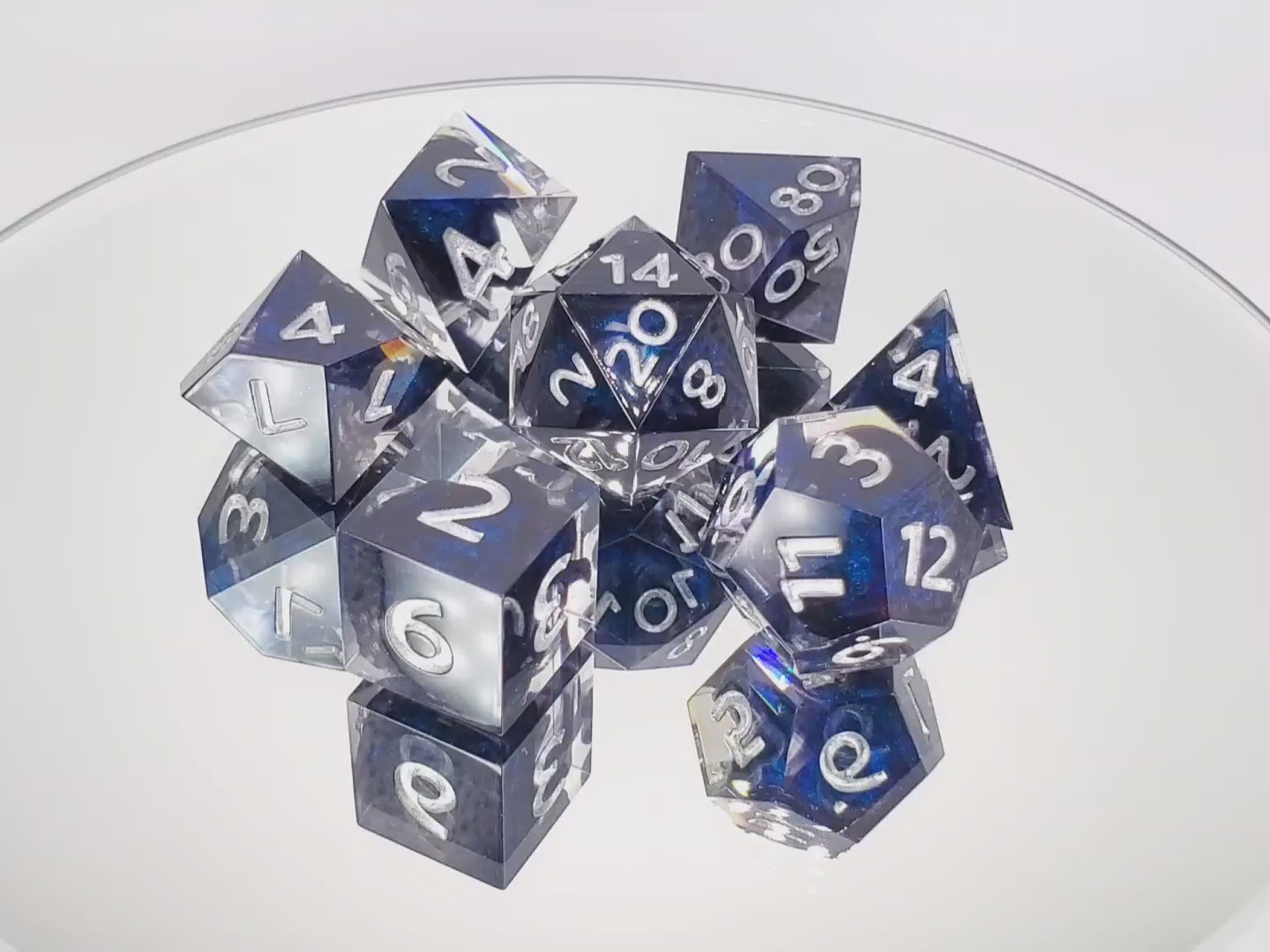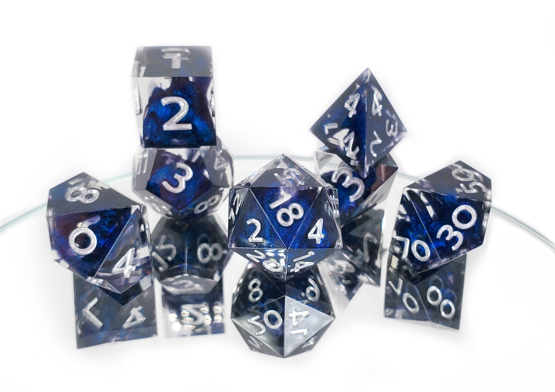 A full standard 7 piece polyhedral set (d20, d12, d%, d10, d8, d6, and d4) of clear resin with dark blue colorshifting shimmer bloops and silver numbering.
