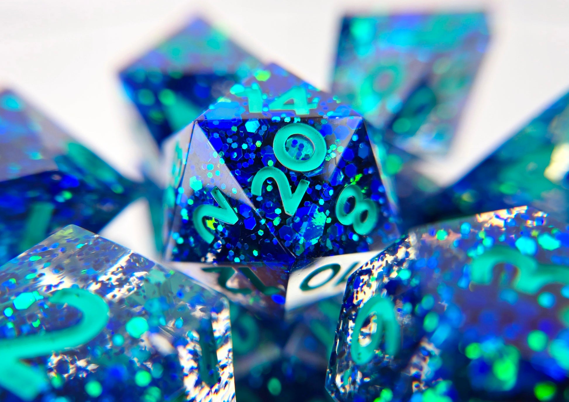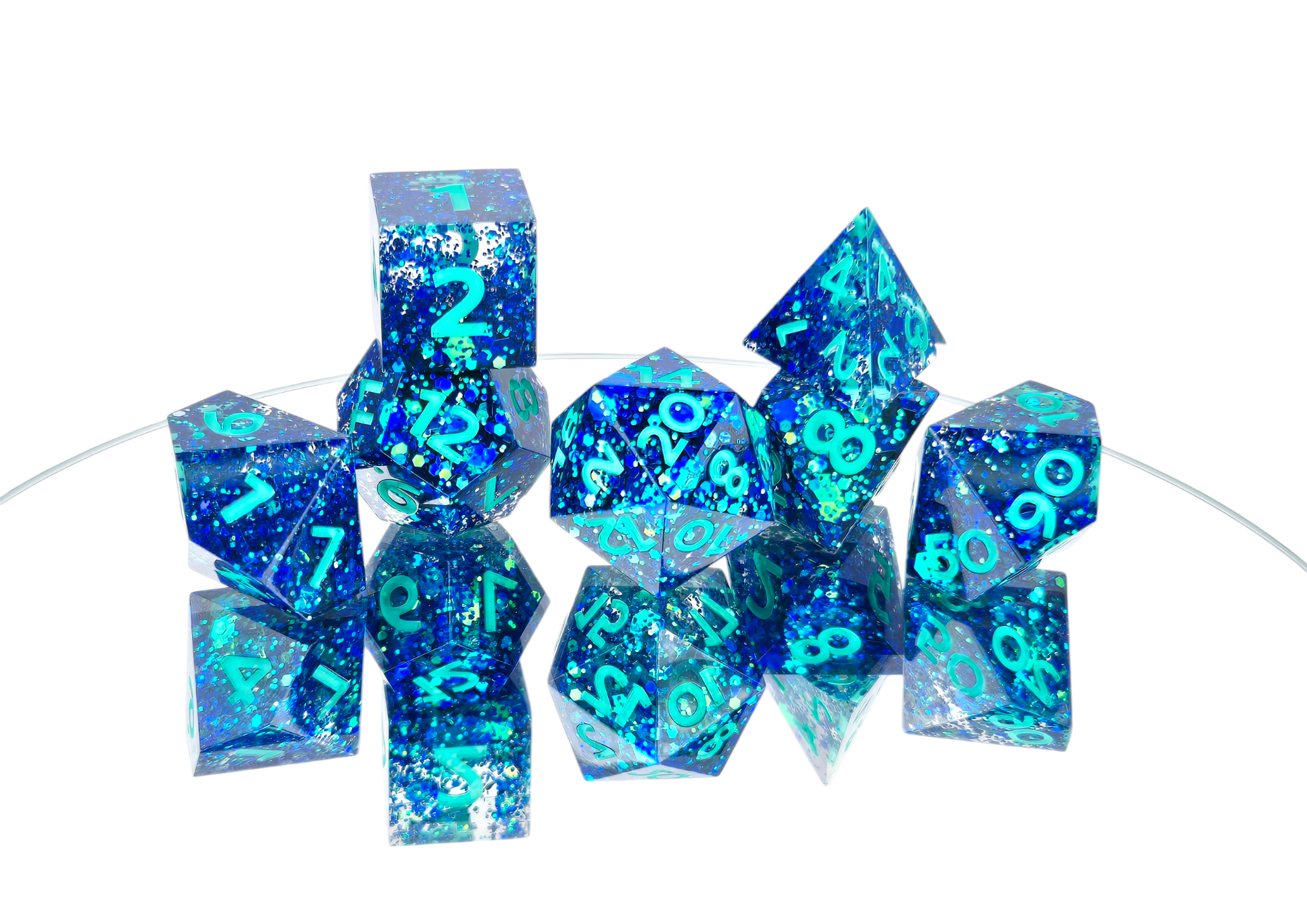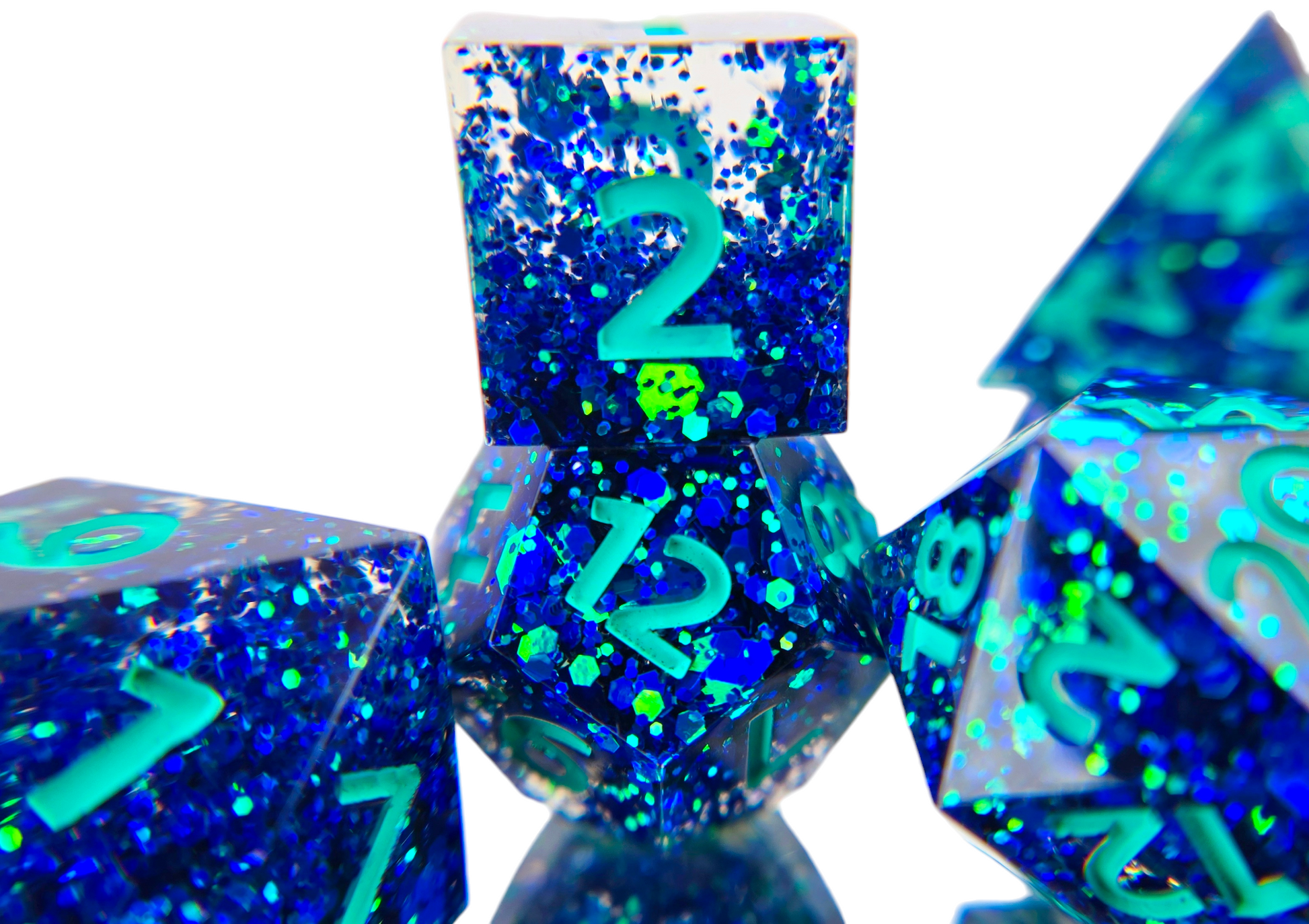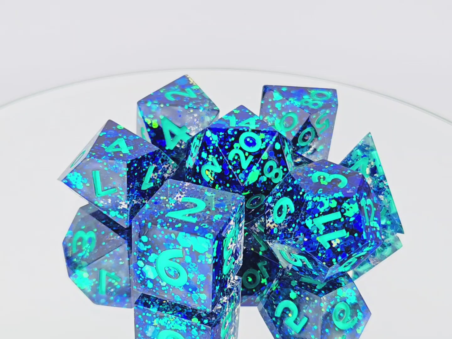 A full standard 7 piece polyhedral set (d20, d12, d%, d10, d8, d6, and d4) with dark blue chunky colorshifting glitter and teal numbers.