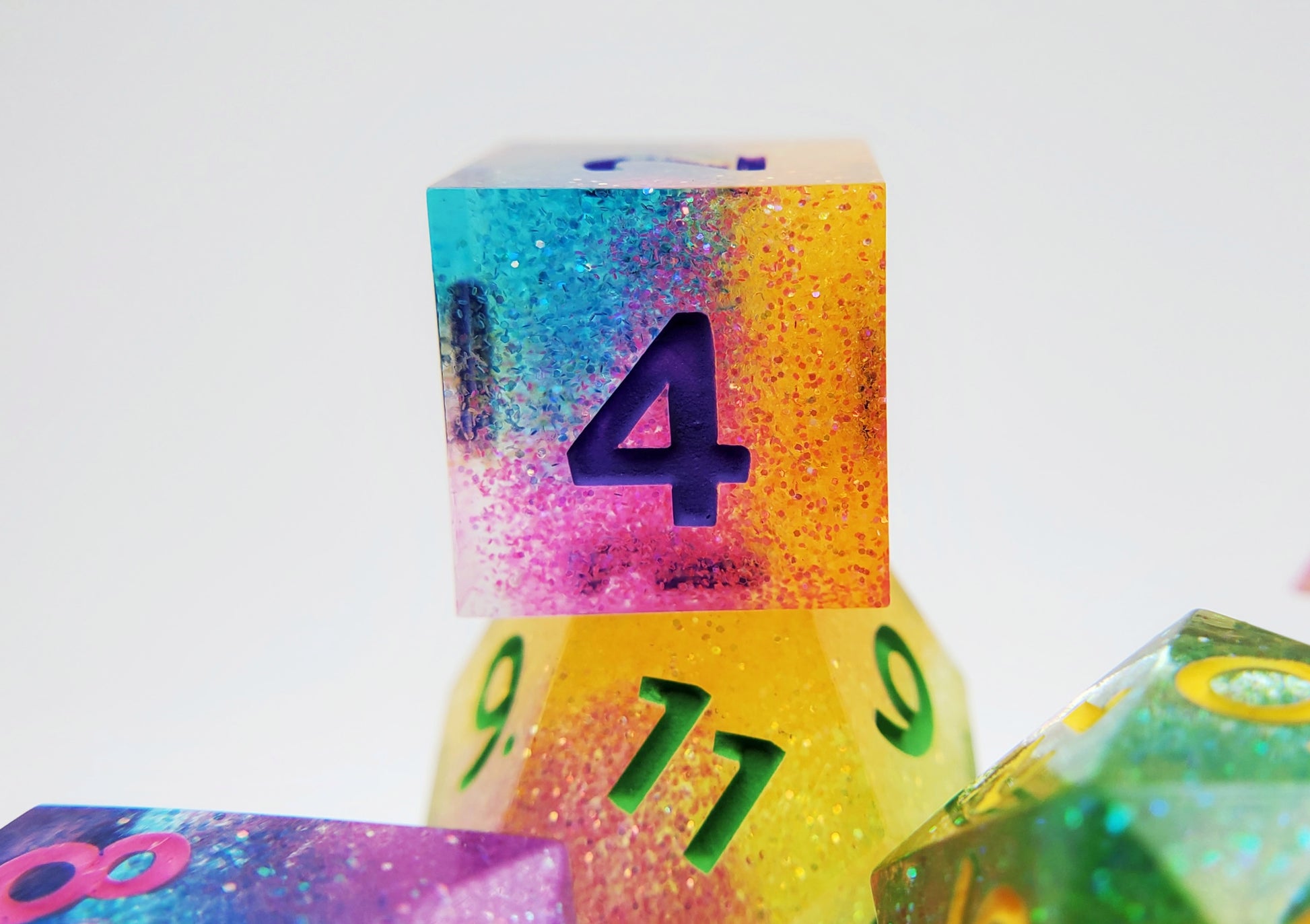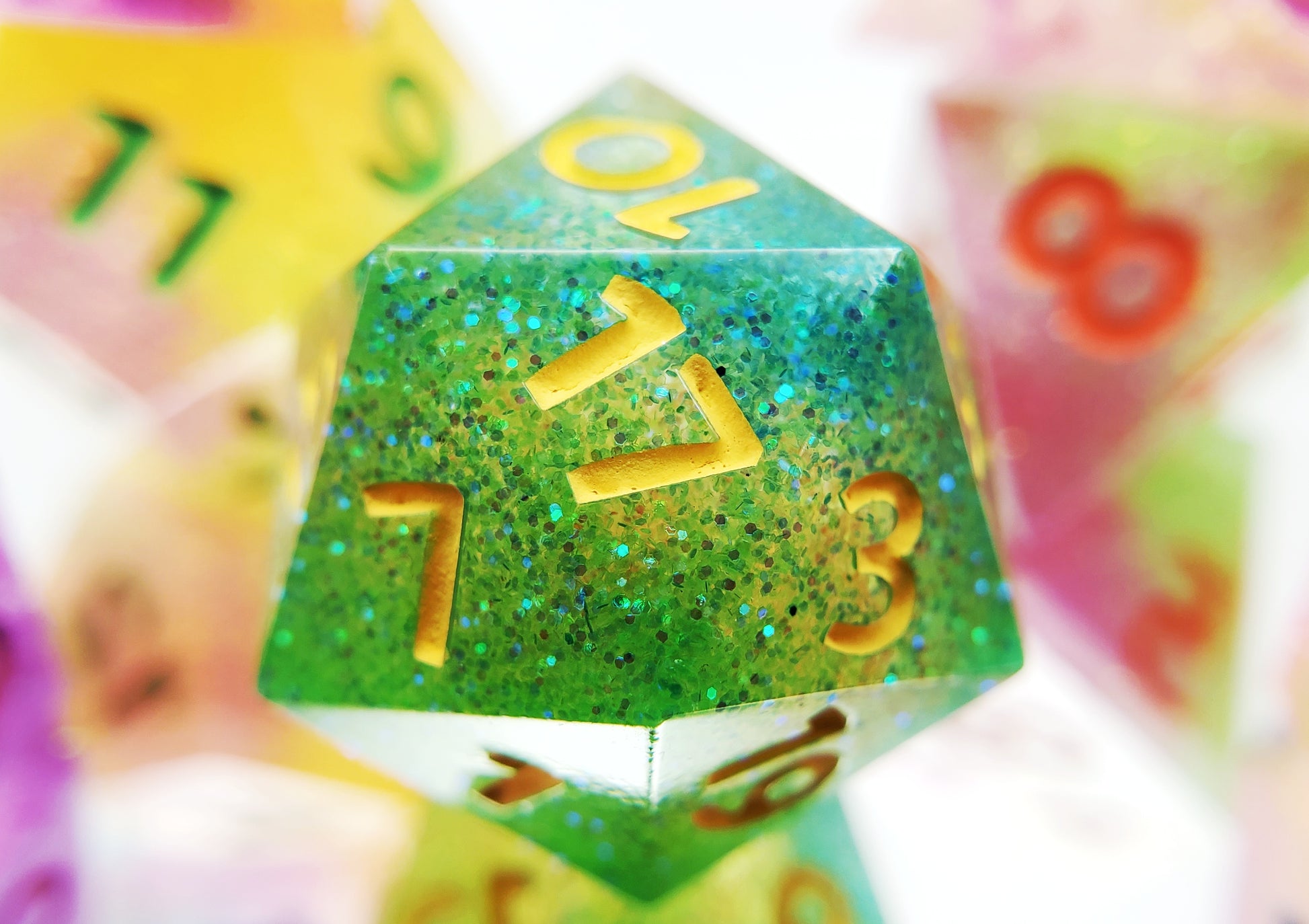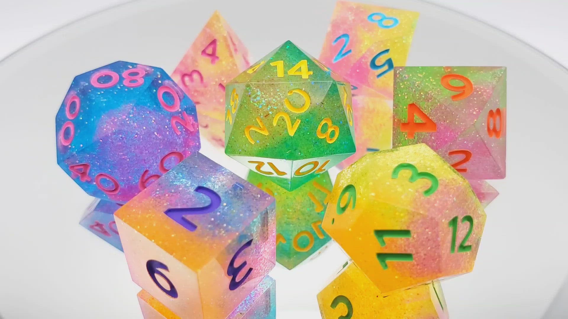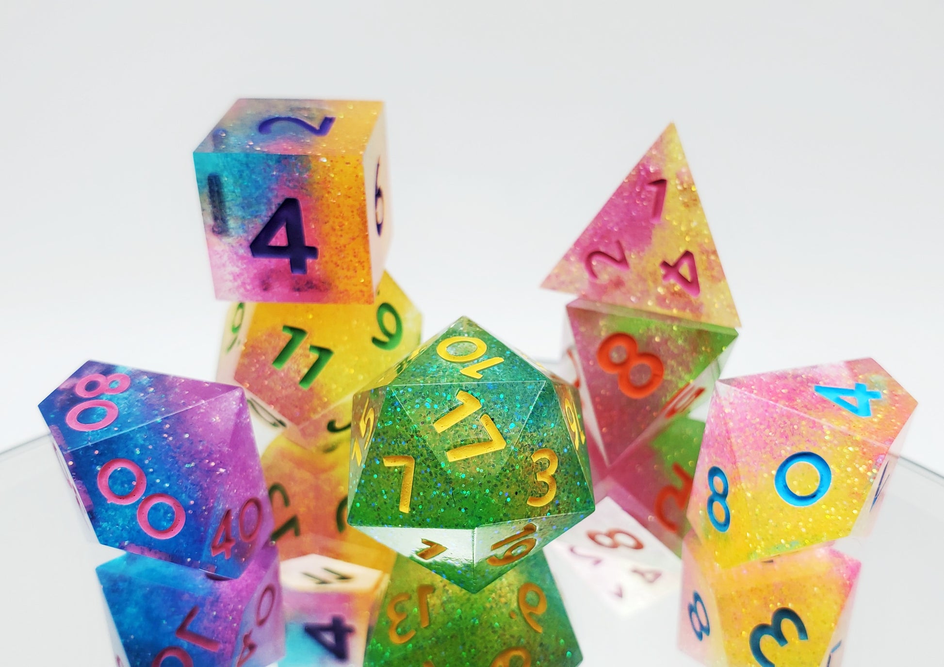 A full standard 7 piece polyhedral set (d20, d12, d%, d10, d8, d6, and d4) of neon glitter dice with bright numbering. Every set is unique and no color combination is the same.
