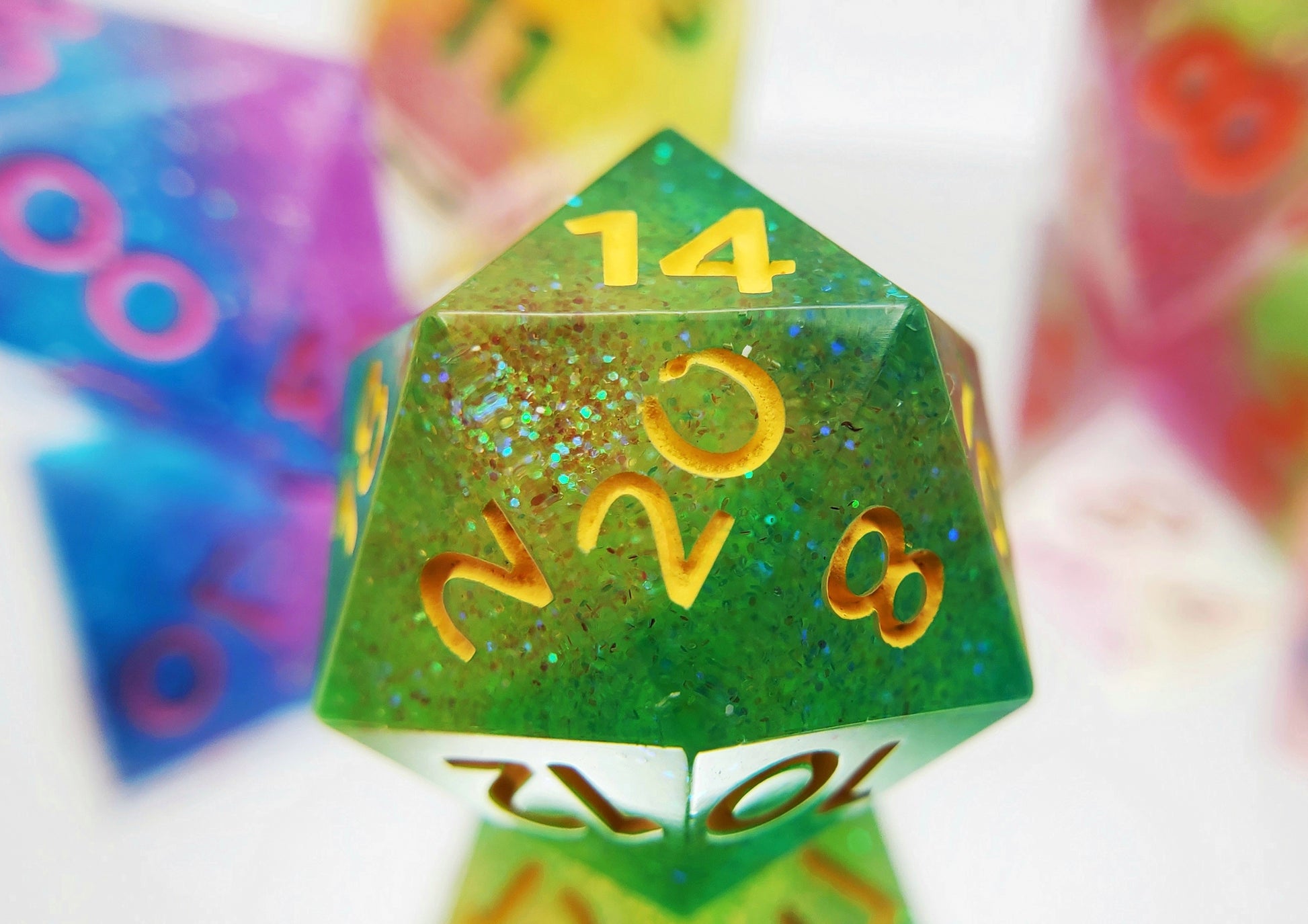 *Dice are entirely handmade from start to finish and therefore may have minor imperfections or color variations. Pictures are representative of the color and style but your exact set may vary. Please note color calibration of your screen may also vary. While they are just as balanced as commercially produced dice, it is recommended handmade dice be used for casual play only.