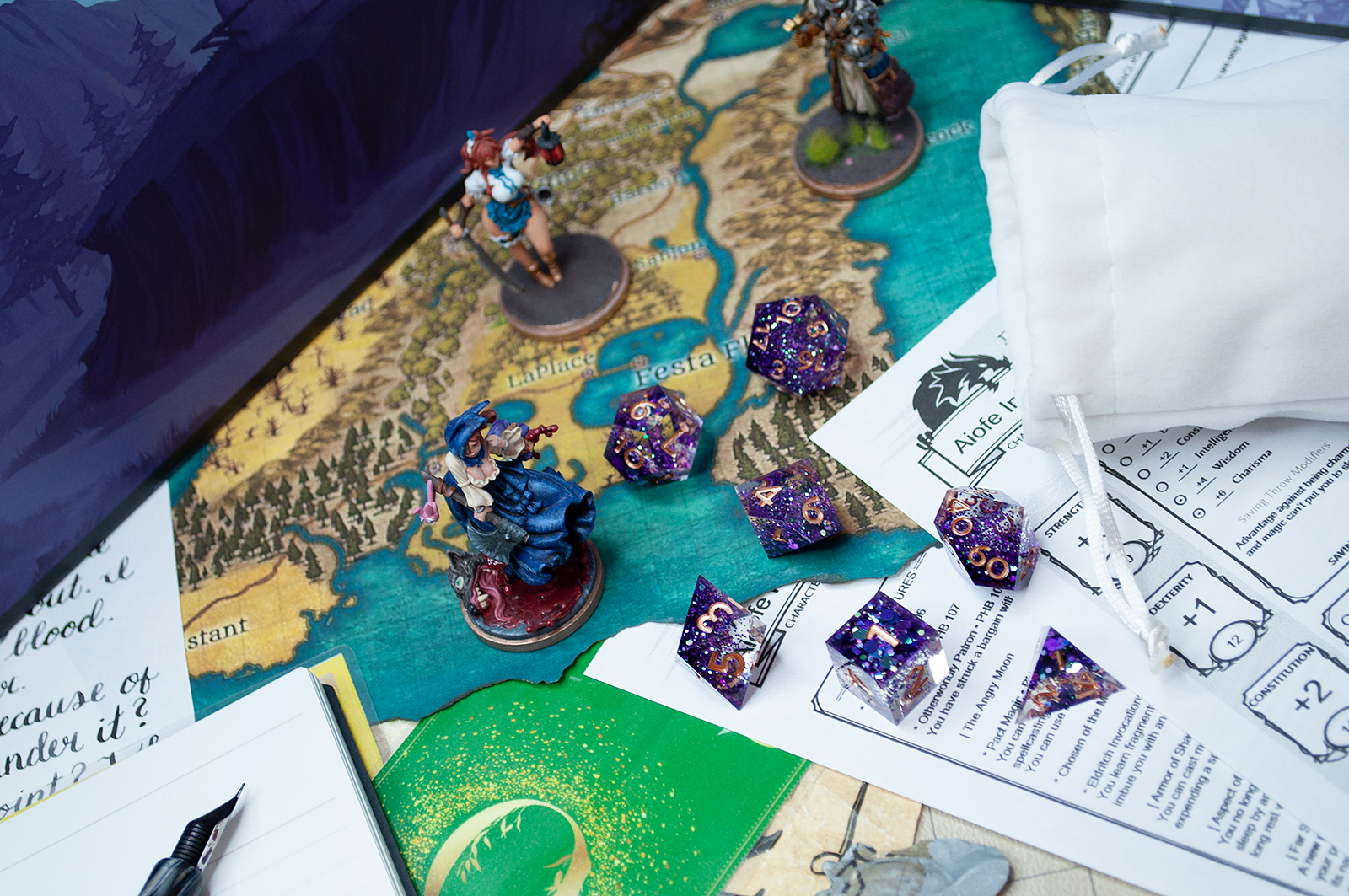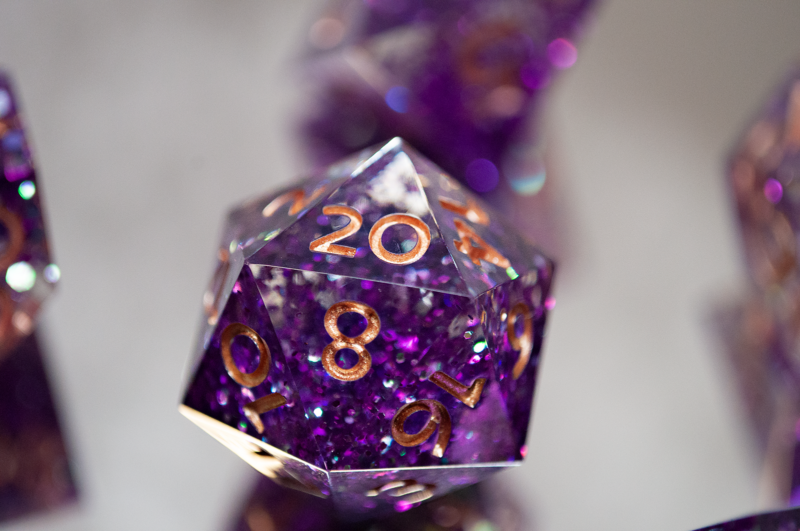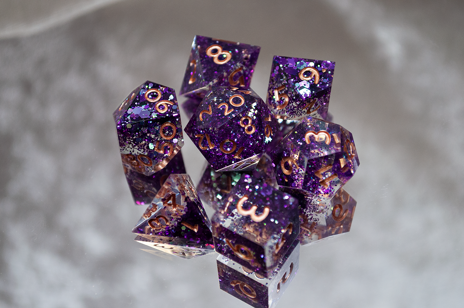 *Dice are entirely handmade from start to finish and therefore may have minor imperfections or color variations. Pictures are representative of the color and style but your exact set may vary. Please note color calibration of your screen may also vary. While they are just as balanced as commercially produced dice, it is recommended handmade dice be used for casual play only.