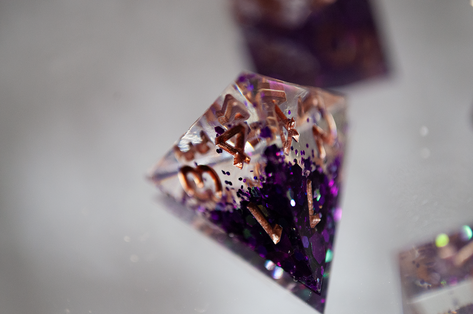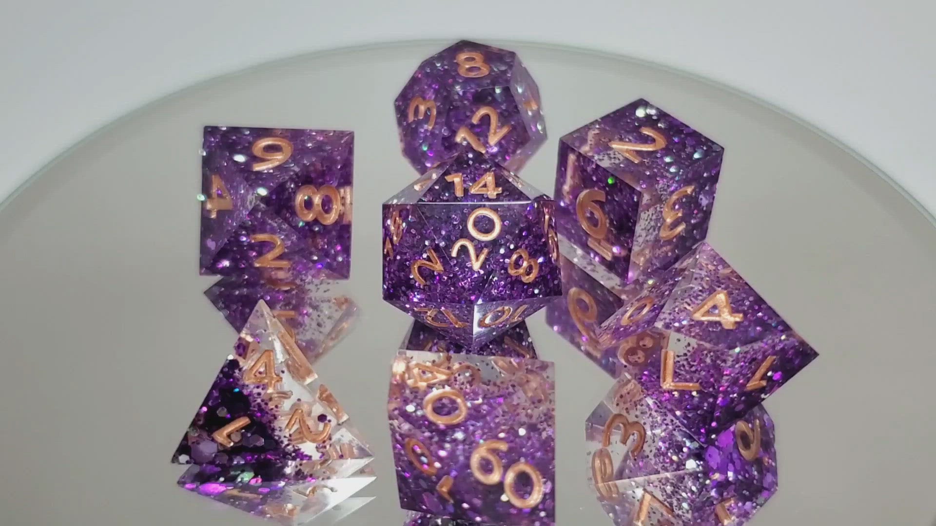 A full standard 7 piece polyhedral set (d20, d12, d%, d10, d8, d6, and d4) of clear dice with purple/green colorshift glitter that "fades" across the die and rose gold numbering.
