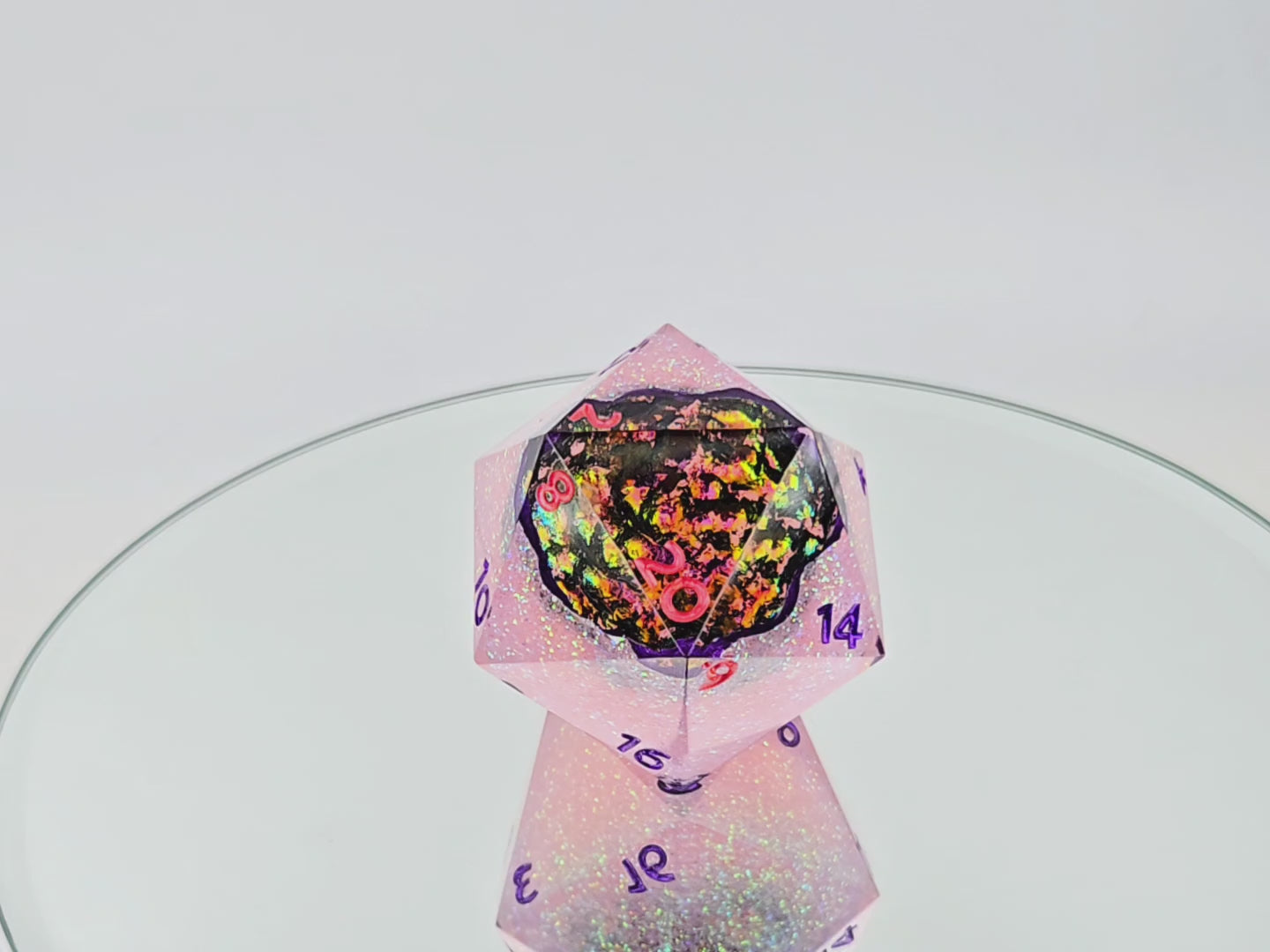 A large 35mm d20 designed to resemble a broken open geode. The geode body is a pink glitter with light green shifts, while the cavity is filled with a magenta to yellow-green shifting foil. The numbers are a dark metallic purple on most faces, and pink on the ones near the cavity where the purple would not show up (trust me, they all matched originally).