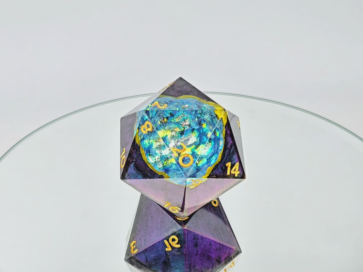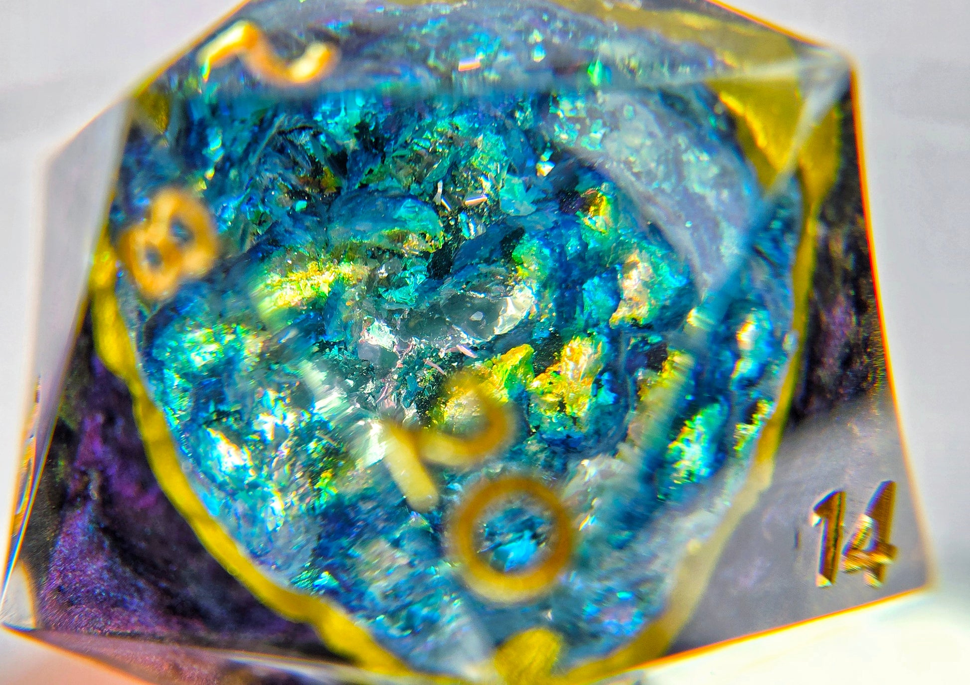 A large 35mm d20 designed to resemble a broken open geode. The geode body is a teal to purple colorshift (the same used in Time Stop), while the cavity is filled with a light blue to green shifting foil. The numbers are gold.