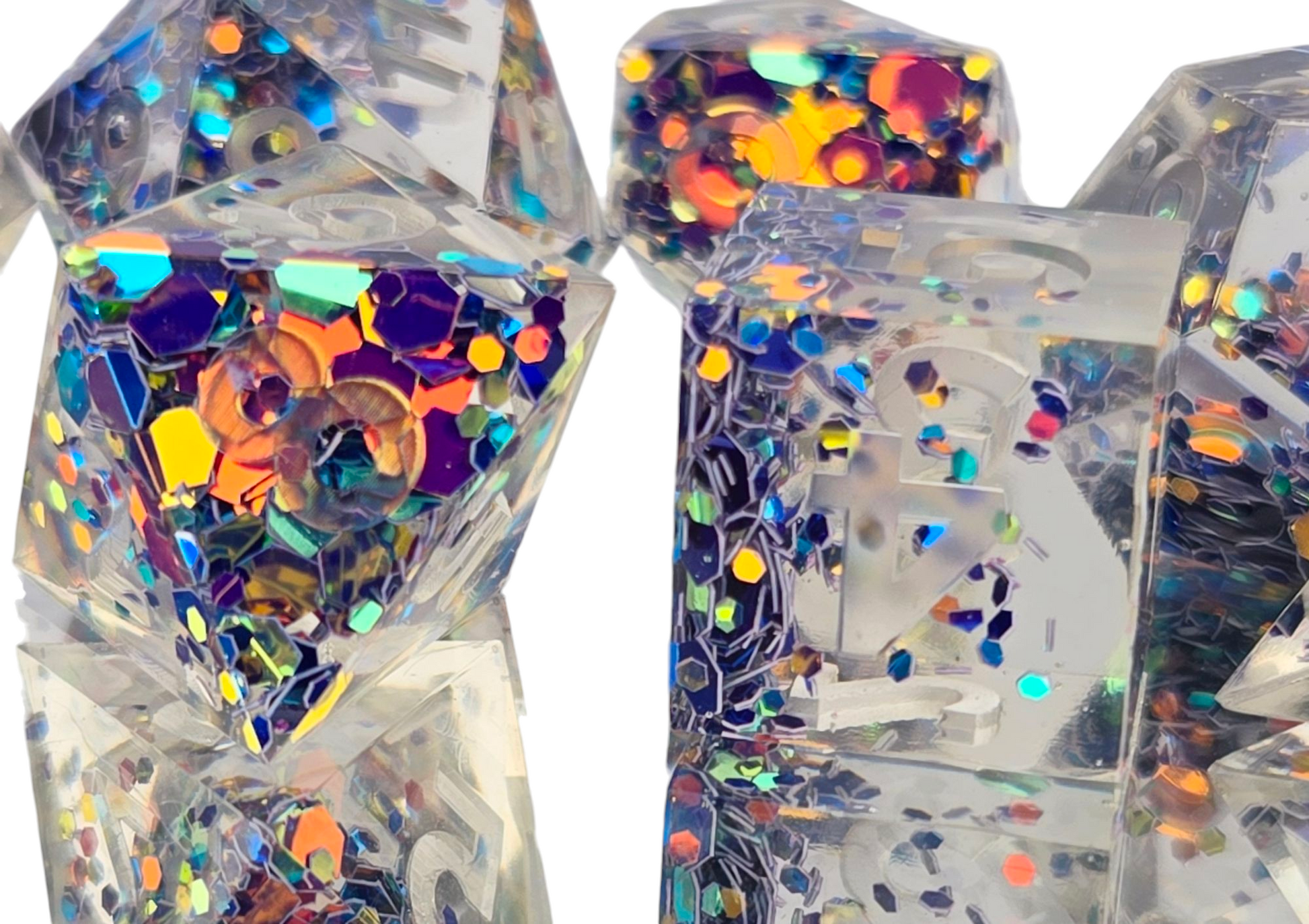 A full standard 7 piece polyhedral set (d20, d12, d%, d10, d8, d6, and d4) of a glitter test set. I don't have a more elegant explanation, I just didn't like them. The set is totally fine and usable! I just simply don't have time to spend on finishing sets I'm not excited about.