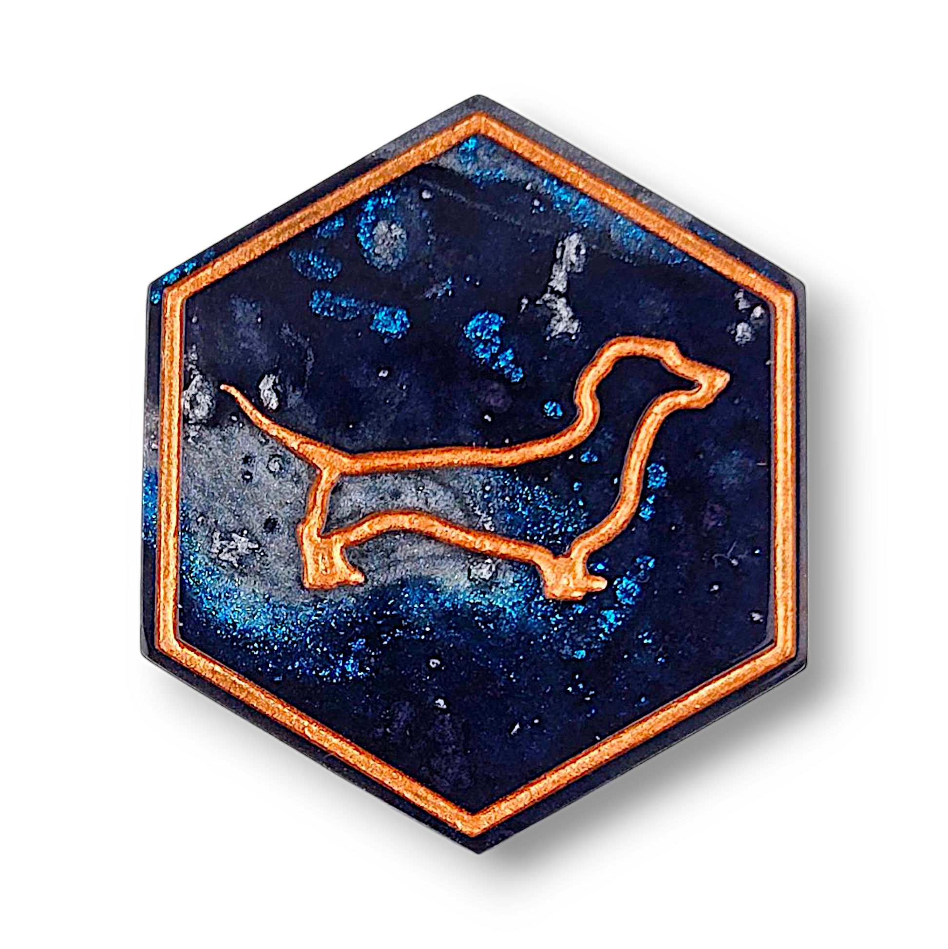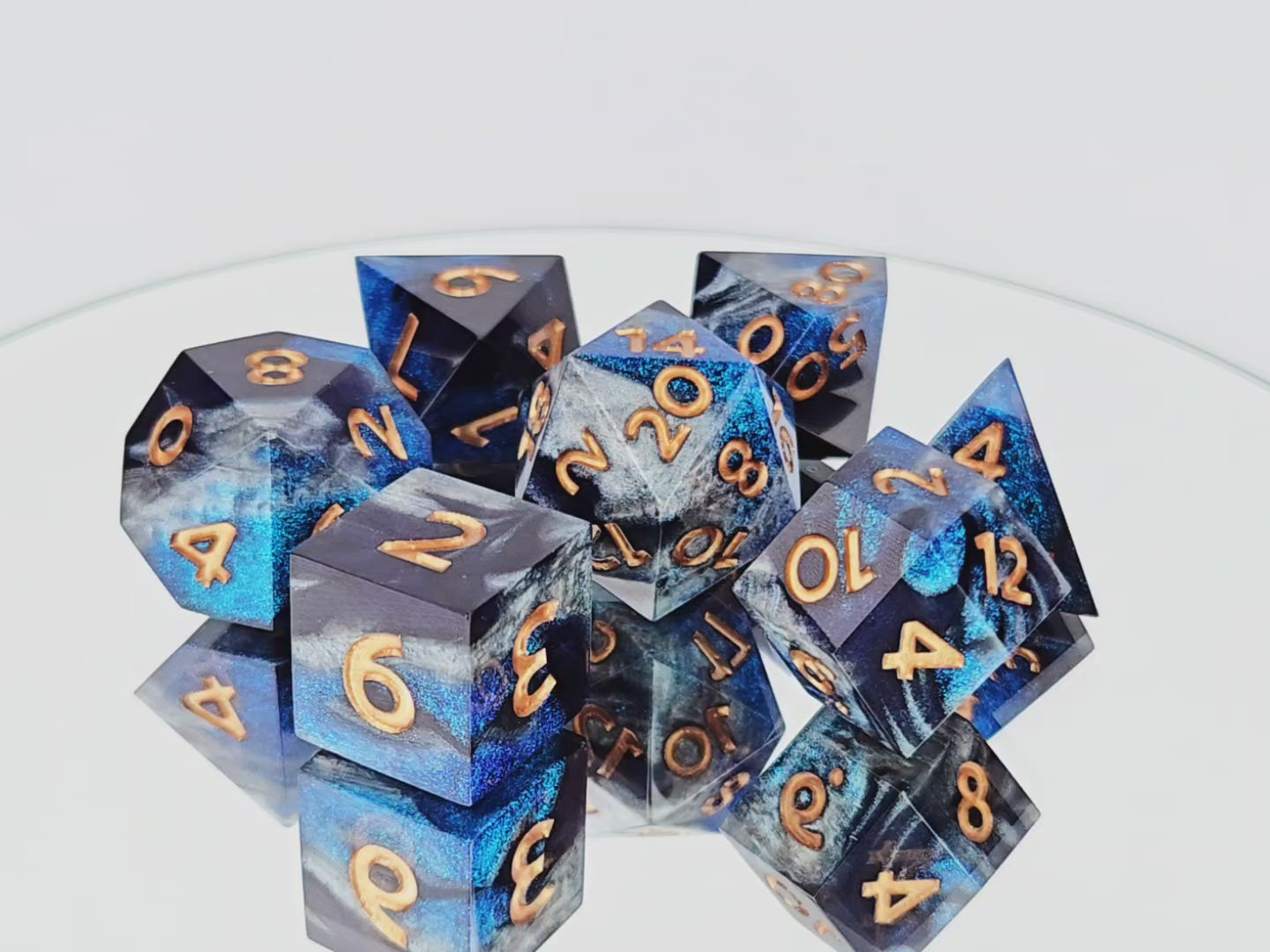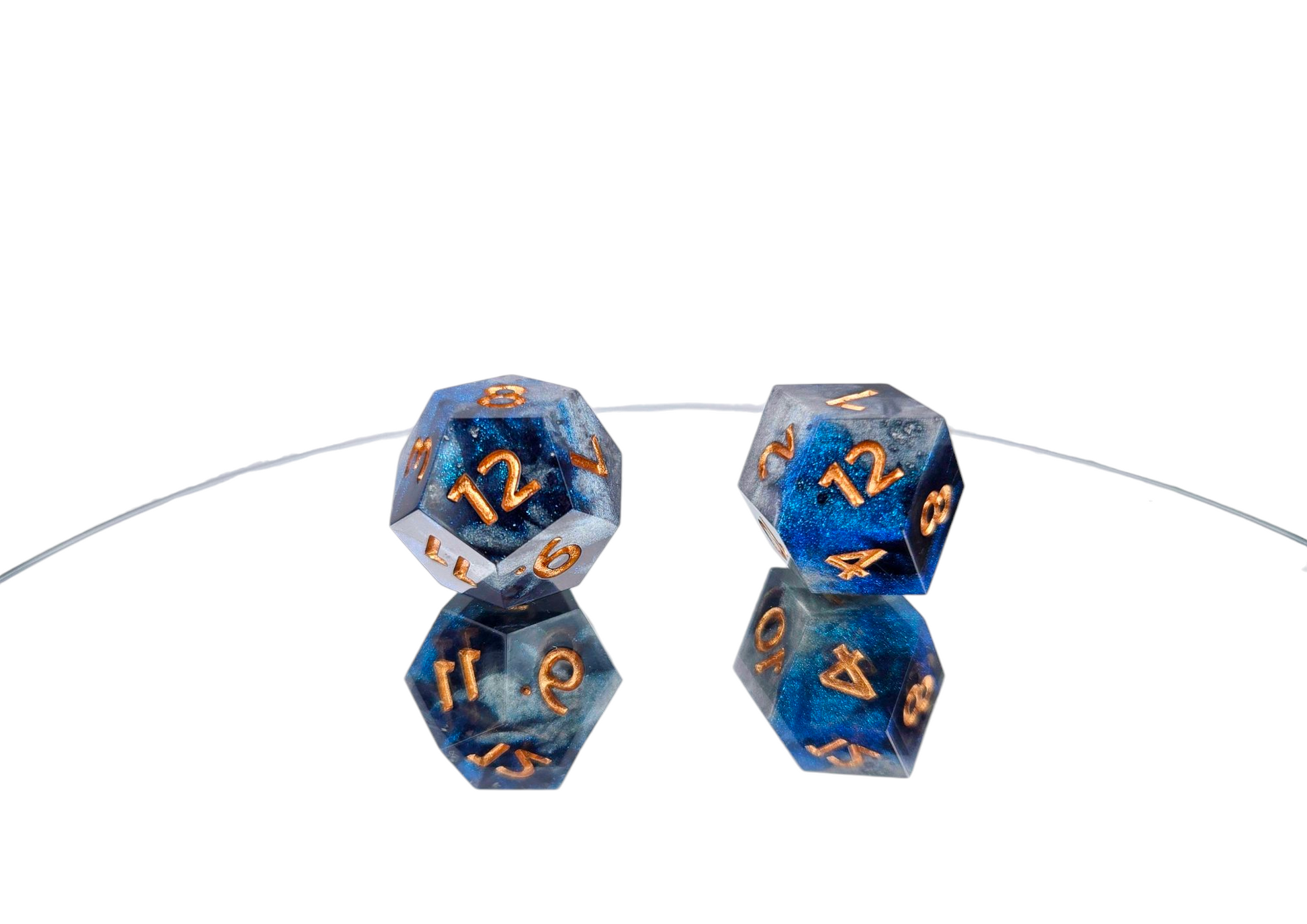 A full standard 7 piece polyhedral set (d20, d12, d%, d10, d8, d6, and d4) with swirls of silver and different shades of blue with and copper numbers. Set comes with your choice of d4 shape (standard, chamfered, or shard) and your choice of d12 shape (standard or rhombus). There is also a matching d2 coin currently available as well.