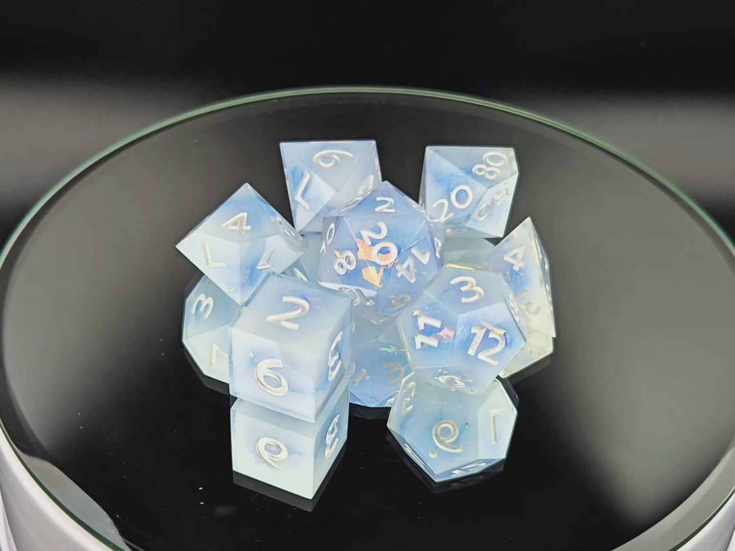 A full standard 7 piece polyhedral set (d20, d12, d%, d10, d8, d6, and d4) of soft blue-ish white resin with subtle blue sparkles and iridescent mylar inside and pearl white numbers. This set comes with your choice of d4 shape and d12 shape.