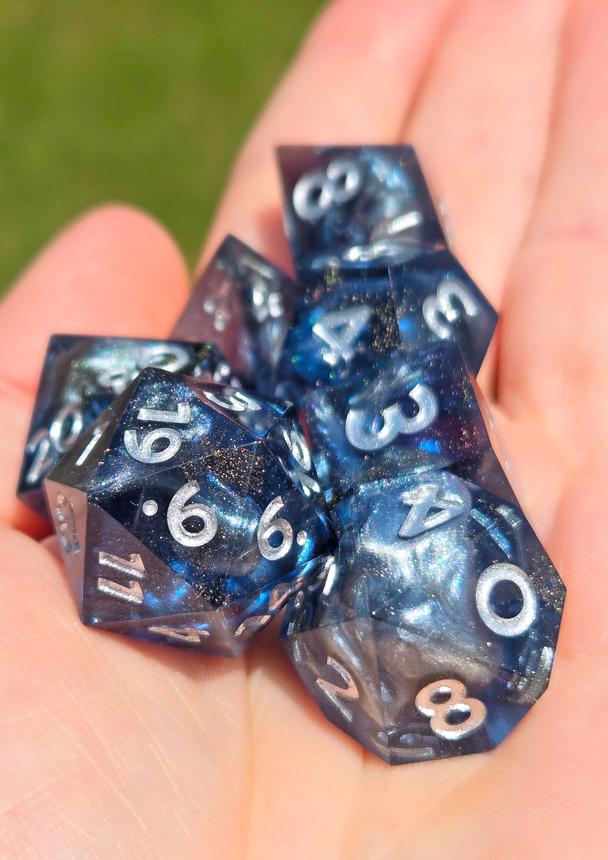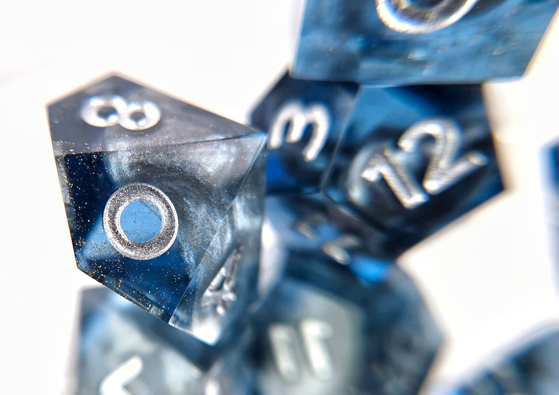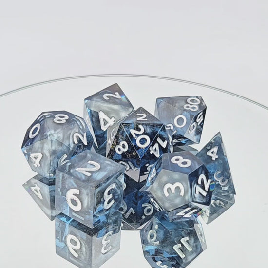 This standard 7 piece polyhedral set (d20, d12, d%, d10, d8, d6, and d4) features transparent grey-blue resin with swirls of shimmery silver inside and flecks of gold highlights, with silver numbers. In addition to the normal choice of a numbered d20 or a dach logo d20, this set comes with your choice of a standard d6 or one with the Sword and Key logo.