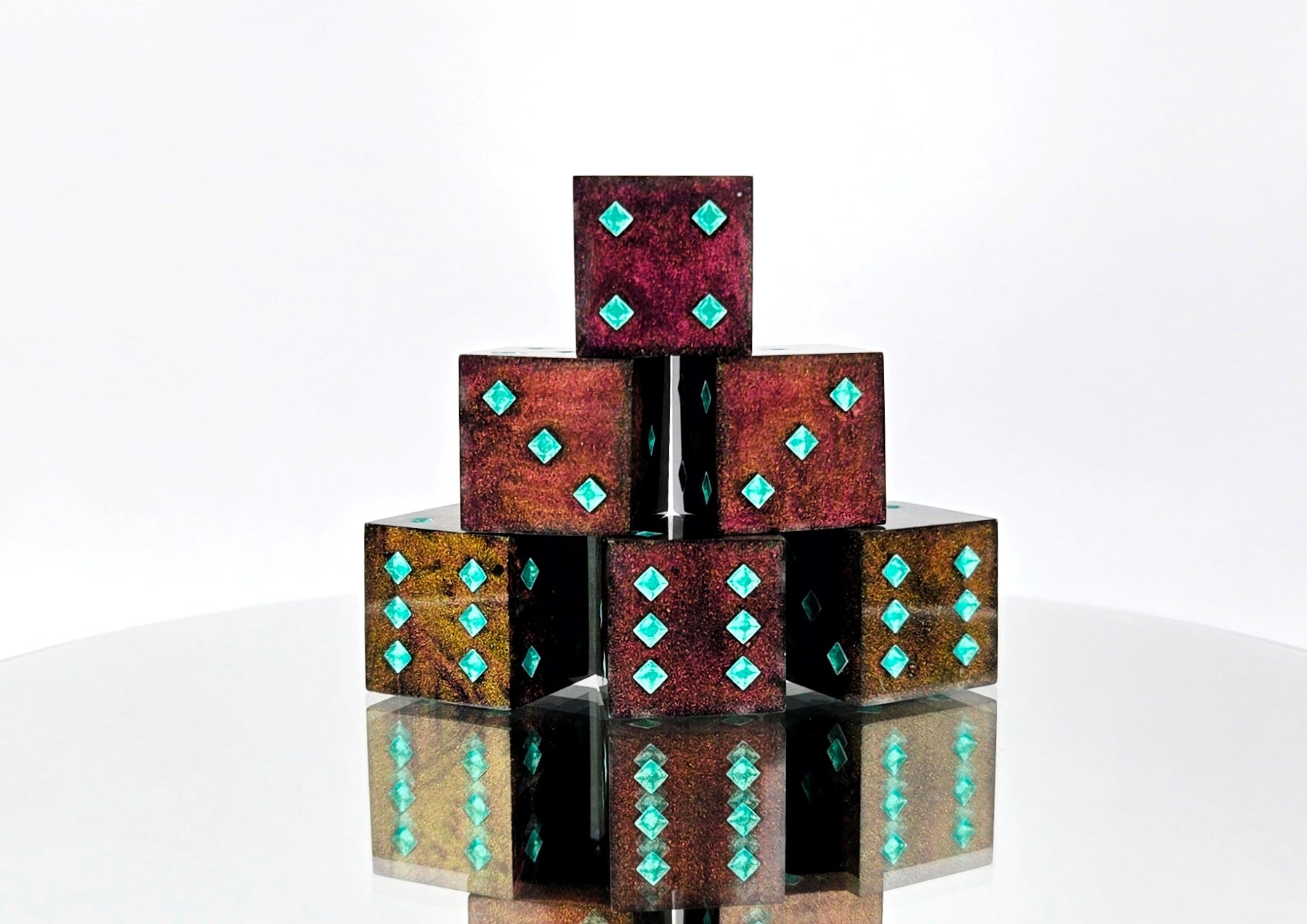 *Dice are entirely handmade from start to finish and therefore may have minor imperfections or color variations. Pictures are representative of the color and style but your exact set may vary. Please note color calibration of your screen may also vary. While they are just as balanced as commercially produced dice, it is recommended handmade dice be used for casual play only.