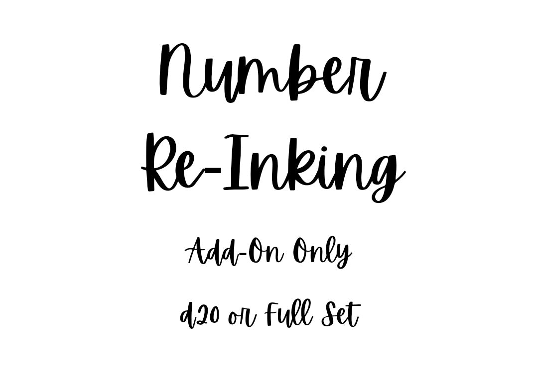Like a d20 or a set of dice but wish the numbers had been inked a different color? Add this to your order with the new color you'd like (and on which set, if your order contains multiple items) and I will re-ink the set in your desired color before shipping it out to you. Be sure to select the correct option for your item!