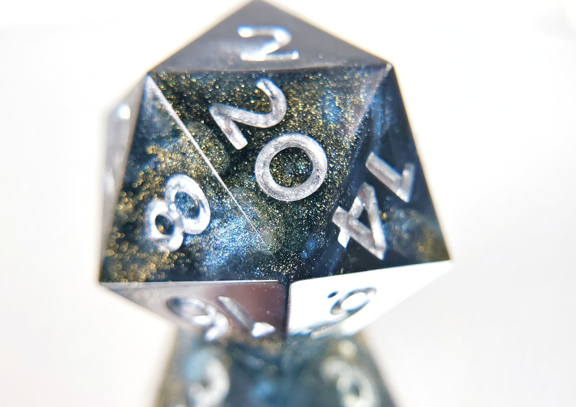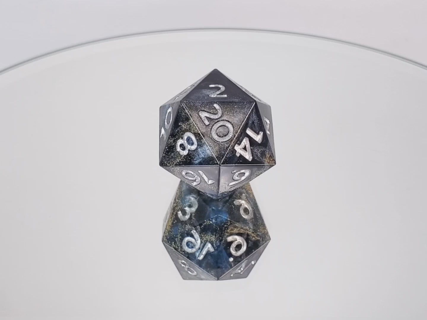 A standard sized d20 of transparent dark blue and opaque silver swirled together with flecks of gold and silver numbering.