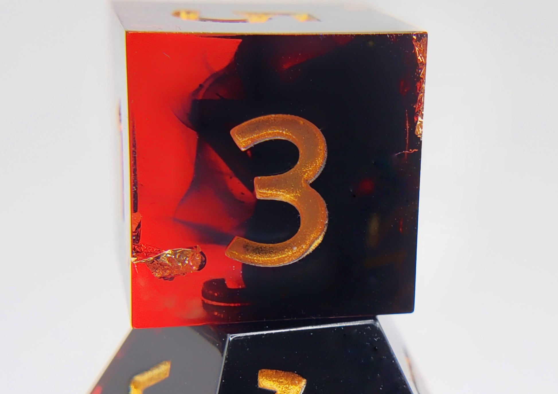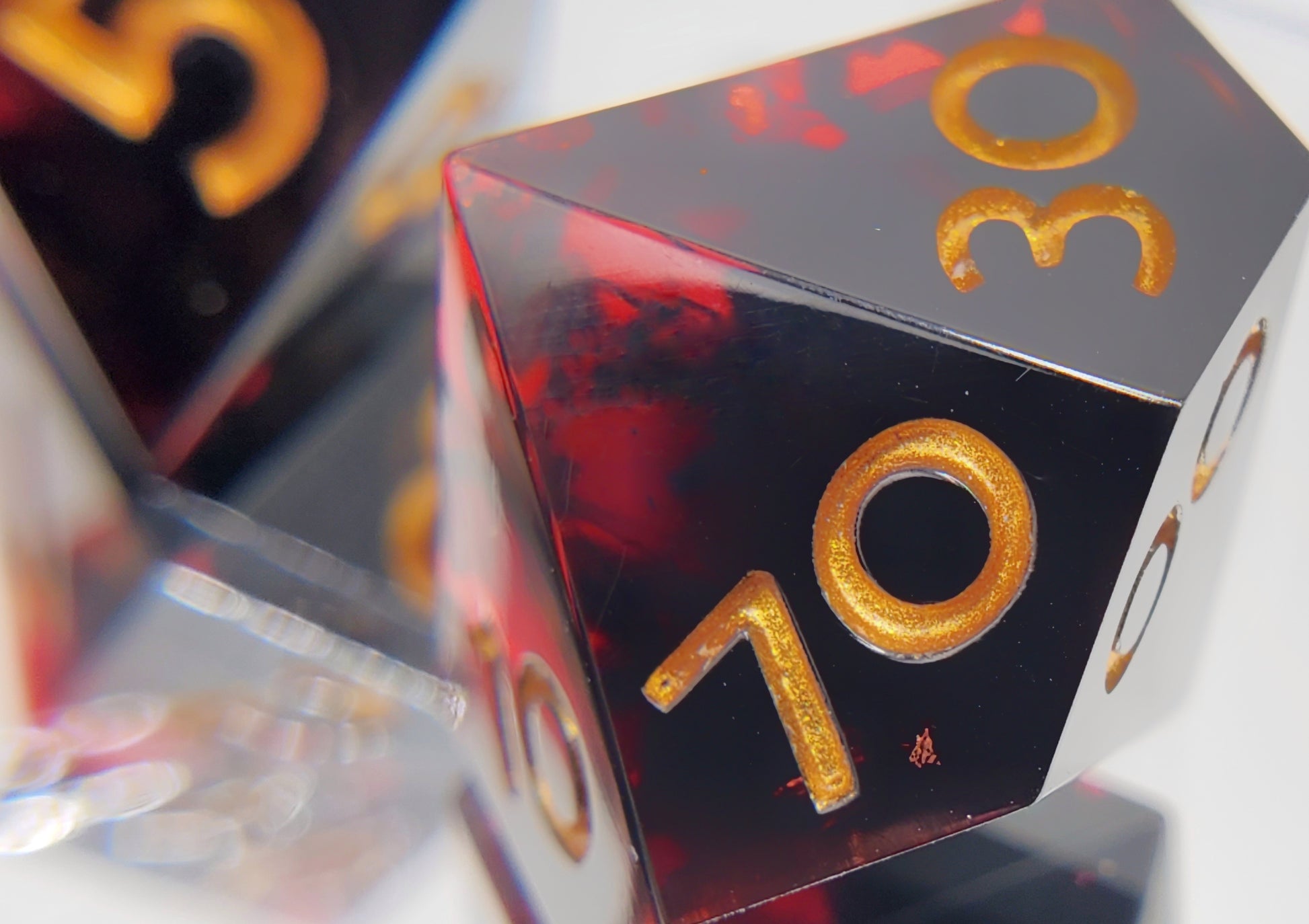 *Dice are entirely handmade from start to finish and therefore may have minor imperfections or color variations. Pictures are representative of the color and style but your exact set may vary. Please note color calibration of your screen may also vary. While they are just as balanced as commercially produced dice, it is recommended handmade dice be used for casual play only.