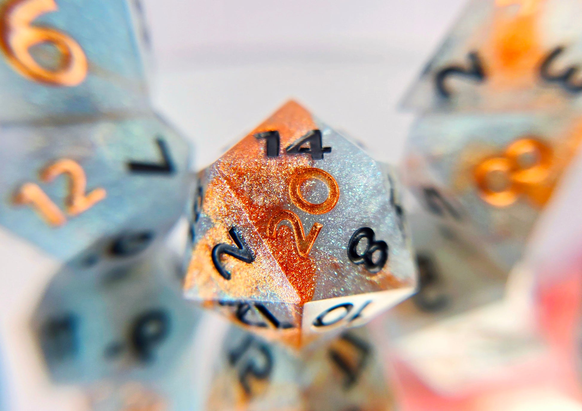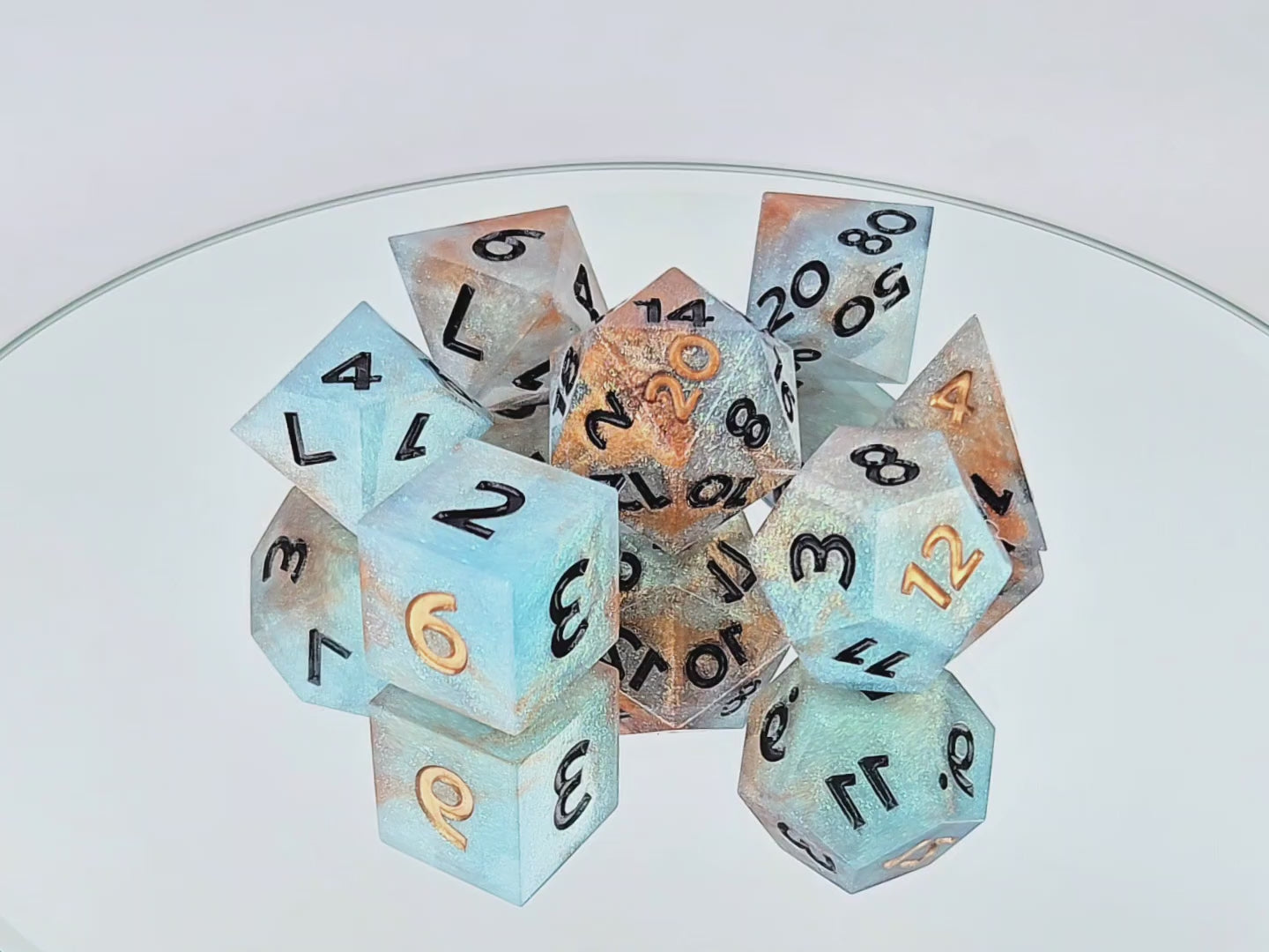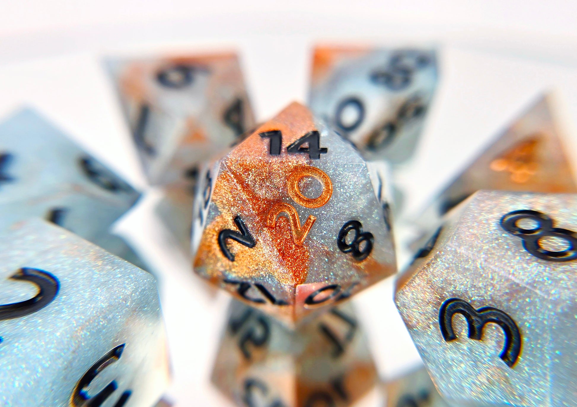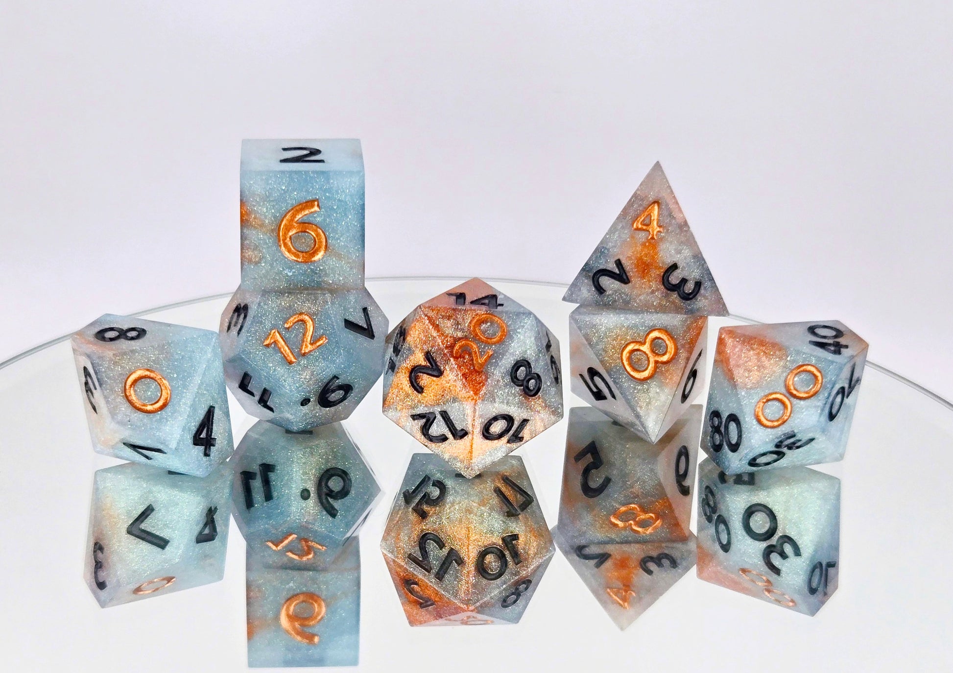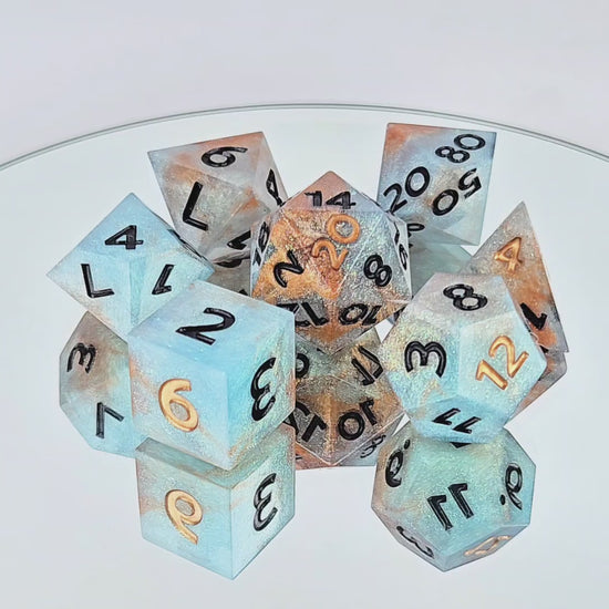 This standard 7 piece polyhedral set (d20, d12, d%, d10, d8, d6, and d4) features shimmery light blue resin with streaks of copper. The majority of the numbers are inked in metallic black, with the high faces done in copper. In addition to the normal choice of a numbered d20 or a dach logo d20, this set comes with your choice of a standard d6 or one with the Sword and Key logo.