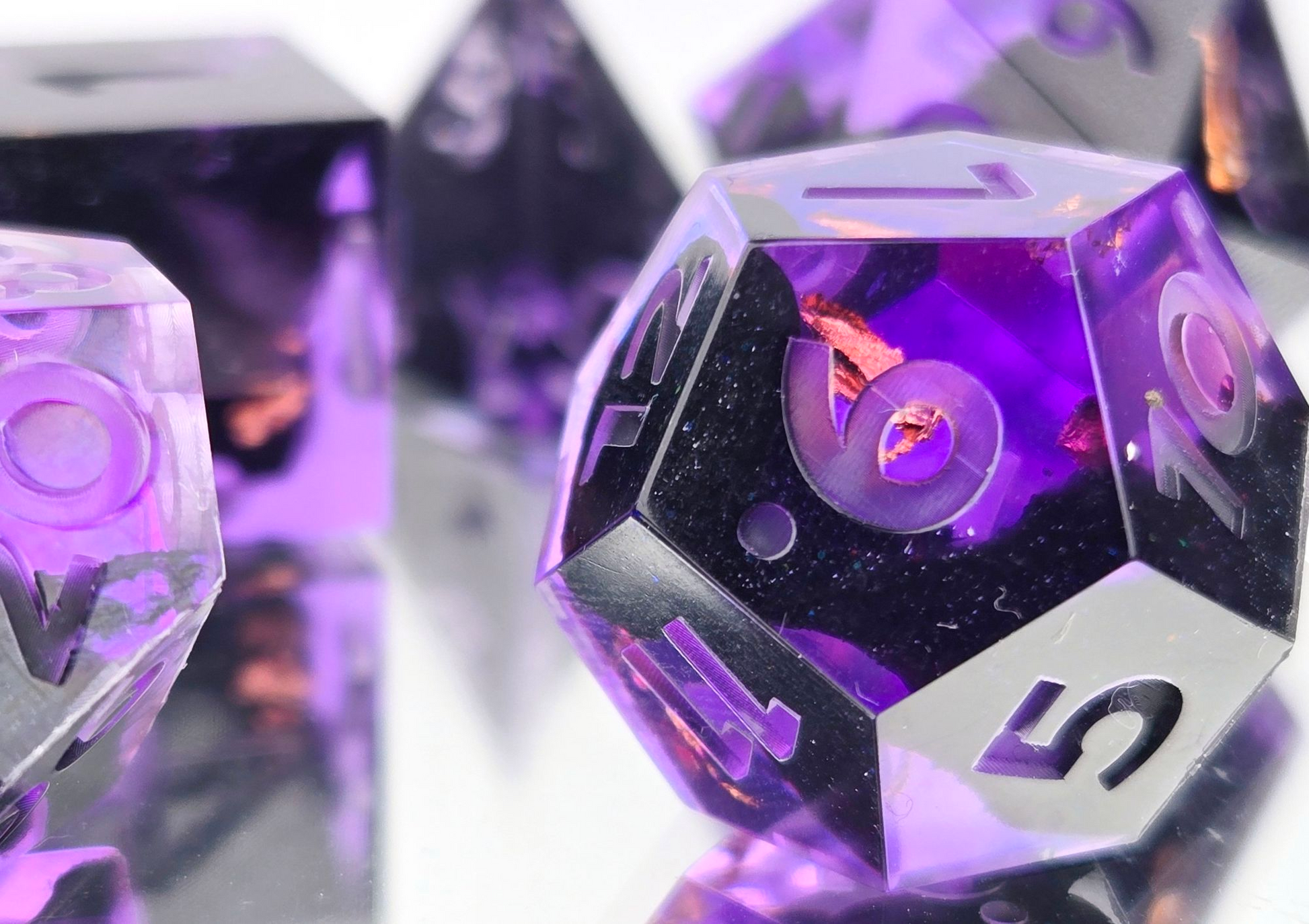 A full standard 7 piece polyhedral set (d20, d12, d%, d10, d8, d6, and d4) of a design test set. I don't have a more elegant explanation, they just didn't do what I wanted. The set is totally fine and usable! I just simply don't have time to spend on finishing sets I'm not excited about.