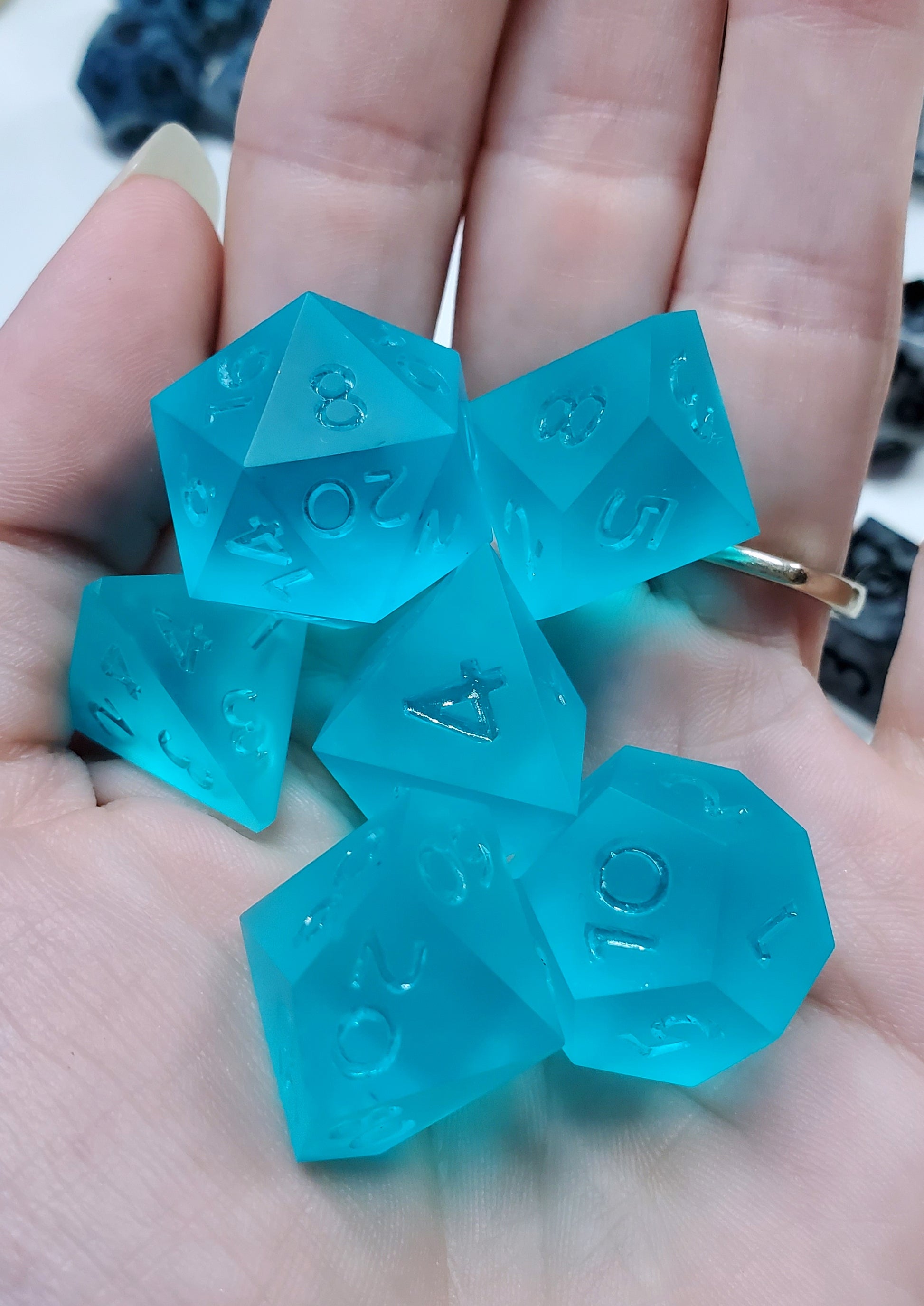 *Dice are entirely handmade from start to finish and therefore may have minor imperfections or color variations. Pictures are representative of the color and style but your exact set may vary. Please note color calibration of your screen may also vary. While they are just as balanced as commercially produced dice, it is recommended handmade dice be used for casual play only.