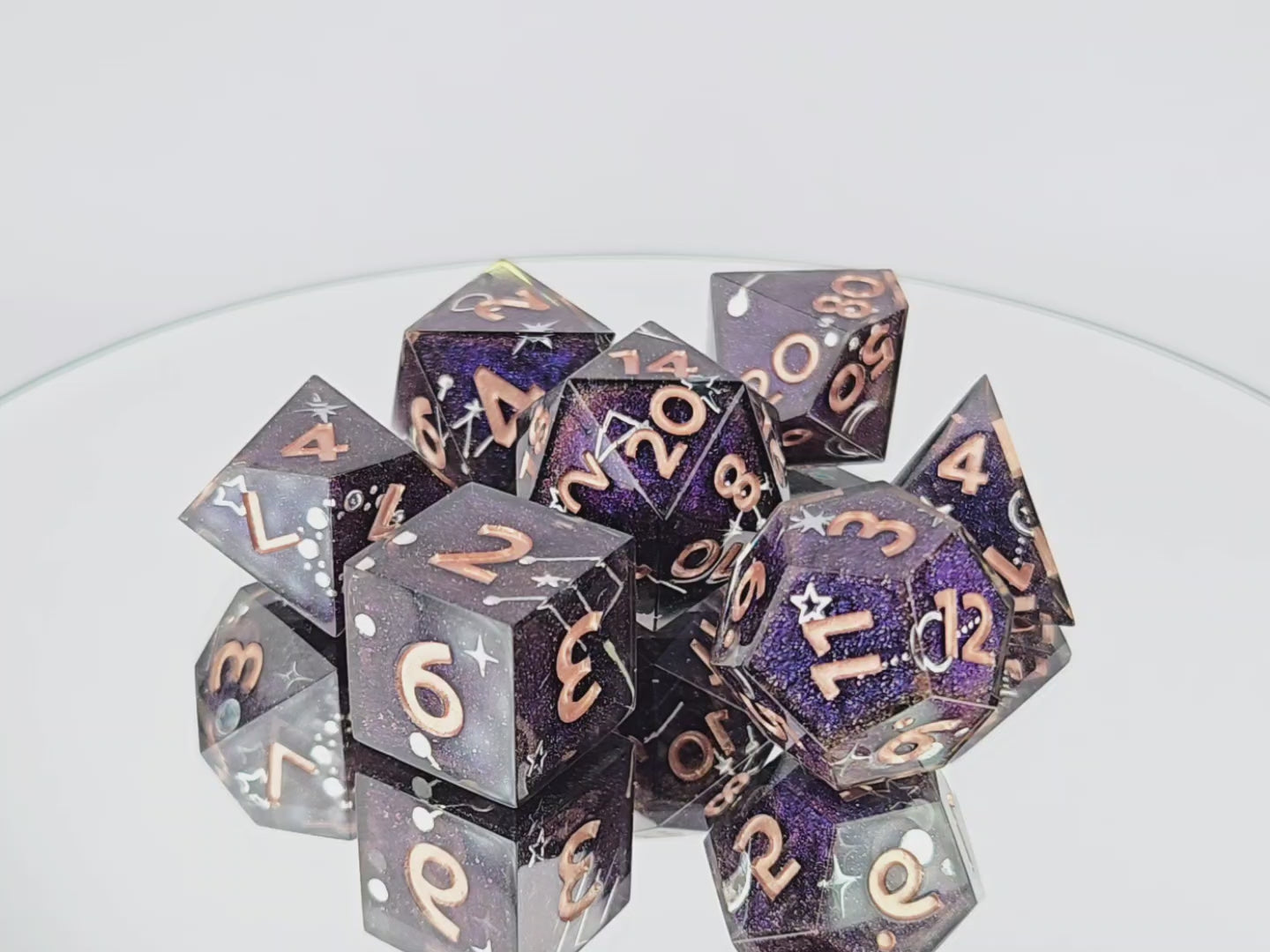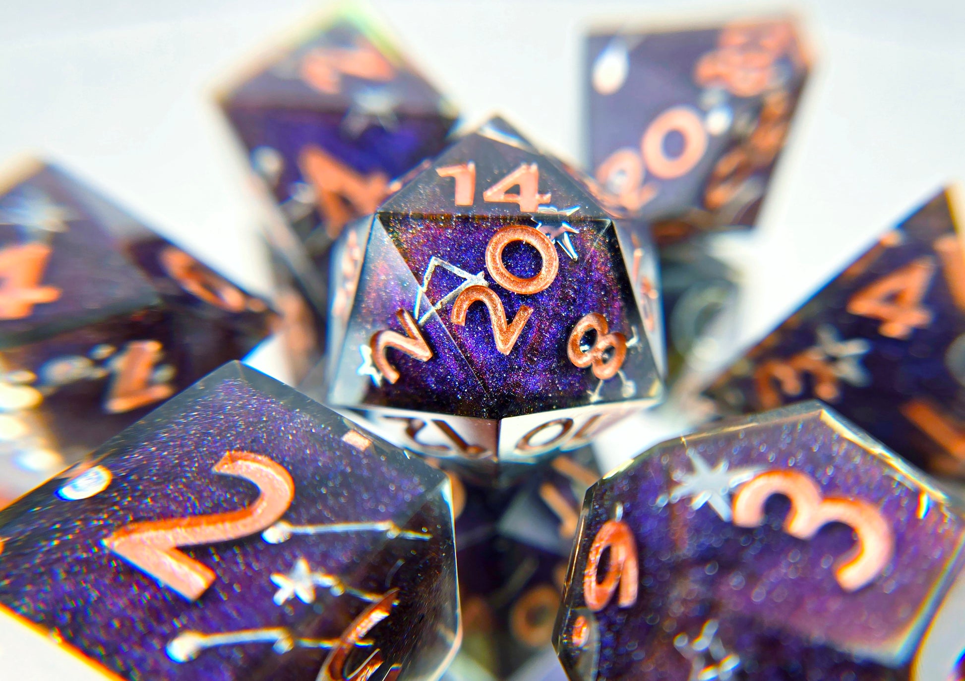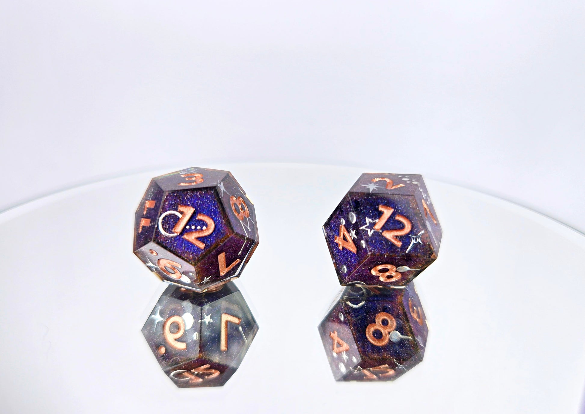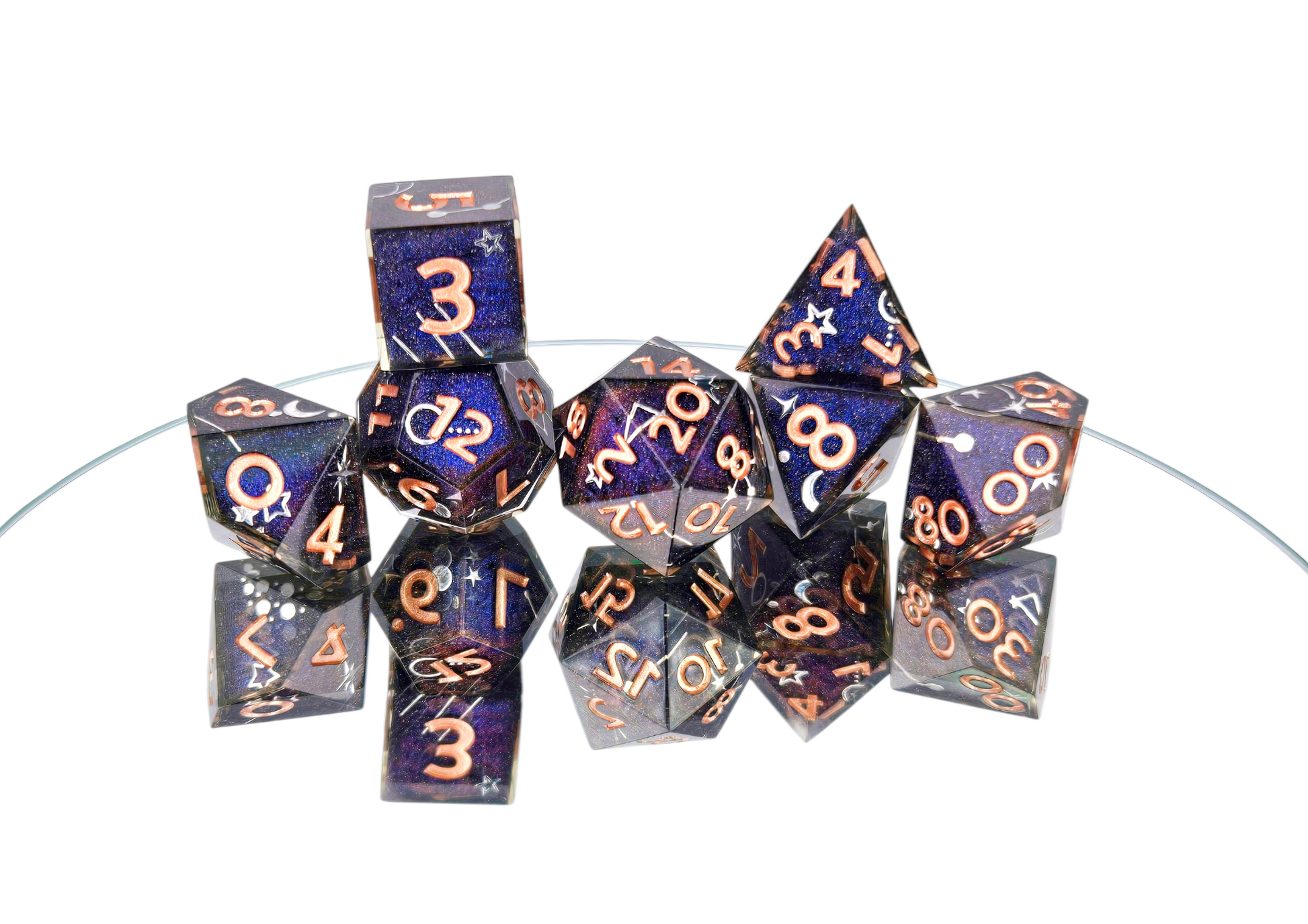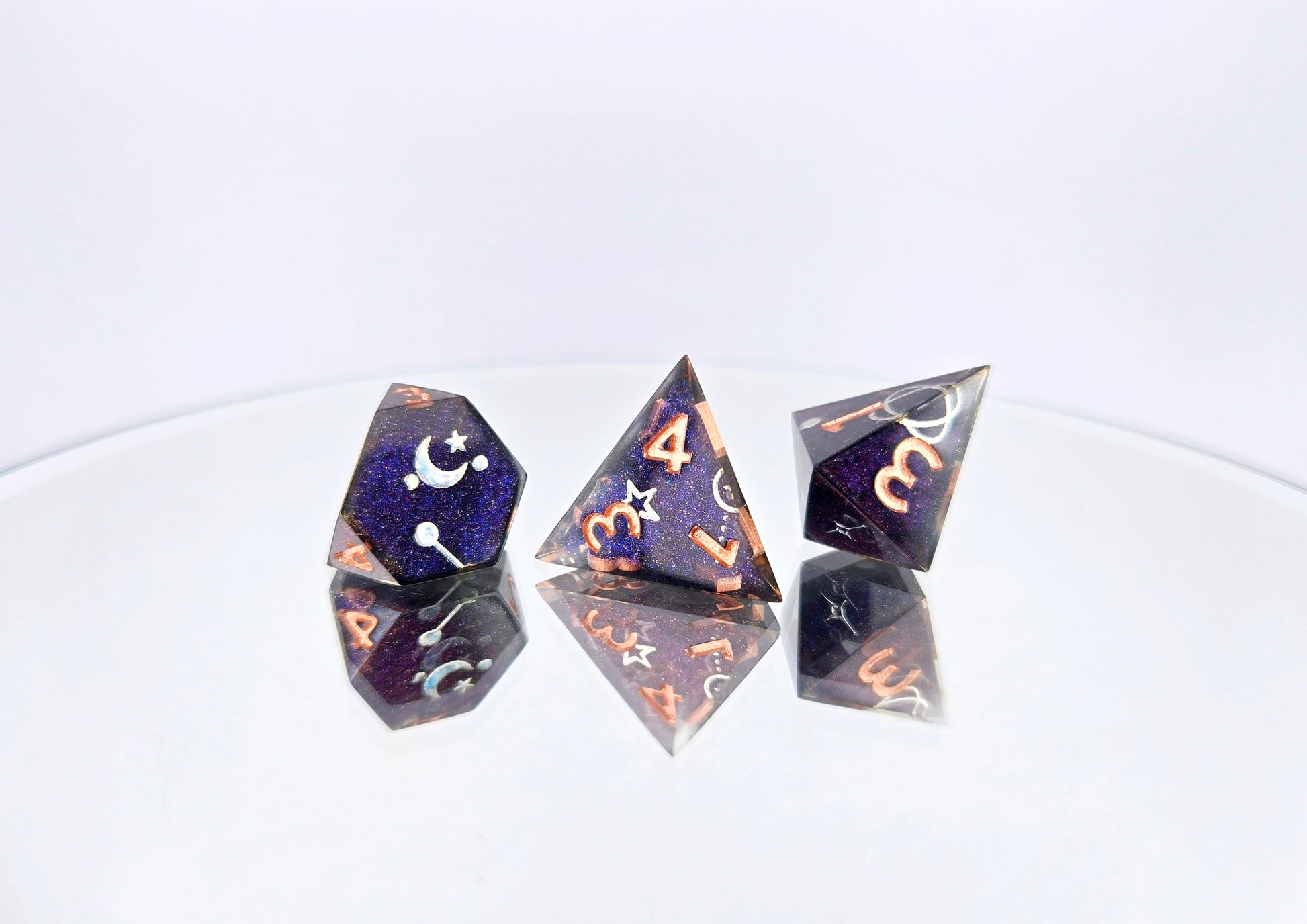 A full standard 7 piece polyhedral set (d20, d12, d%, d10, d8, d6, and d4) of spacey dark purple shifting shimmers with silver stars, moons, and other celestial shapes and rose gold numbers. You may choose either a standard or rhombus d12, as well as either a standard, chamfered, or shard d4.
