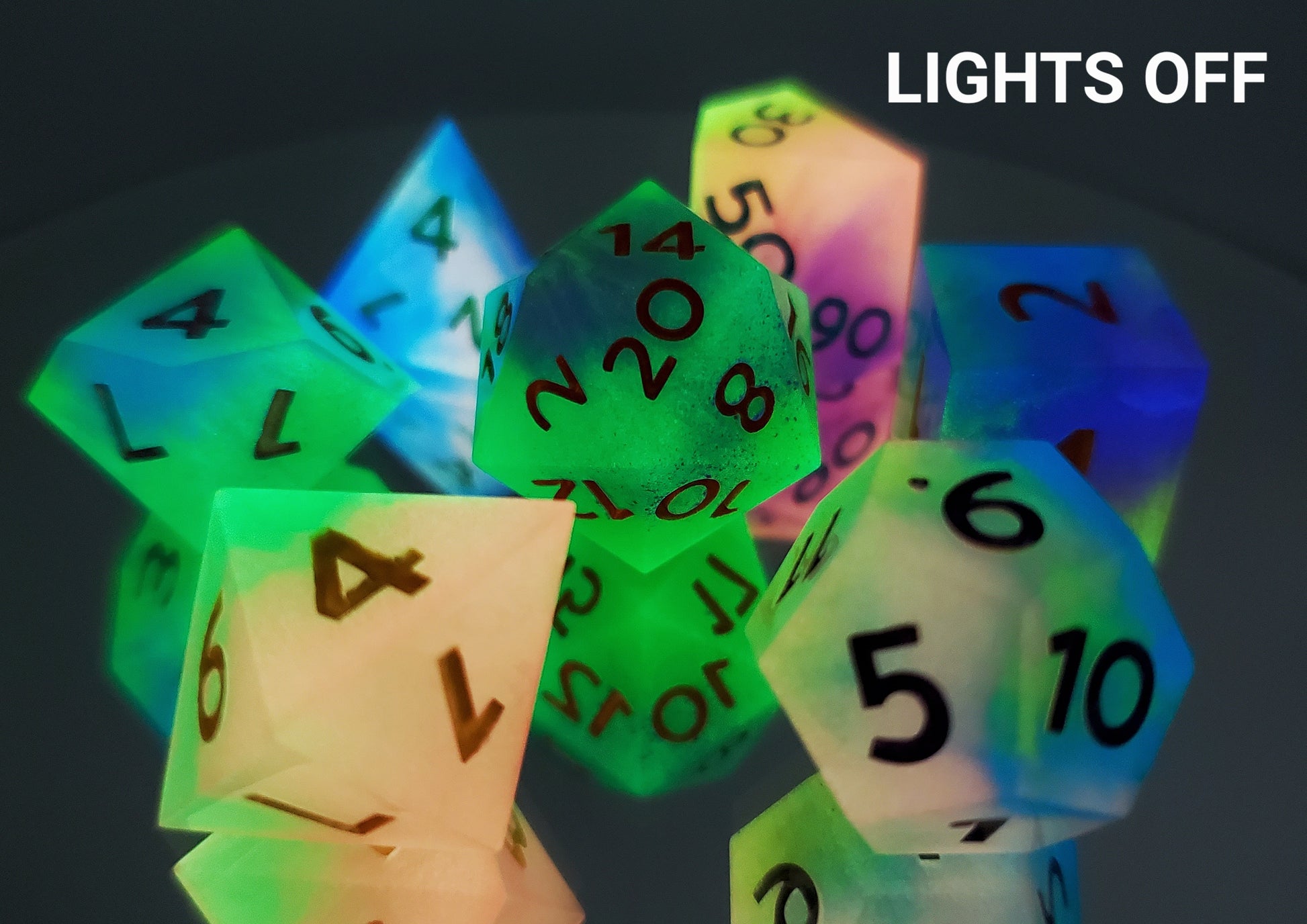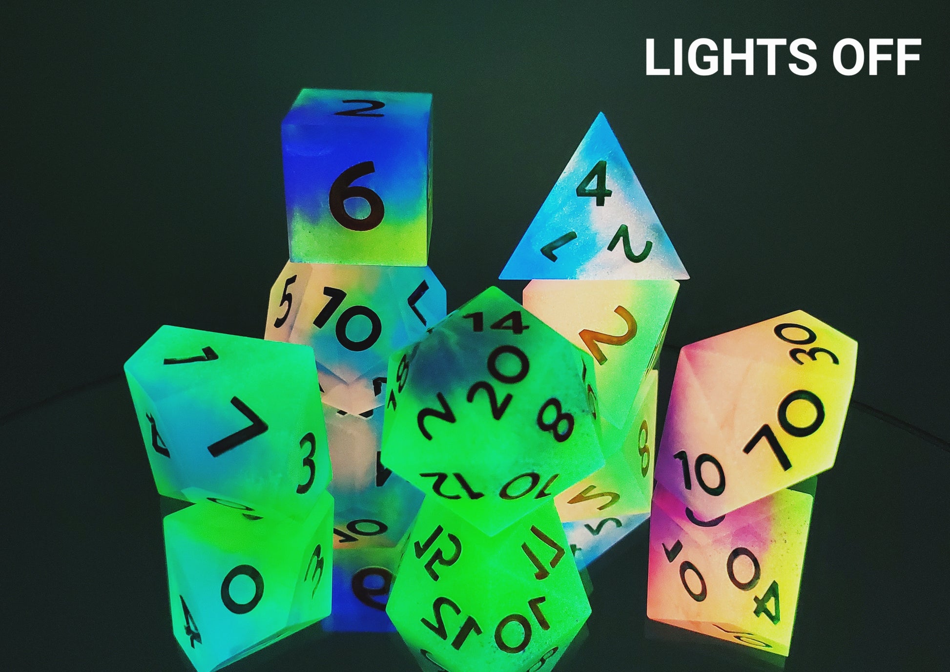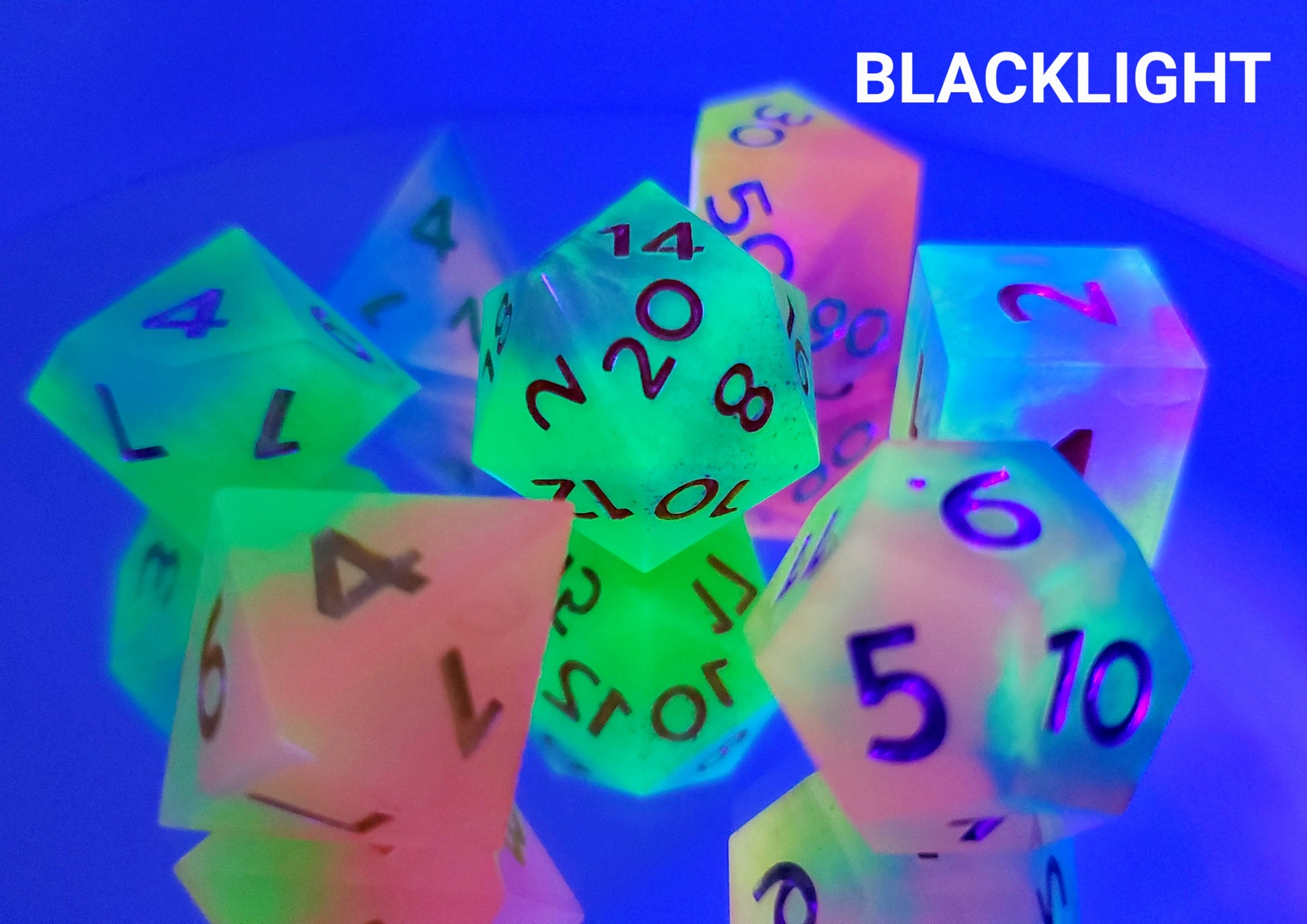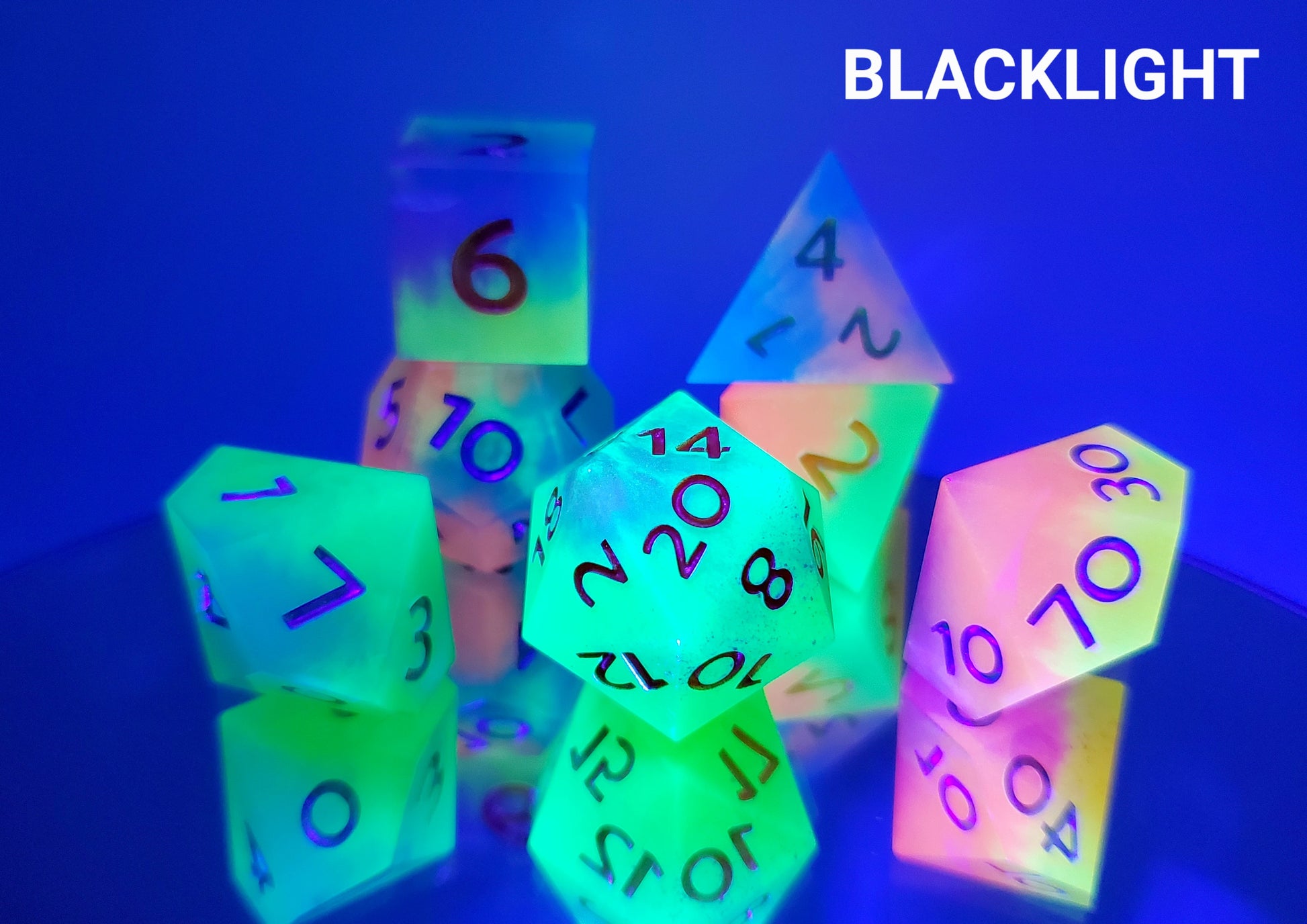 A full standard 7 piece polyhedral set (d20, d12, d%, d10, d8, d6, and d4) of neon glow-in-the-dark dice with bright numbering. Every set is unique and no color combination is the same.