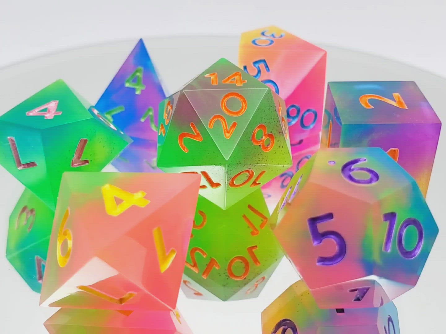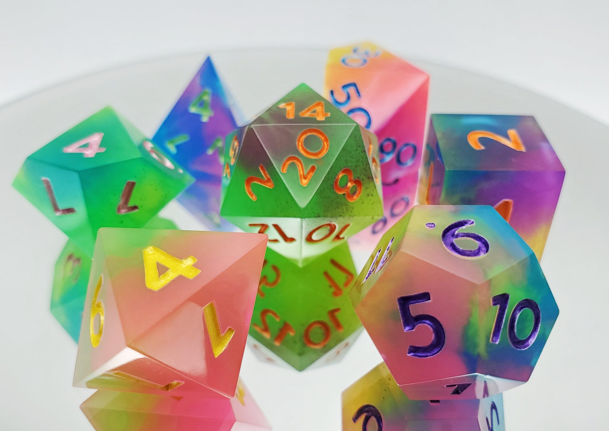 *Dice are entirely handmade from start to finish and therefore may have minor imperfections or color variations. Pictures are representative of the color and style but your exact set may vary. Please note color calibration of your screen may also vary. While they are just as balanced as commercially produced dice, it is recommended handmade dice be used for casual play only.