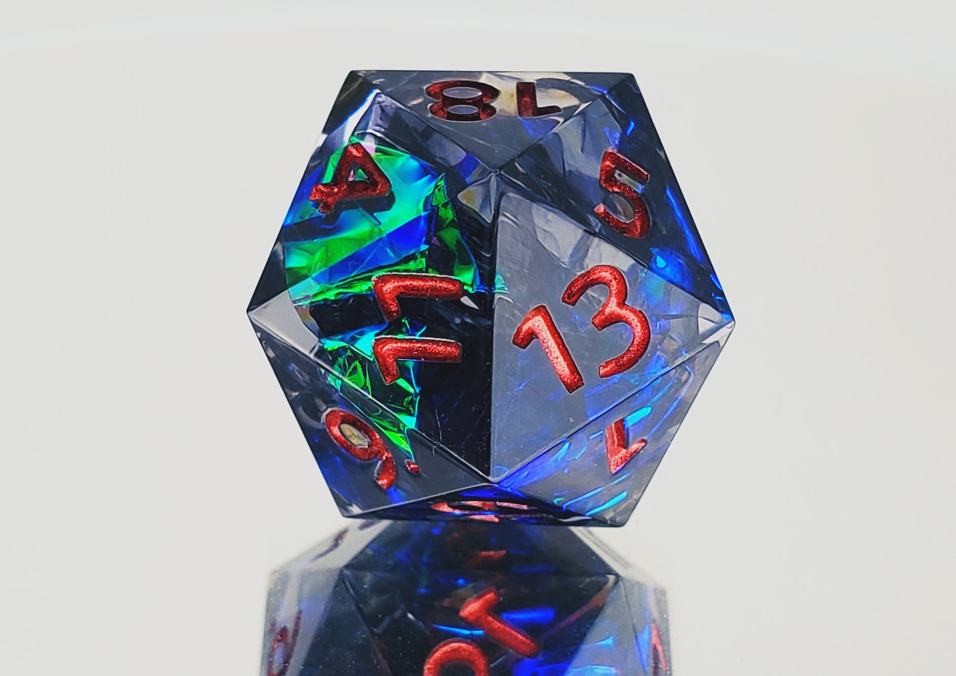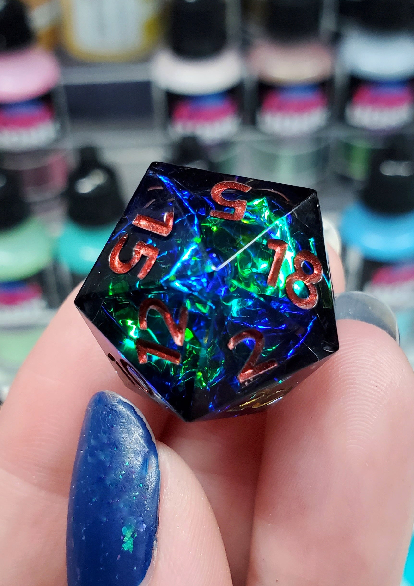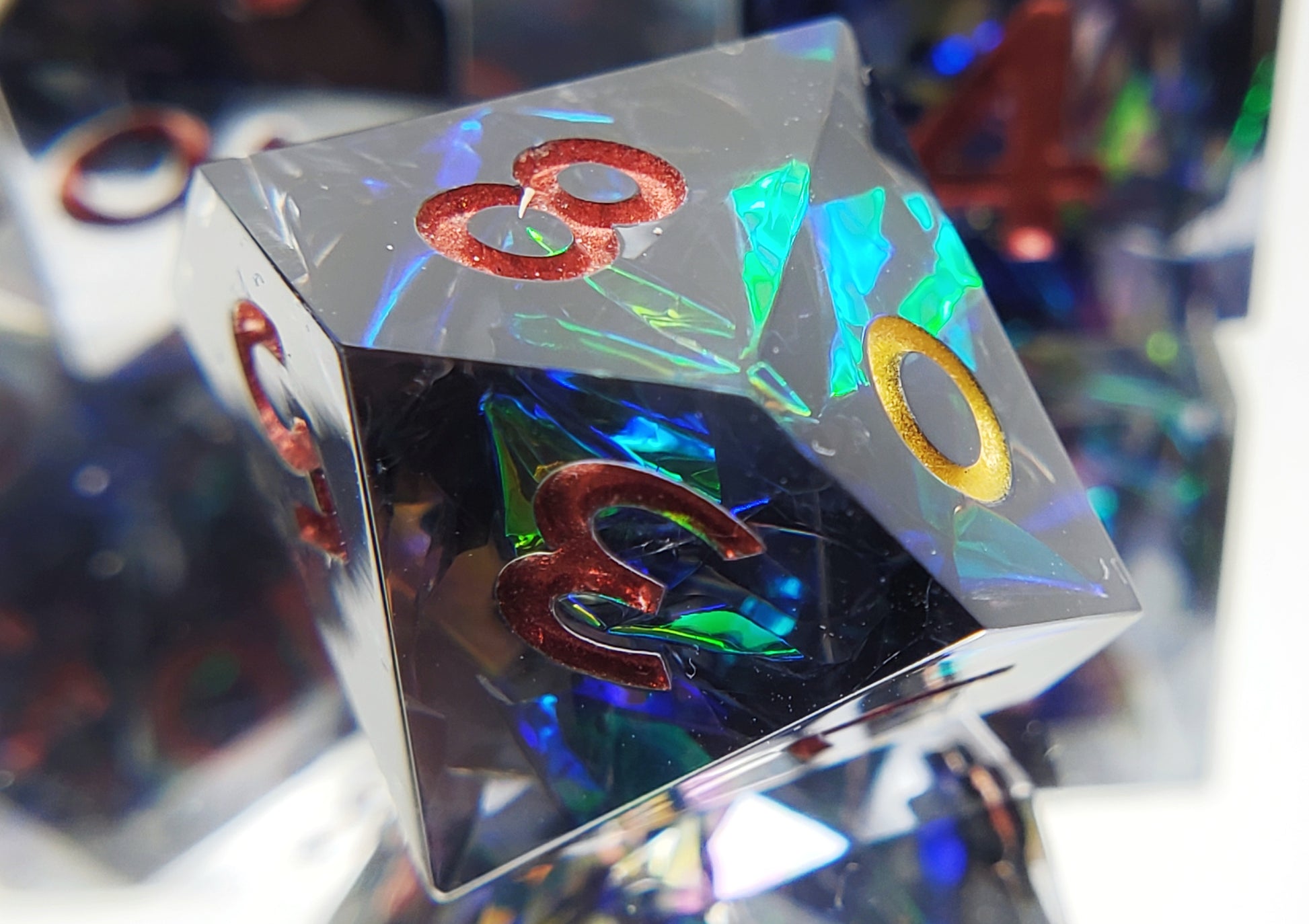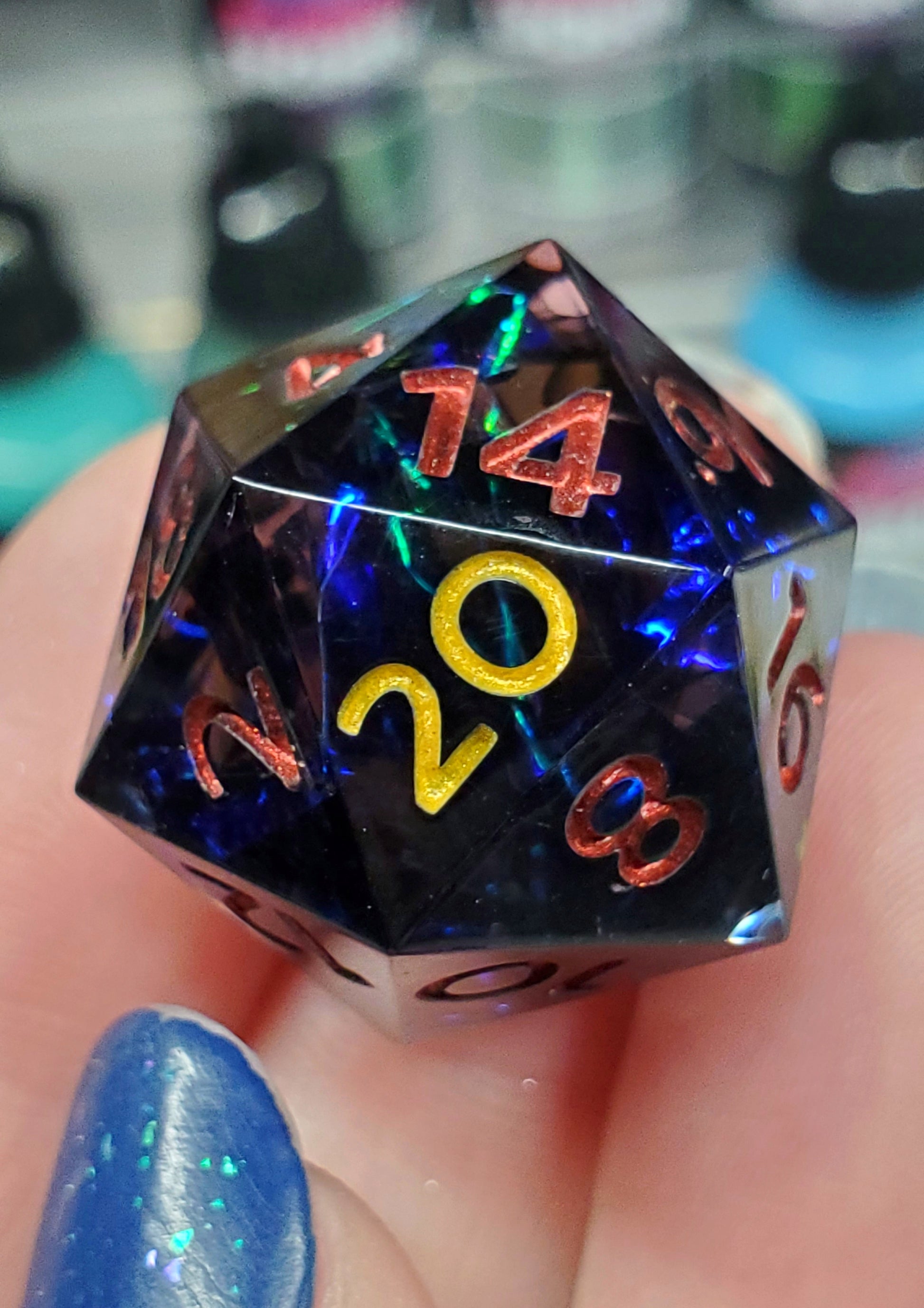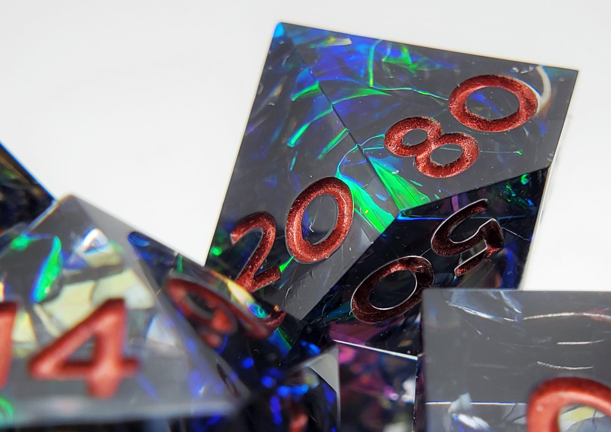 *Dice are entirely handmade from start to finish and therefore may have minor imperfections or color variations. Pictures are representative of the color and style but your exact set may vary. Please note color calibration of your screen may also vary. While they are just as balanced as commercially produced dice, it is recommended handmade dice be used for casual play only
