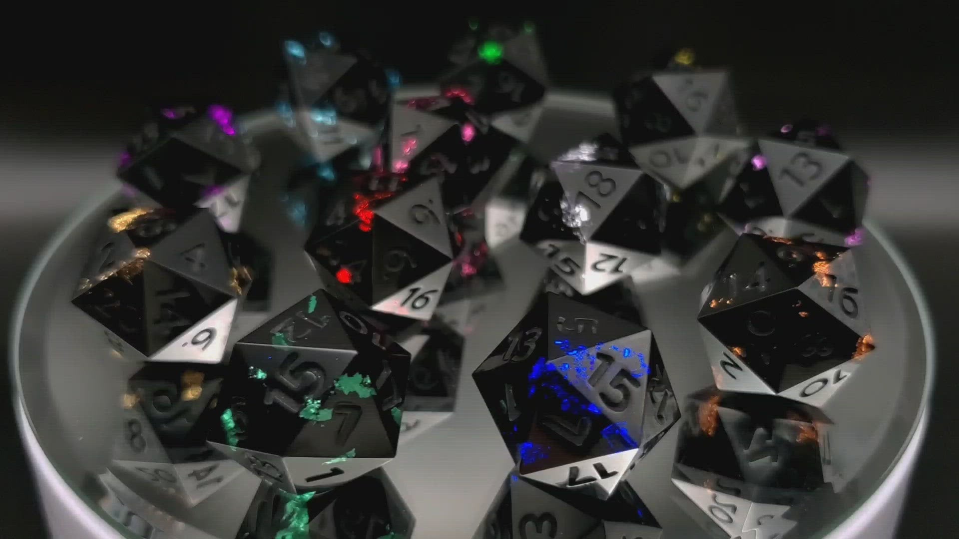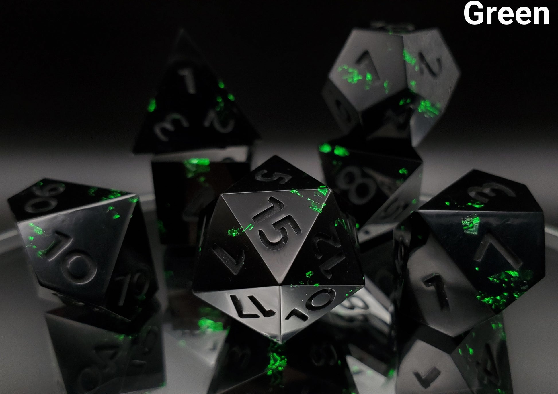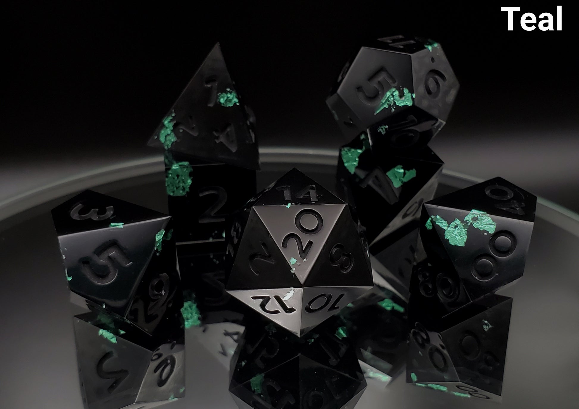 A full standard 7 piece polyhedral set (d20, d12, d%, d10, d8, d6, and d4) of black-on-black dice and your choice of accent foil color.