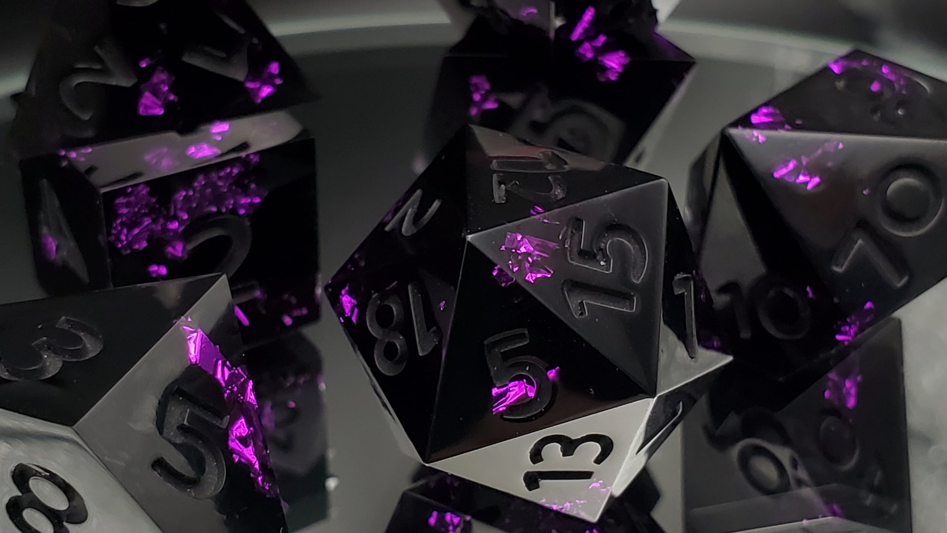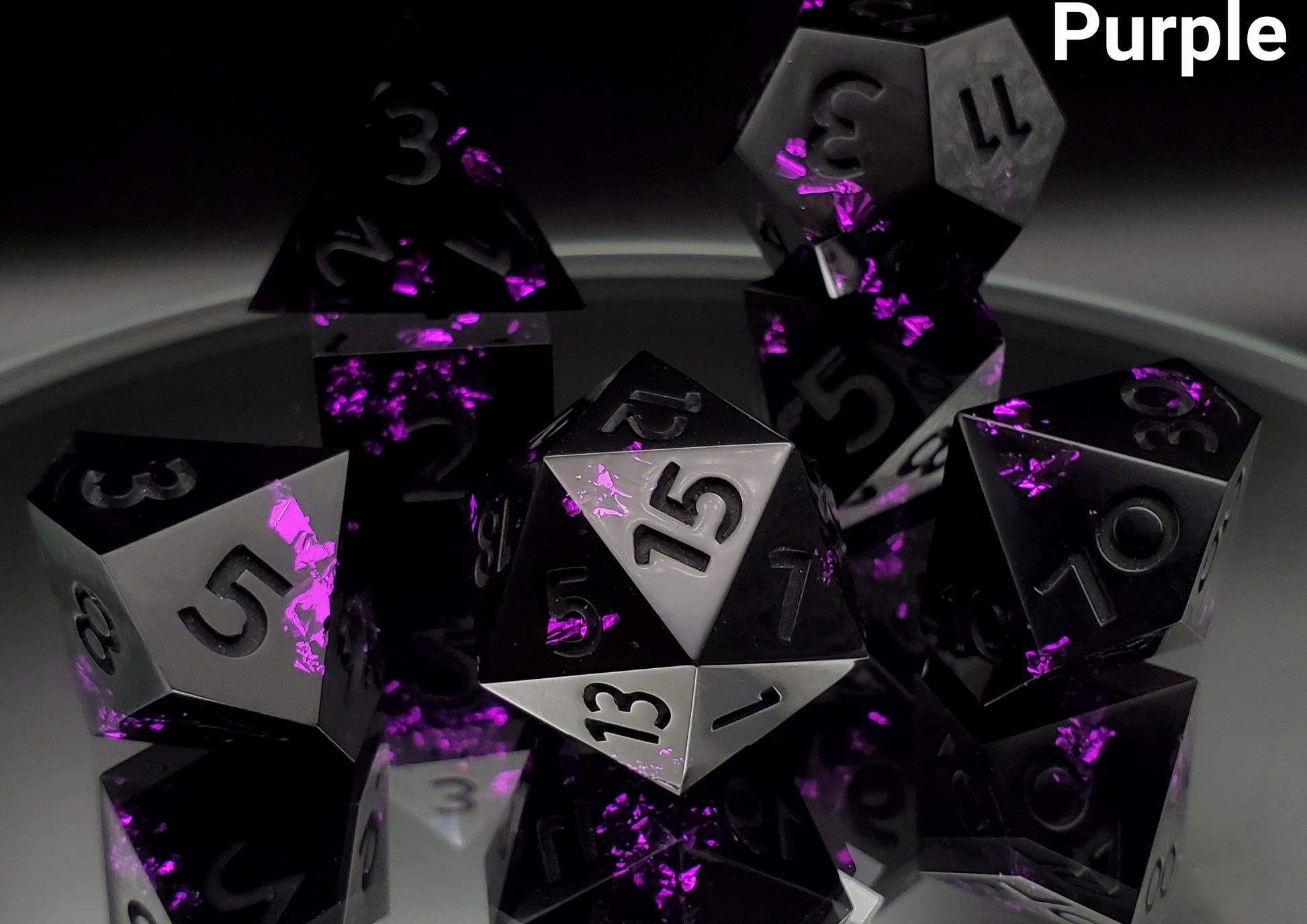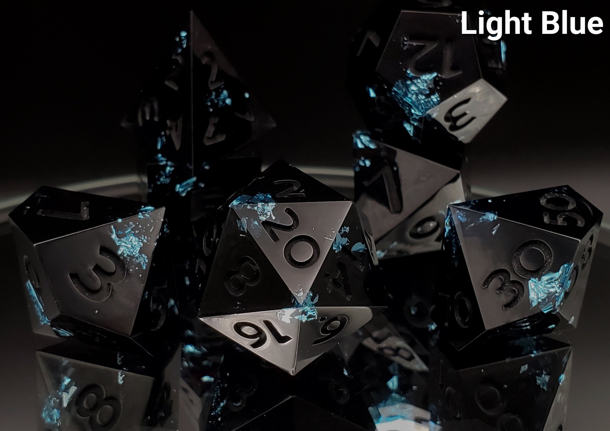 A full standard 7 piece polyhedral set (d20, d12, d%, d10, d8, d6, and d4) of black-on-black dice and your choice of accent foil color.