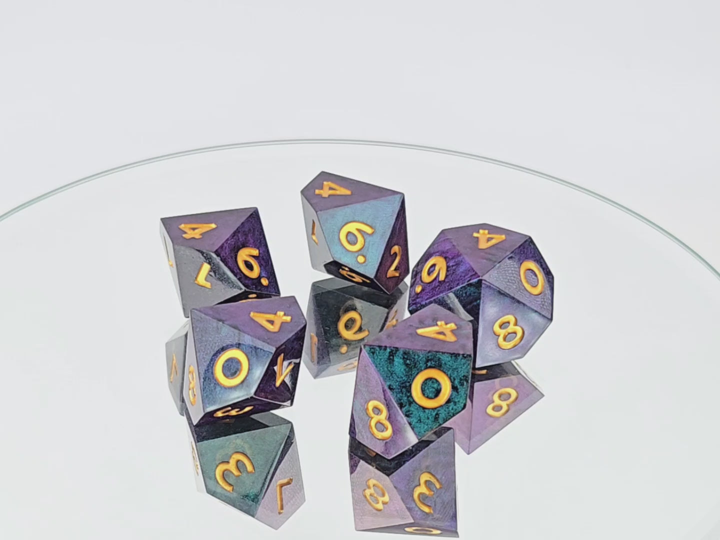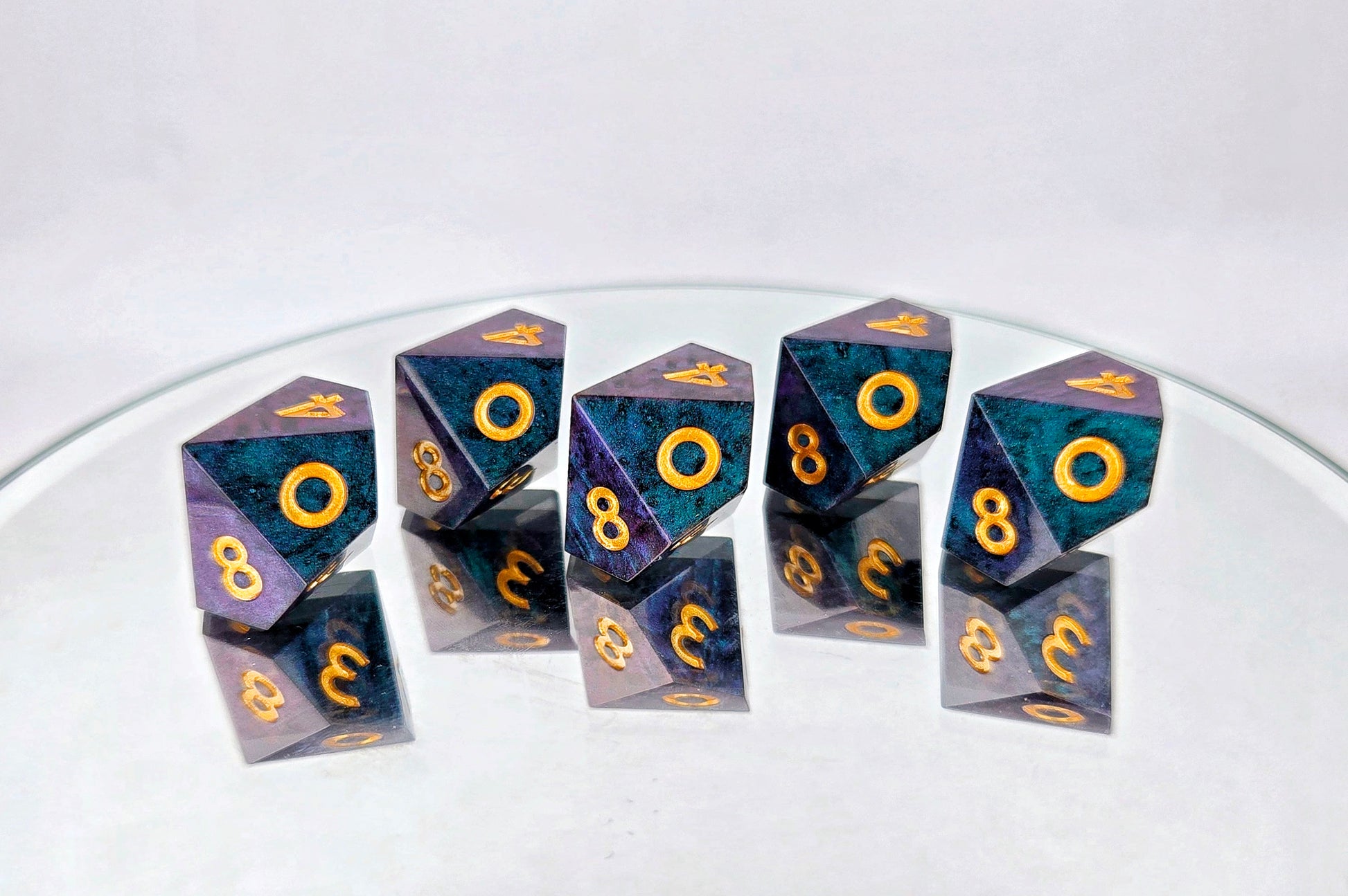 A set of 5 d10 dice of colorshifting pigments teal to purple pigments and changes appearance based on the lighting! Inked with gold numbers.