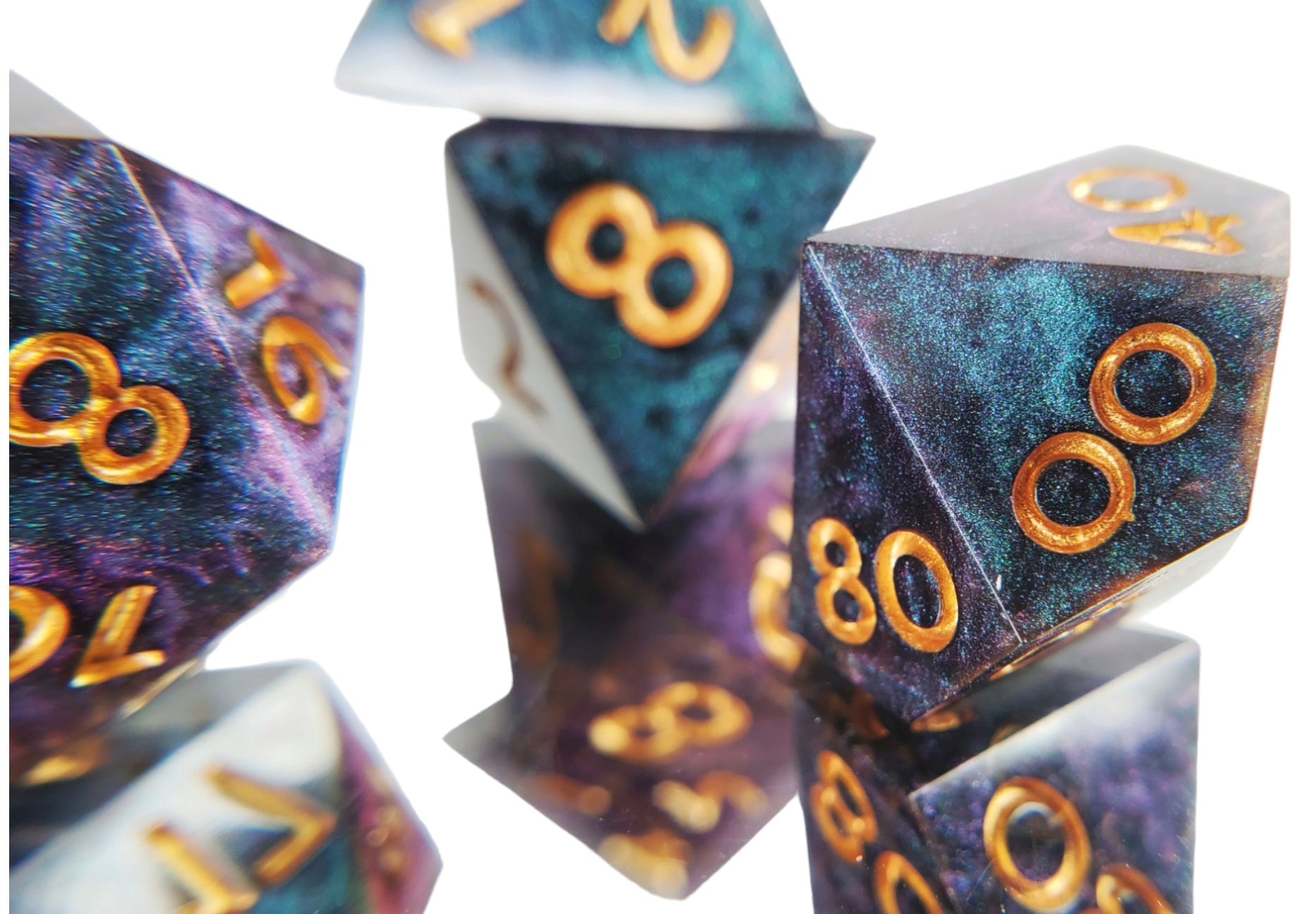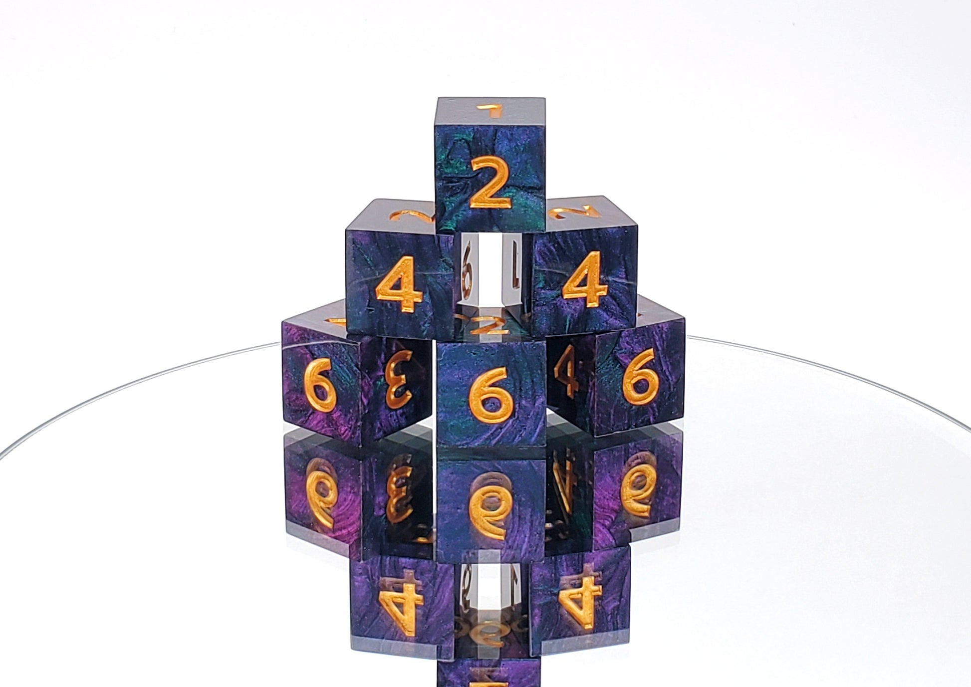 A set of 6 (six) d6 of colorshifting pigments and changes appearance based on the lighting! Inked with gold numbers.