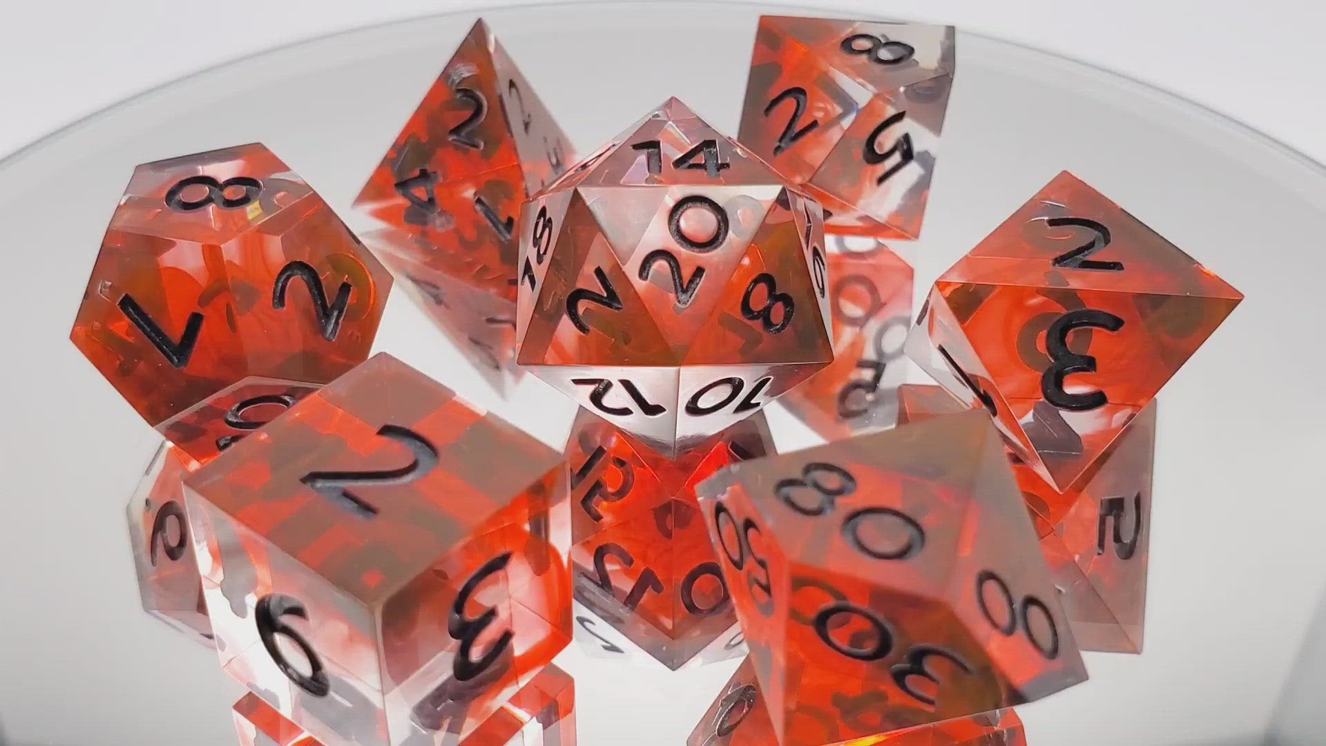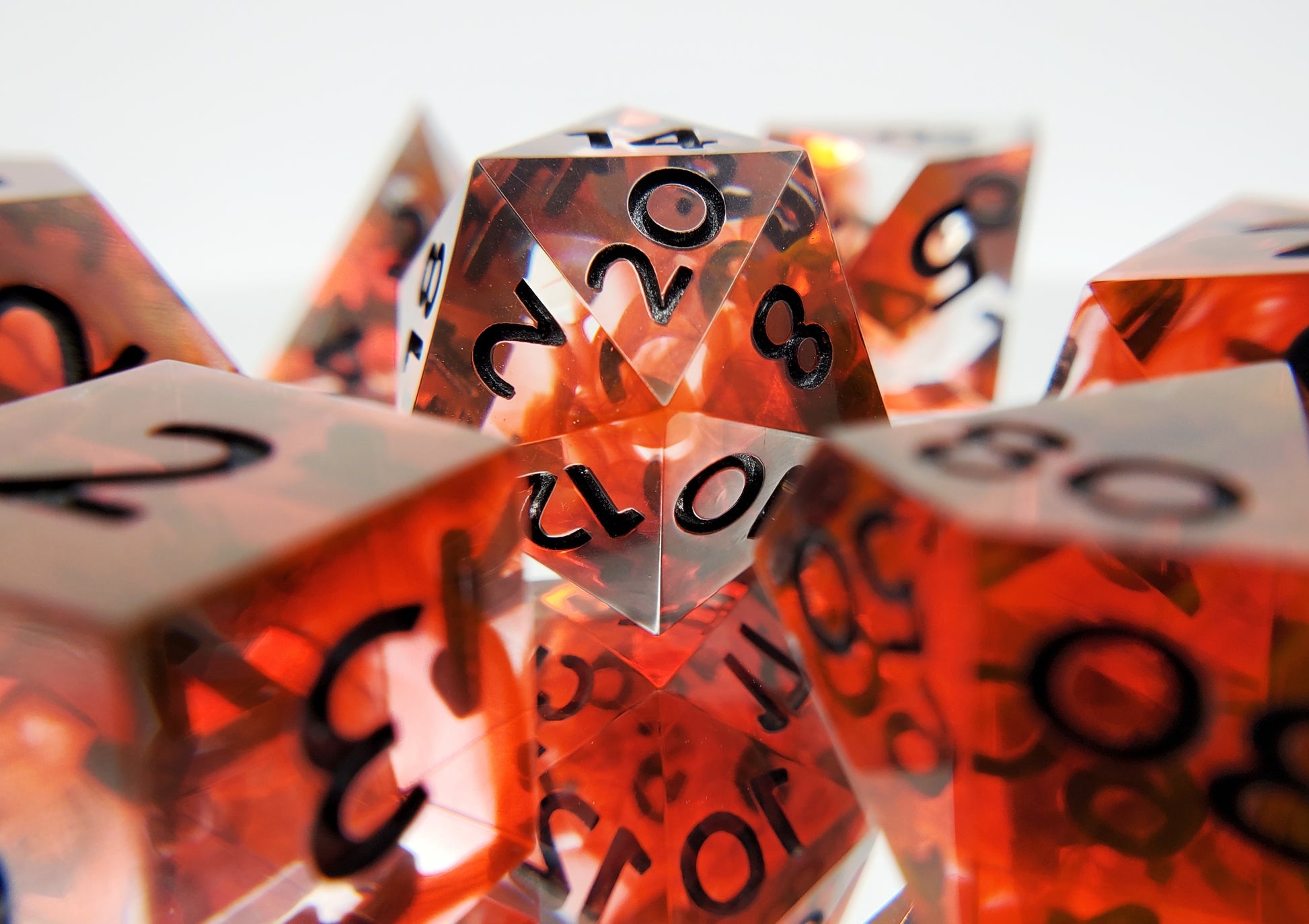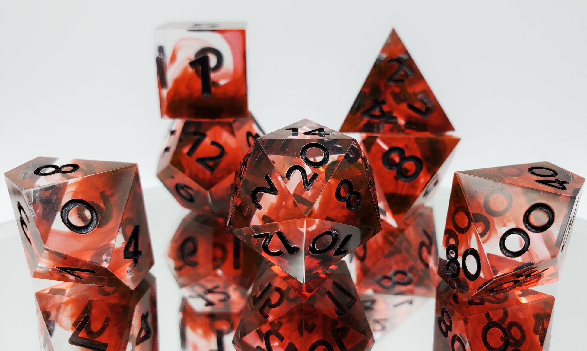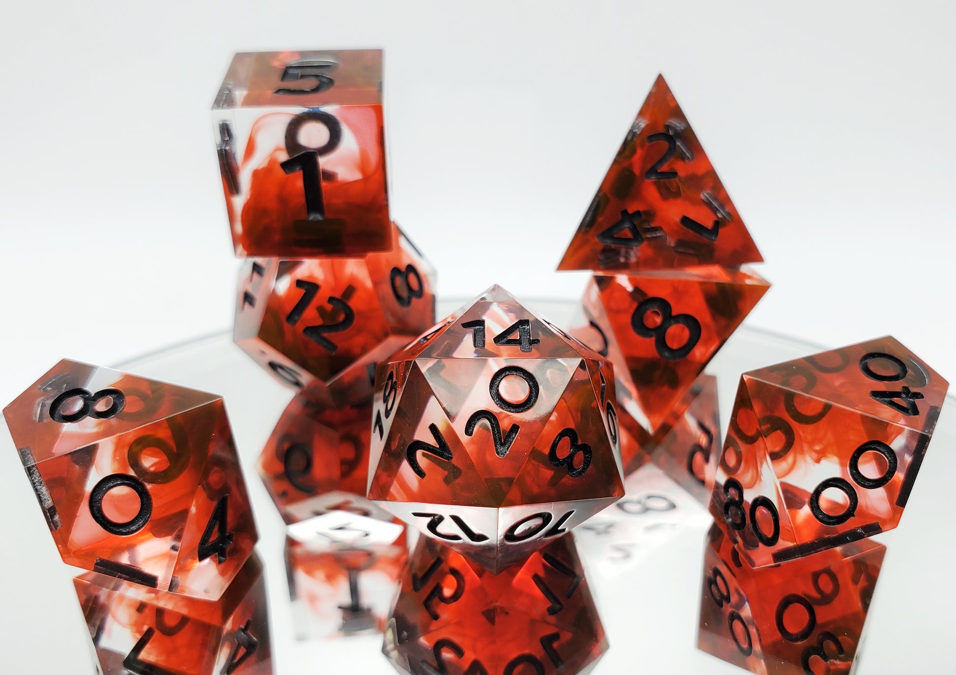 A full standard 7 piece polyhedral set (d20, d12, d%, d10, d8, d6, and d4) of clear dice with red smoke that shifts to orange at the edges in certain kinds of light and metallic black numbering.