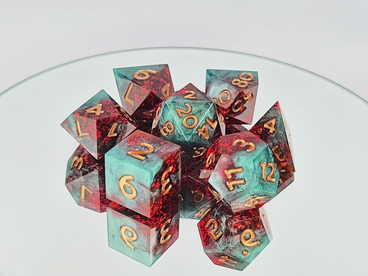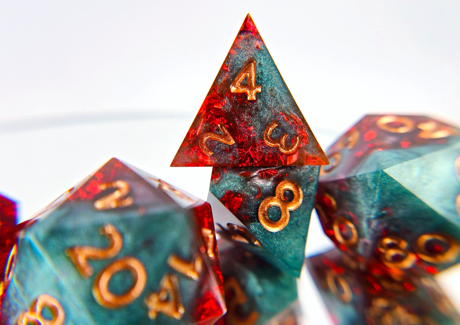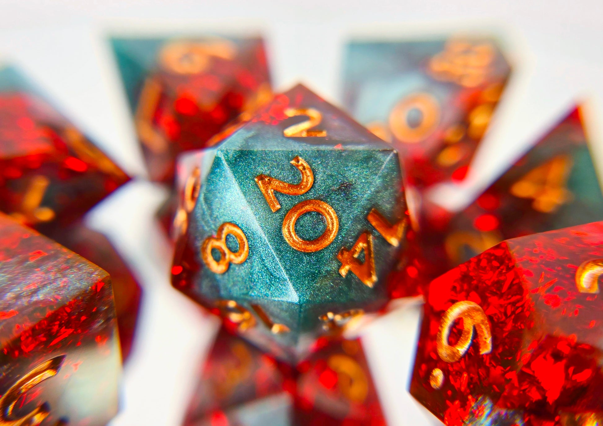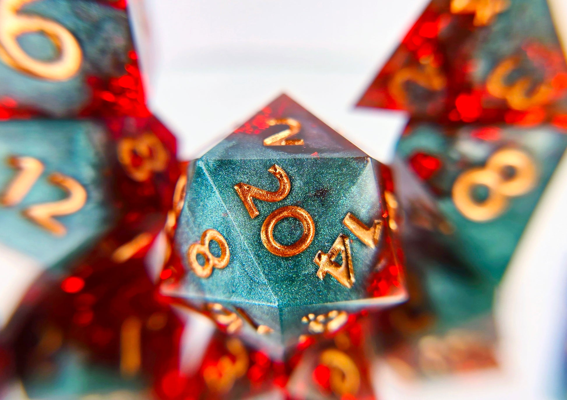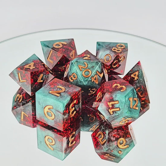 This standard 7 piece polyhedral set (d20, d12, d%, d10, d8, d6, and d4) features shimmery teal green resin swirled with a rather impressive amount of red foil and copper numbers. Is the foil red drink? The chaos tonic? An homage to Kurtulmak? Yes! In addition to the normal choice of a numbered d20 or a dach logo d20, this set comes with your choice of a standard d6 or one with the Sword and Key logo.